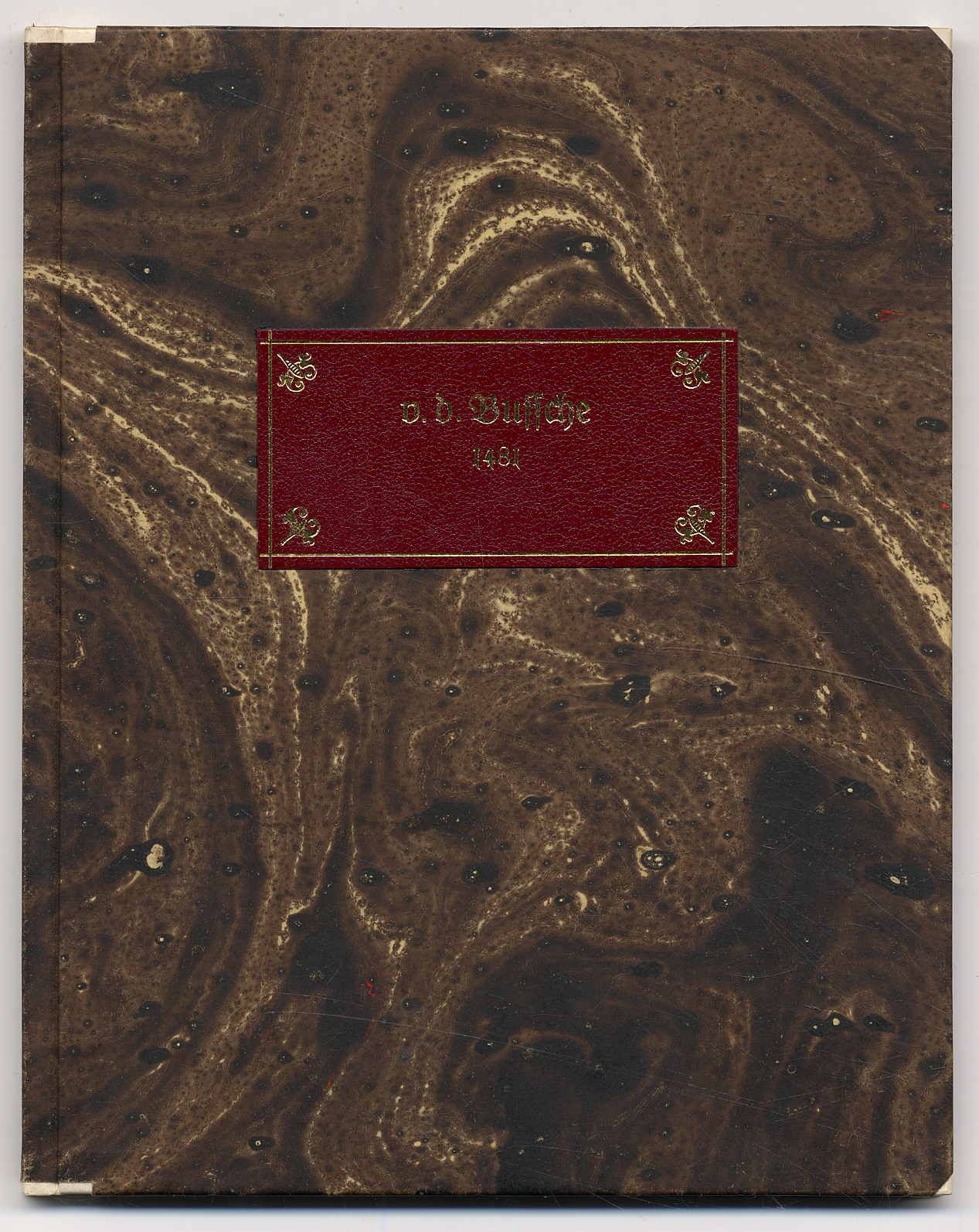 Preusmeyer, Joh[ann]: Zustand der in Gott Verstorbenen / Bey Schmertzlichen / doch fehligen Hintritt Des Weyland Wohlgebohrnen / Gestrengen und Vesten Herrn Liborii von dem Bussche / Auß der Offenbahrung Joh. 14.v.13. Rinteln, druckts Godtfr. C. Wächter, [1681]. Ca. 17,5 x 14,5 cm. 33 Seiten. Mit Zierleisten, einer Titel- und einer Schlussvignette. Moderner Pappband mit geprägtem Deckelschild (mit falscher Jahreszahl 1481). VD17 1:036402E. Leichenpredigt für Liborius von dem Bussche, gehalten in der „Hauß-Kirchen zur Ippenburg den 14. August / Anno 1681“.