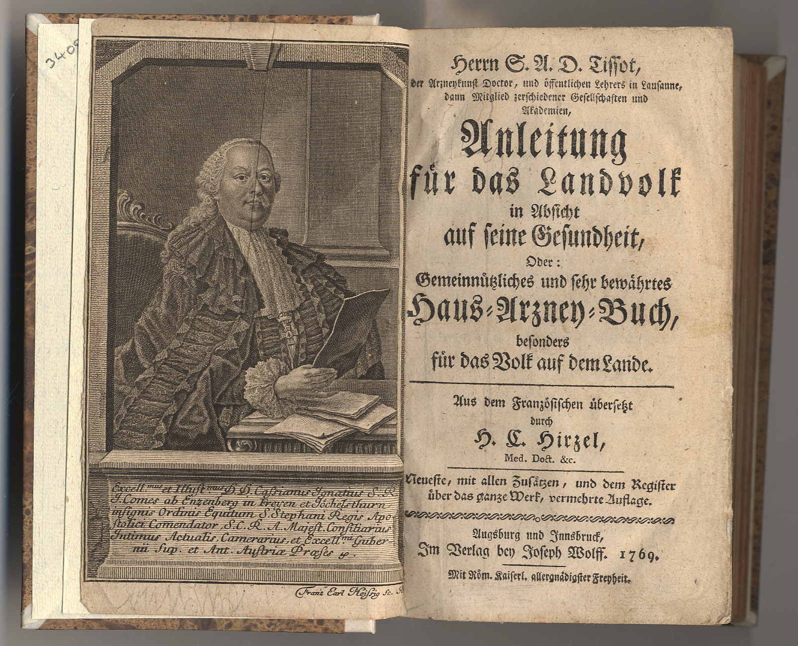 Tissot, S[amuel] A[uguste] D.: 1) Anleitung für das Landvolk in Absicht auf seine Gesundheit, Oder: Gemeinnützliches und sehr bewährtes Haus-Arzney-Buch, besonders für das Volk auf dem Lande. Aus dem Französischen übersetzt durch H.E. Hirzel. Neueste, mit allen Zusätzen, und dem Register über das ganze Werk, vermehrte Auflage. Augsburg und Innsbruck, Joseph Wolff, 1769. (26) S., 652 S., (24) Seiten. Mit einem Kupfer-Porträt als Frontispiz sowie einer Wappenabbildung. Angebunden: 2) ders.: Von den Krankheiten vornehmer und reicher Personen Höfen und in grossen Städten. Neue verbesserte Ausgabe. Frankfurt und Leipzig, Felßeckerische Buchhandlung, 1770. Ca. 17,5 x 10,5 cm. (16) S., 191 Seiten. Moderner Pappband mit geprägtem Rückenschild. Widmungsblatt mit schwacher Bleistiftkritzelei. Seiten etwas gebräunt. Beliebtes Standardwerk, hier zusätzlich mit der Veröffentlichung zu den Krankheiten vornehmer und reicher Personen: „Wenn die Gesundheit schon blos durch das viele oder starke Nachdenken sich abnutzet, so ist leicht zu begreifen, wie schädlich ihr die Leidenschaften seyn müssen …“. Tissot (1728-1797) gehörte zu den bekanntesten Medizinern seiner Zeit.