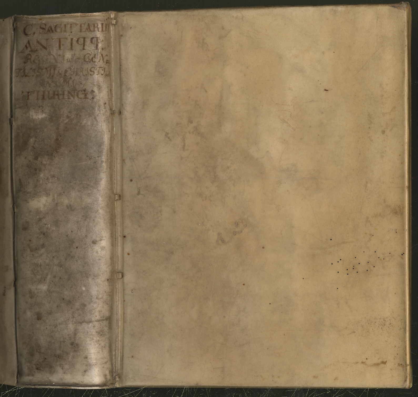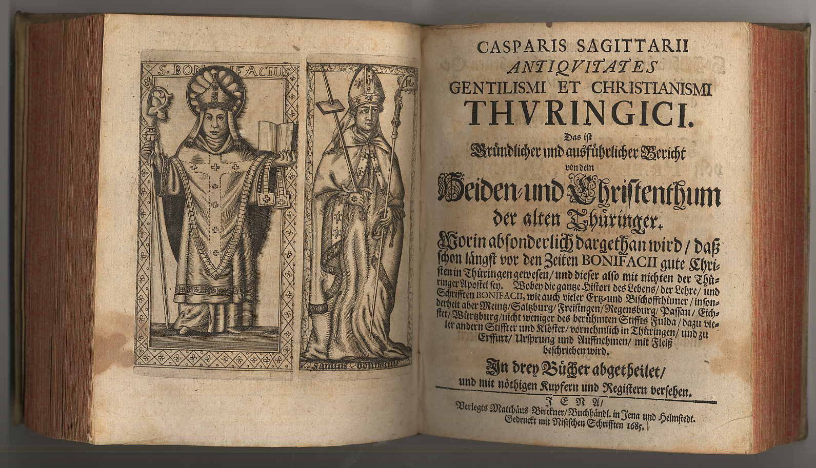 Thüringen – Sagittarius, Caspar: 1) Casparis Sagittarii P.P. Antiquitates Regni Thuringici. Das ist: Gründlicher / und Ausführlicher Bericht von dem Nahmen und alten Zustande Des Thüringer Landes: insonderheit aber von dem alten Thüringischen Königreich Desselben Königen / und dero Thaten/ wie auch endlich dessen Zerstörung / und Theilung unter die Francken und Sachsen: nicht weniger auch von dem Nahmen und Erbauung der Stadt Erffurt Wobey zuletzt noch zufinden / die sonst noch nie in Druck heraus gegebene Schrifft des berühmten Manns Petri Albini Specimen Historiae Novae Thuringorum. J (16) S., 378 S. (recte 368), (8) Seiten, mit einem Textholzschnitt und einigen Zierleisten. 2) Casparis Sagittarii Antiquitates Gentilismi Et Christianismi Thuringici. Das ist Gründlicher und ausführlicher Bericht von dem Heiden- und Christenthum der alten Thüringer : Worin absonderlich dargethan wird / daß schon längst vor den Zeiten Bonifacii gute Christen in Thüringen gewesen / und dieser also mit nichten der Thüringer Apostel sey. Wobey die gantze Histori des Lebens / der Lehre / und Schrifften Bonifacii, wie auch vieler Ertz- und Bischoffthümer / insonderheit aber Meintz / Saltzburg / Freisingen / Regensburg / Passau / Eichstet / Würtzburg / nicht weniger des berühmten Stiffts Fulda / dazu vieler andern Stiffter und Klöster / vornehmlich in Thüringen / und zu Erffurt / Ursprung und Auffnehmen / mit Fleiß beschrieben wird; In drey Bücher [in einem Band] abgetheilet / und mit nöthigen Kupfern und Registern versehen. (16) Seiten, 354 S., (14) Seiten, mit gestochenem Frontispiz und einigen Textholzschnitten. Jena, Matthäus Birckner, Gedruckt mit Nißischen Schriften, 1685. Ca. 20 x 17 cm. Pergamenteinband der Zeit Zu 1: VD17 12:116186S. Titelblatt rückseits mit Namenszug, fehlerhafte Paginierung.