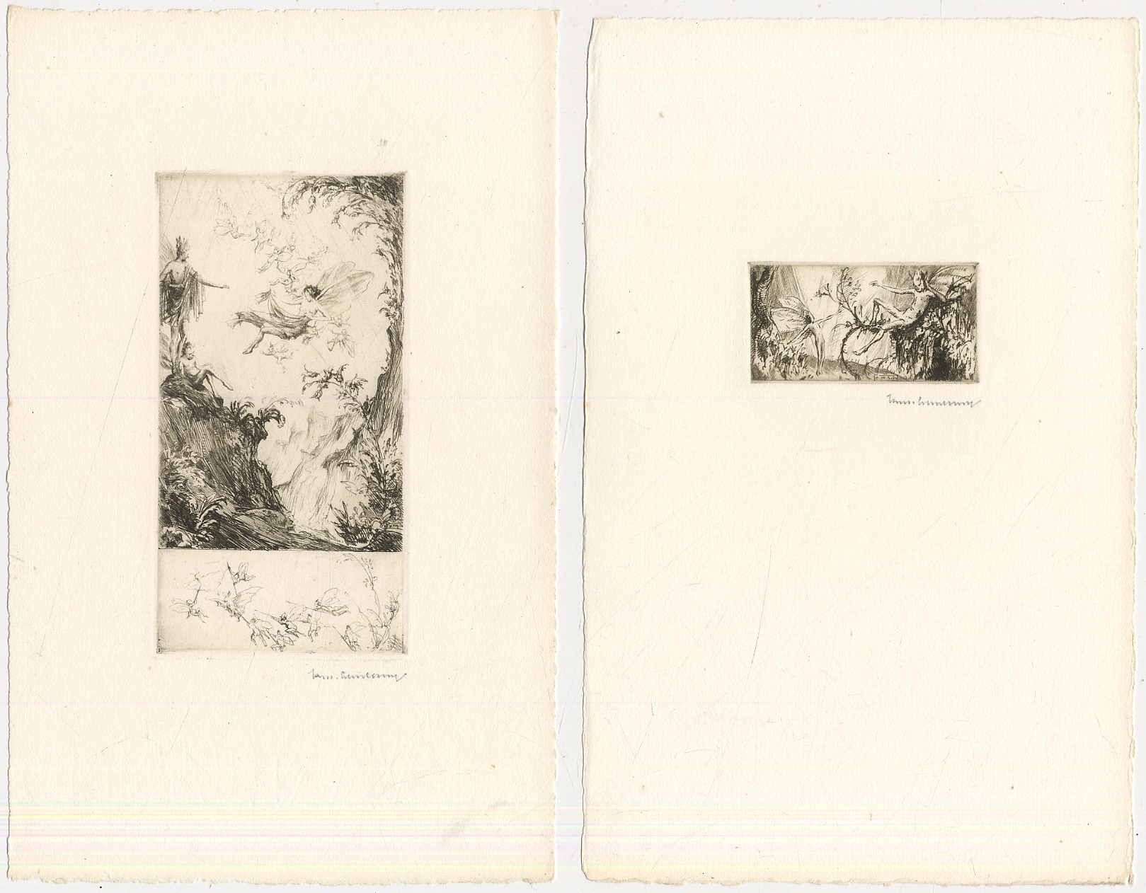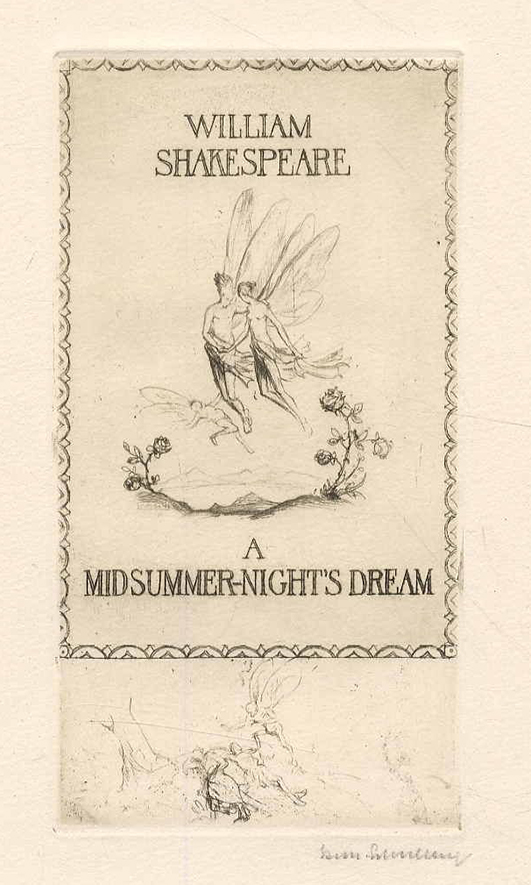 Shakespeare, William: A Midsummer-Night’s Dream. Suite mit 12 signierten Originalradierungen (teils mit Remarquen) von Karl Max Schultheiß. [Hellerau, Avalun und London, J. & F. Bumpus, 1926]. Ca. 27 x 17,5 cm. 12 (incl. Titelblatt) signierte Originalradierungen von Karl Max Schultheiß. Original-Halbpergamentmappe. Extrasuite zu der in nur 12 Exemplaren erschienen Vorzugsausgabe der „Prinz Heinrich XXXIX. Reuss Edition of the Works of William Shakespeare“, Volume I. gehörende Mappe mit 12 von Schultheiß (1865-1961?) signierten Radierungen (die nicht im Buch zum Abdruck gelangten), teils mit Remarquen. Mappe etwas berieben und leicht angestaubt. Mappe, Innendeckel, Titelblatt und Inhaltsverzeichnis stockfleckig. Innendeckel mit Besitzvermerk. Radierungen sauber und gut, mit breitem weißen Rand. Sehr selten.