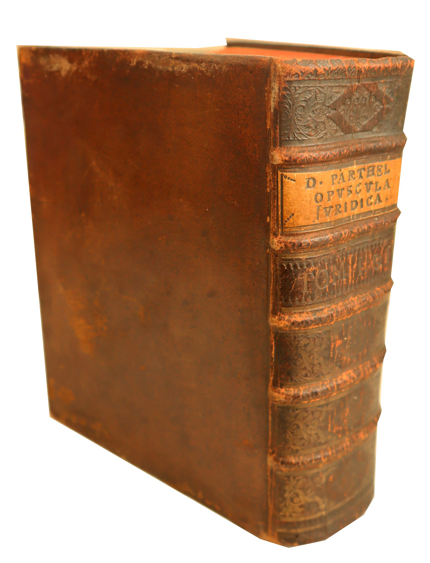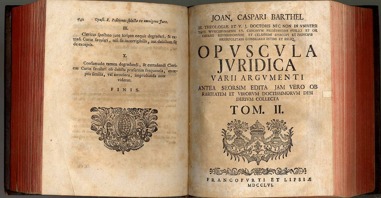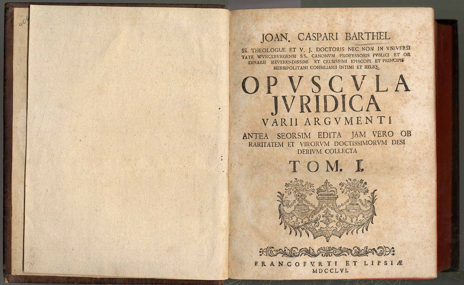 Barthel, Johann Kaspar: Opuscula Juridica varii argumenti antea seorsim edita jam vero ob raritatem et virorum doctissimorum desi derium collecta. 2 Bände in einem Ban.d Frankfurt und Leipzig, 1756. Ca. 21,5 x 16,5 cm. (10) S., 640 Seiten; (2) S., 856 Seiten, (30) Seiten Register. Mit einigen Holzstichvignetten. Ledereinband der Zeit, mit geprägtem Rückentitel. Bibliotheksstempel und Ausgeschiedenstempel auf Innendeckel. Seiten teils etwas stockfleckig. Barthel (1697-1771) war ein bedeutender katholischer Theologe und Kirchenrechtler, der als Professor des Kanonischen Rechts in Würzburg durch seine historisch-pragmatische Methode eine neue Schule unter den deutschen Kanonisten begründete.