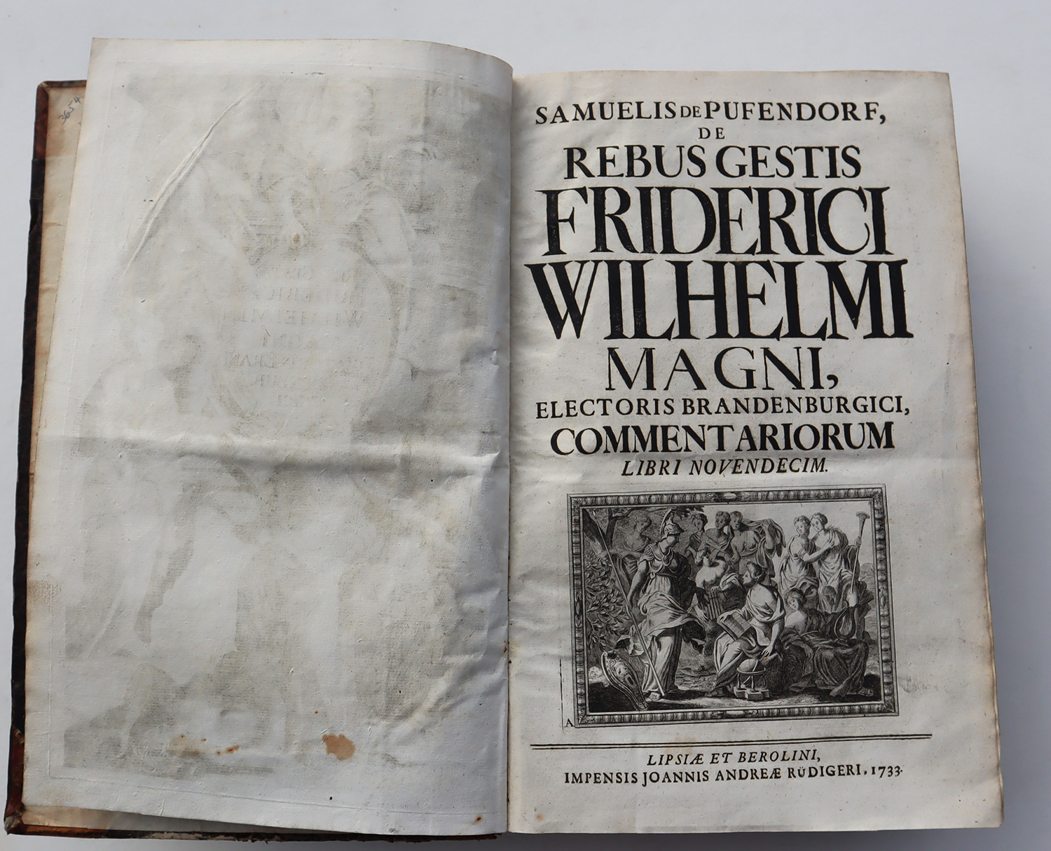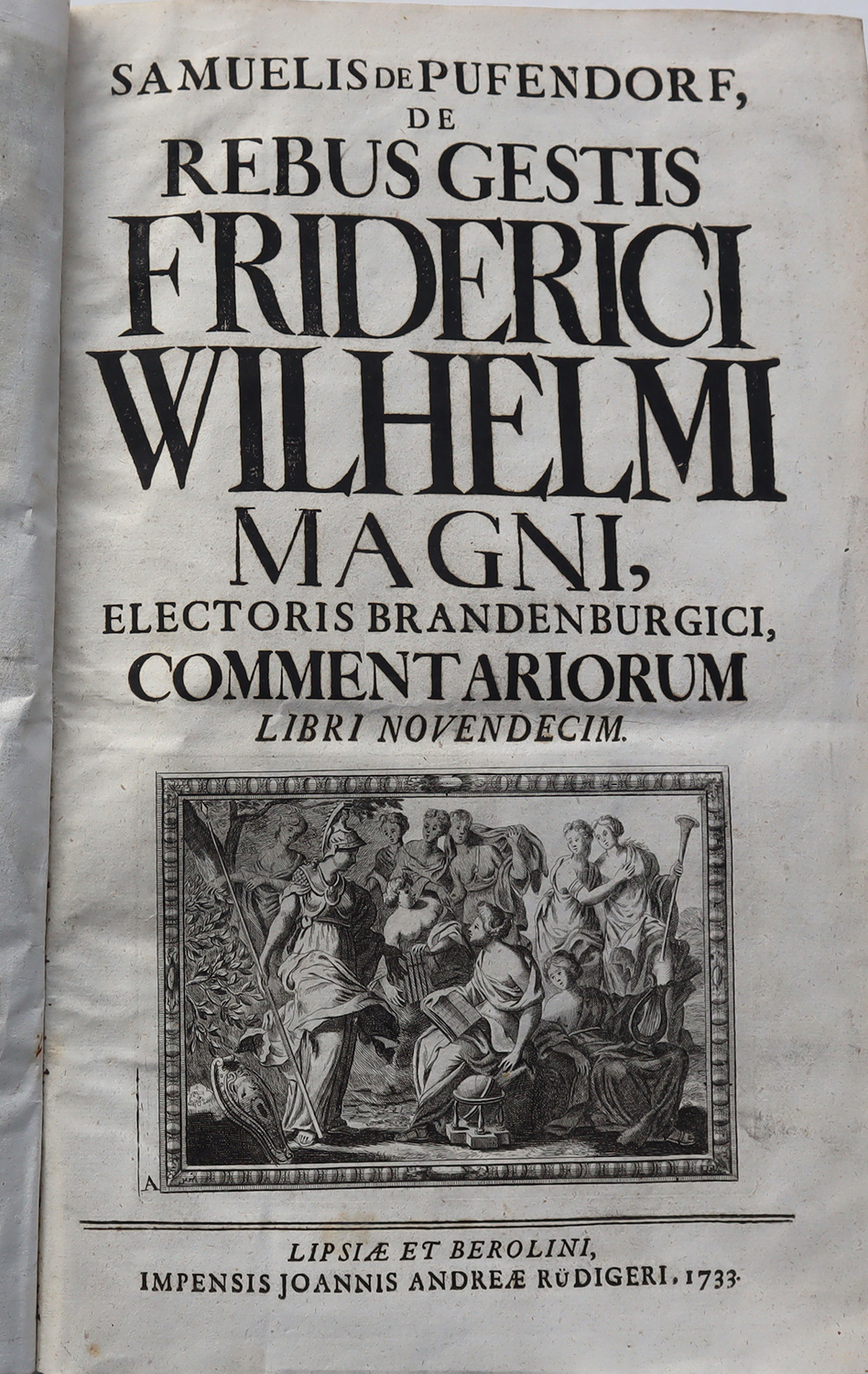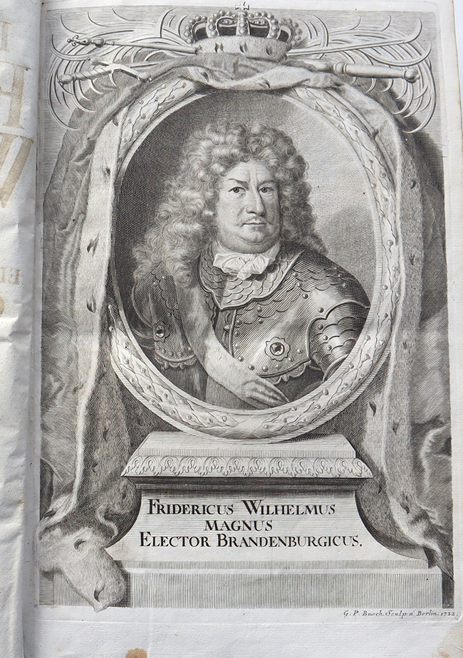 Pufendorf, Samuel, de: De rebus gestis Friderici Wilhelmi Magni, electoris Brandenburgici, commentariorum, libri novendecim. 2 Teile n einem Band Leipzig und Berlin, Johann Andrea Rüdiger, 1733. Ca. 34,5 x 23,5 cm. (16) S., 1.314 Seiten, (82) Seiten Register. Mit gestochenem Kupfer-Frontispiz, gestochener Titelvignette, gestochenem Kupfer-Porträt sowie Titelvignetten und Schmuckinitialen. Etwas späterer Halbledereinband. Einband etwas berieben, Kanten und Rücken bestoßen. Vorsätze Anfang 20. Jhdt. erneuert, mit Besitzvermerk. Frontispiz und Porträtkupfer gestochen von G. P. Busch. Letzte Ausgabe der grundlegenden Biographie des Großen Kurfürsten, im Auftrag Friedrichs I. verfaßt. „Das Werk, das gleich bei seinem Erscheinen die abweichendste Beurtheilung erfahren hat, in neuerer Zeit aber allgemein und mit Recht als die bedeutendste historische Arbeit Pufendorf’s angesehen wird, beschränkt sich … auf die Darstellung der auswärtigen Politik …“ (H. Breßlau in ADB, Band 26 S. 701 ff). Samuel Freiherr von Pufendorf (1632 – 1694, deutscher Philosoph und Jurist), gilt als wichtiger Wegbereit des säkularisierten Naturrechts. Auch in der Biographie Friedrich Wilhelms wird die von der Aufklärung beeinflusste Grundhaltung Pufendorfs deutlich sichtbar. Text in Latein. Gutes Exemplar.