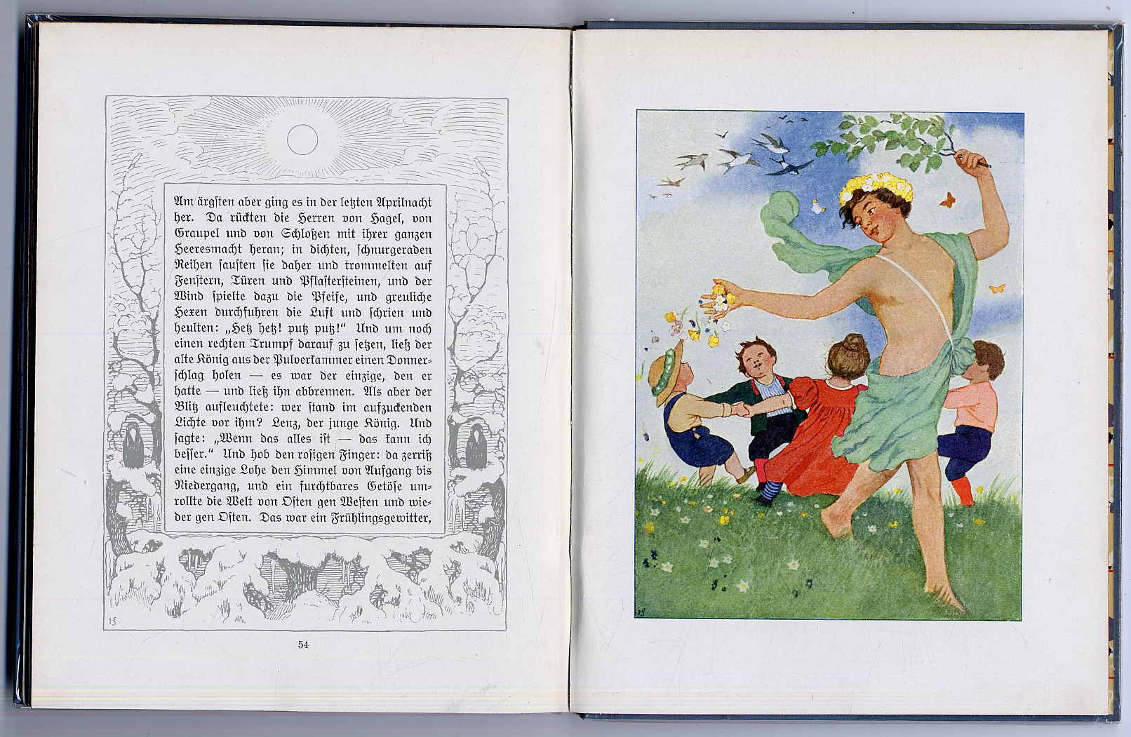 Ernst, Otto (d.i. Otto Ernst Schmidt): Der Kinder Schlaraffenland. Ein Märchen vom König Winter. Ein lustiger Schwank für Jung und Alt. Mainz, Jos. Scholz Vlg., [1910]. Ca. 23 x 18 cm. 55 S. Mit 10 farbigen Tafeln und Buchschmuck von Hans Schroedter. Farbig illustr. Orig.-Leinenband. Klotz 1313/13; Ries 869.14. Inventarvermerk auf Titelblatt. Zwei Märchen „Der Kinder Schlaraffenland“ und „Ein Märchen vom König Winter“ in einem Band.
