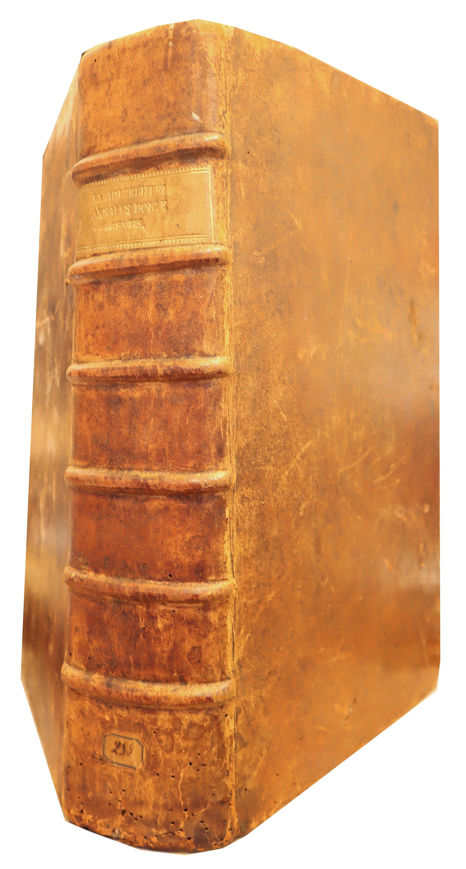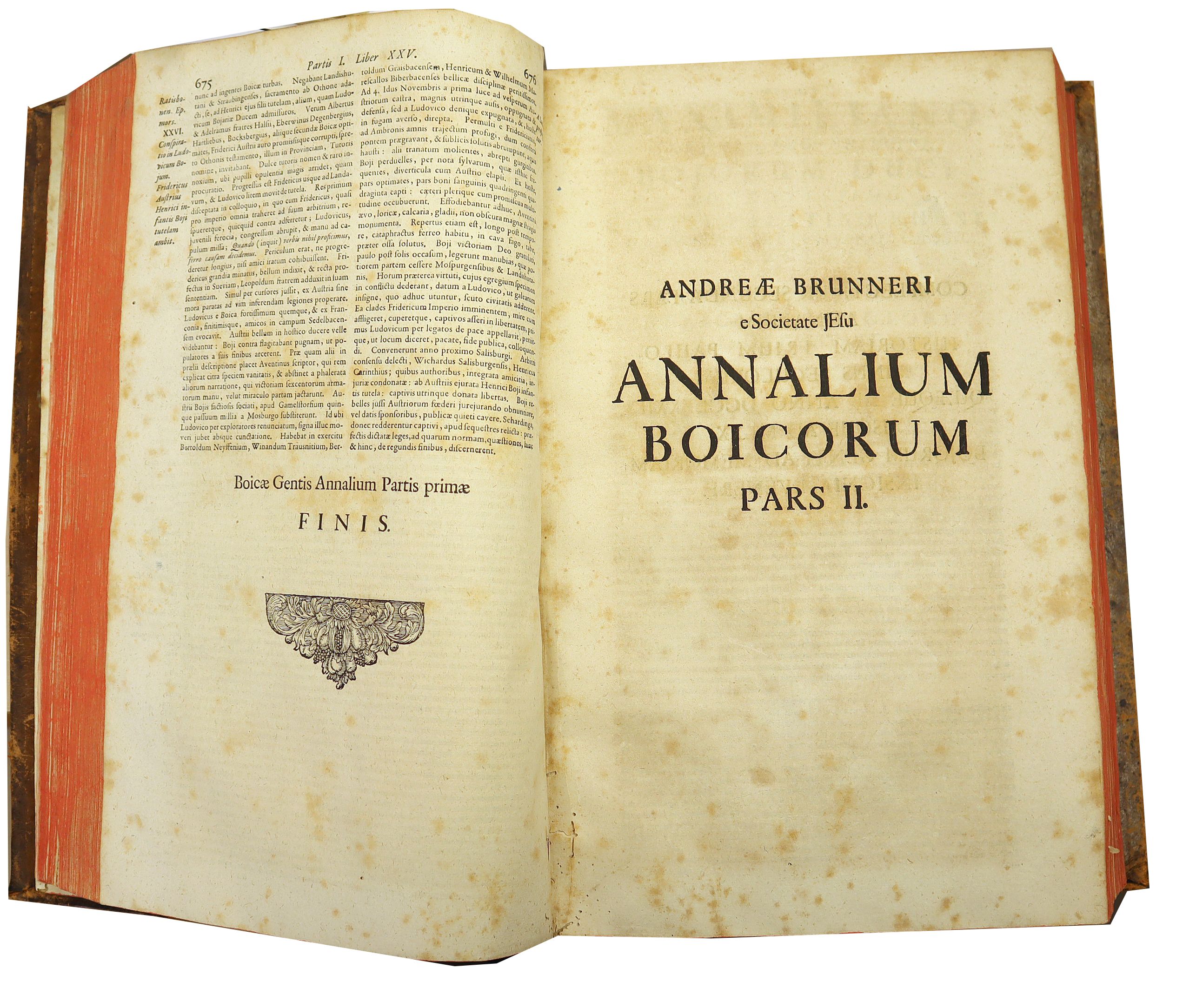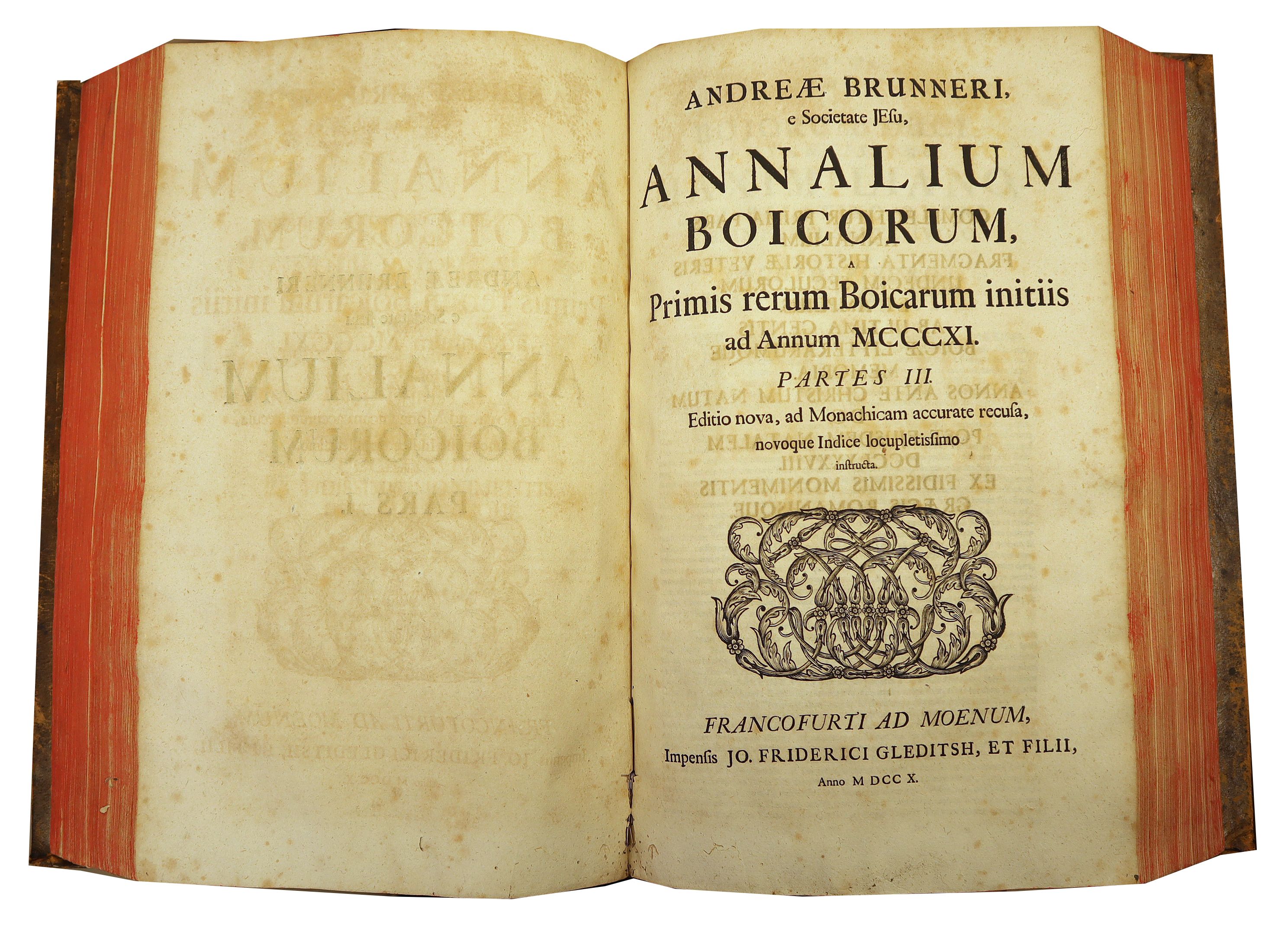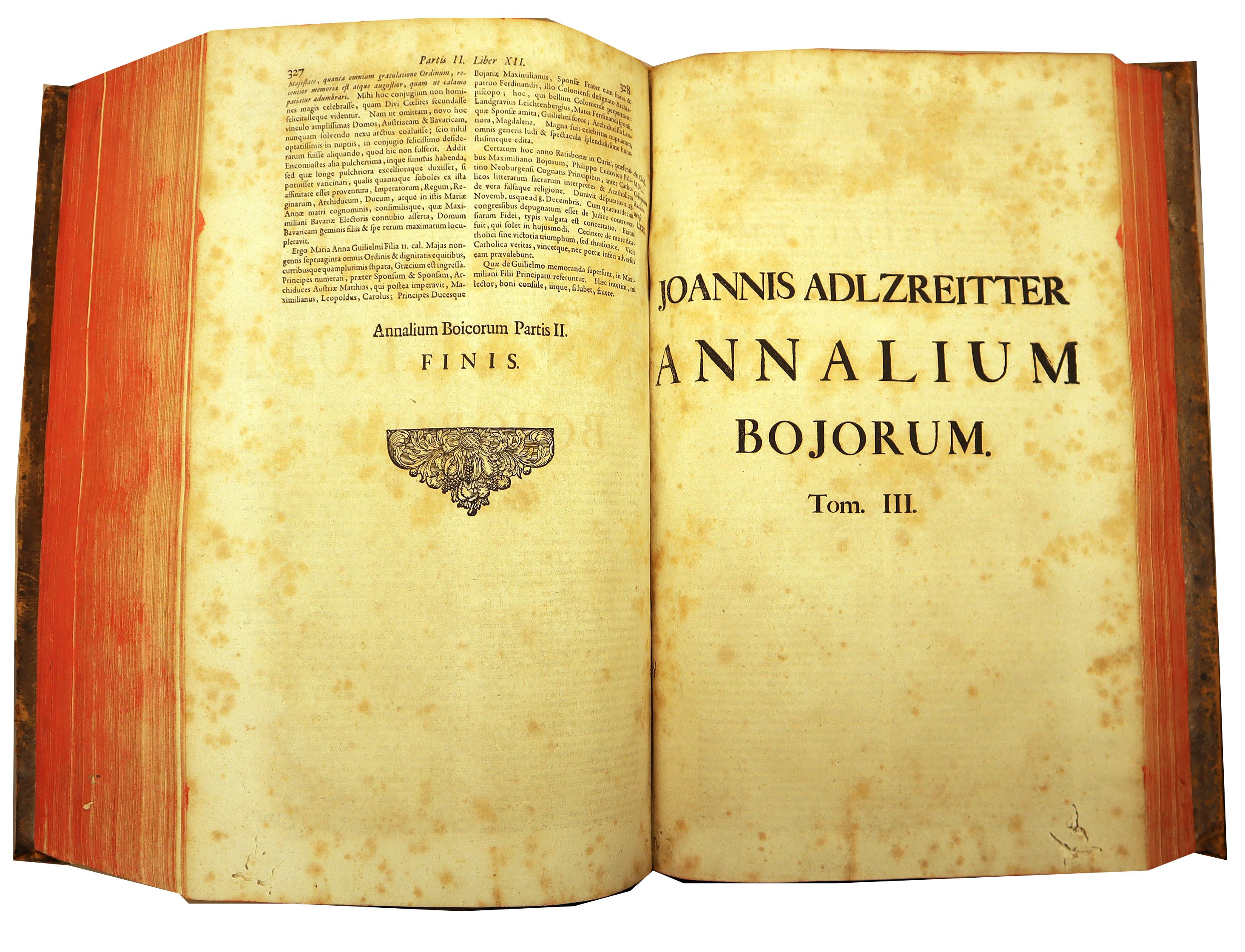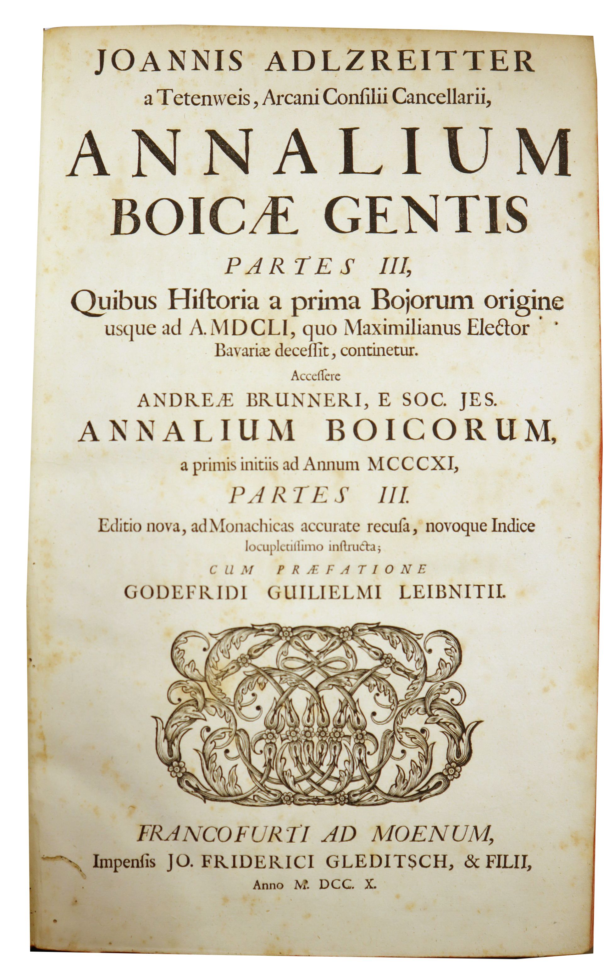 Adlzreitter v. Tettenweis, J[oannis]. [und Johannes Vervaux]: Annalium Boicae gentis partes III, quibus historia a prima Bojorum origine usque ad A.MDCLI, quo Maximilianus Elector Bavariae decessit, continetur. Accessere Andreae Brunneri, e Soc. Jes. Annalium Boicorum, a primis initiis ad Annum MCCCXI, partes III. Editio nova, ad Monachicas accurate recusa, novoque indice locupletissimo instructa, cum praefatione Godefridi Guilielmi Leibnitii. Frankfurt, Jo. Friedrich Gleditsch, 1710. Ca. 38,5 x 24,5 cm. (12) Seiten, 676 Spalten, 248 Spalten, 246 Spalten (springt hier von Spaltenzählung 160 auf Seitenzählung 161, ab Seite 176 dann wieder Spaltenzählung fortlaufend mit Spalte 177), (11) Seiten, 2 weiße Seiten, (8) Seiten, 188 Spalten, 328 Spalten, (2) Seiten, 592 Spalten, (46) Seiten. Einband leicht beschabt. Blätter teils mit kleineren Wurmgängen, meist im unbedruckten Bereich. Teils gebräunt, teils stockfleckig, jedoch gutes Exemplar. Angeblicher Verfasser des Werkes ist Johann Adlzreiter von Tettenweis, wirklicher Verfasser ist Johannes Vervaux. „Adlzreiter’s Name ist besonders bekannt durch die Jahrbücher des baierischen Volkes, die im Jahre seines Todes unter seinem Namen erschienen, eine so bedeutende Leistung, daß Leibnitz im J. 1710 eine neue Ausgabe veranstaltete. A. hat sich aber an dem Werke nur dadurch betheiligt, daß er als Archivar das Quellenmaterial lieferte; Verfasser ist der Jesuit Johann Verveaux, dessen Name nach dem Willen der Oberen verschwiegen werden sollte.“ (ADB I, 88).