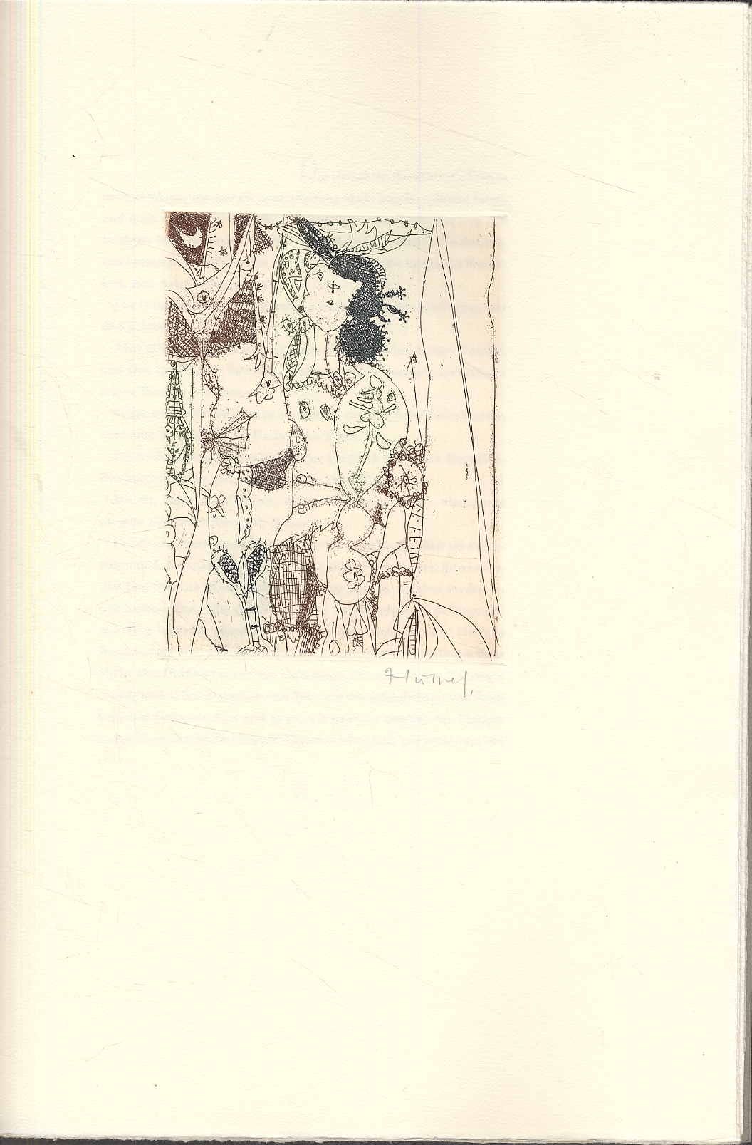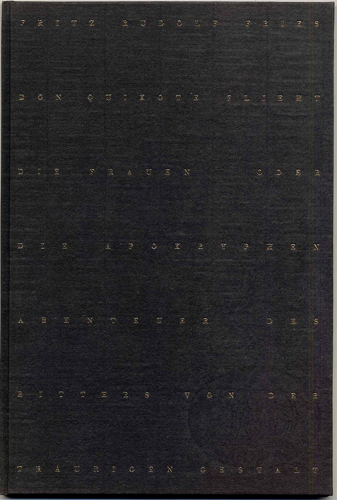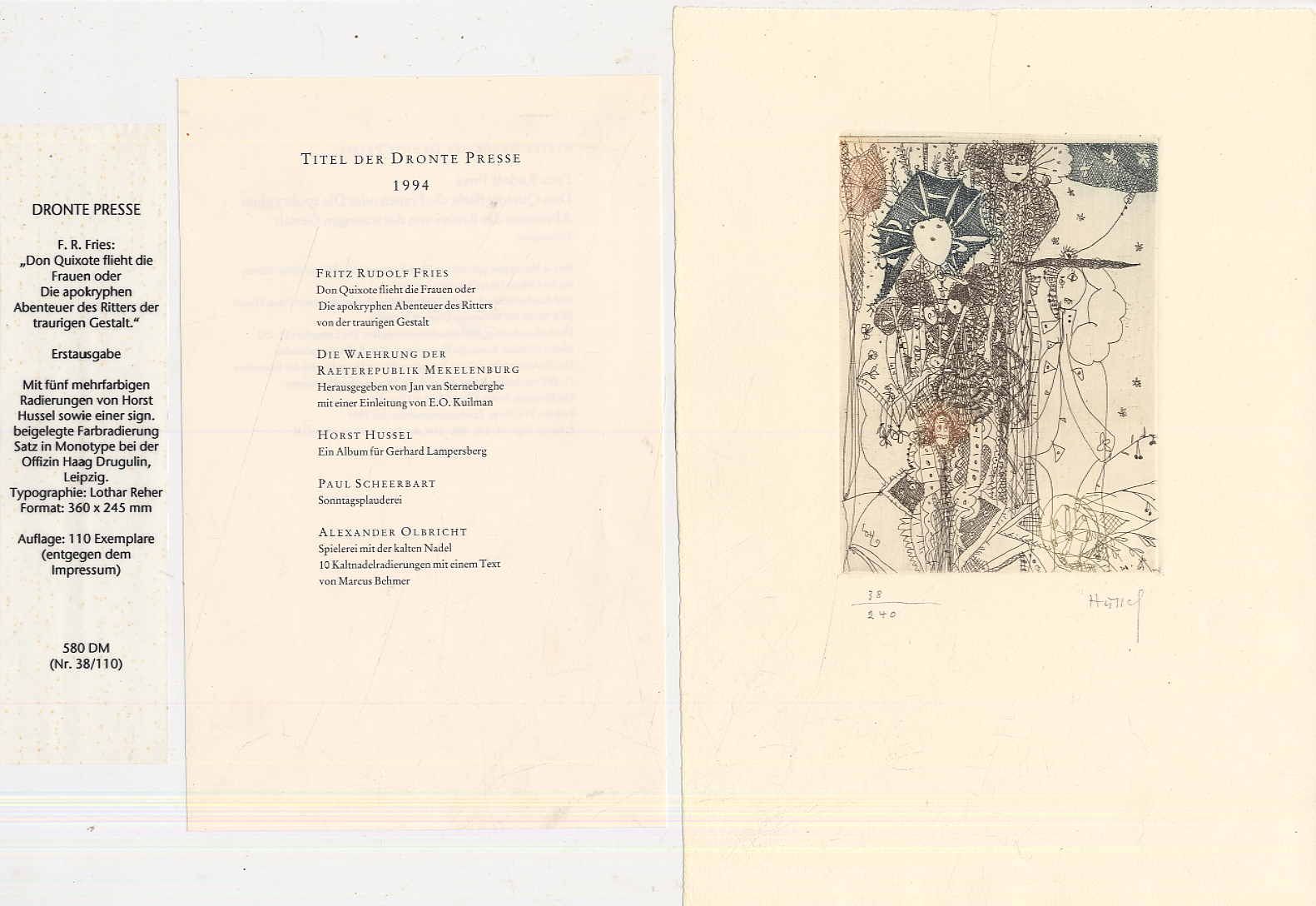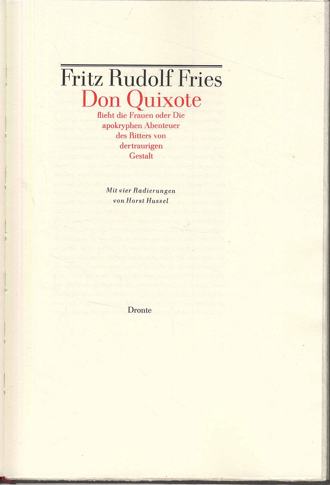 Fries, Fritz Rudolf: Don Quixote flieht die Frauen oder die apokryphen Abenteuer des Ritters von der traurigen Gestalt. Berlin, Dronte Presse, 1994. Ca. 36 x 24,5 cm. 43 Seiten. Mit 4 mehrfarbigen Radierungen von Horst Hussel sowie einer signierten beigelegten Farbradierung. Grauer Originalleinband mit Goldprägung. Exemplar 38/110. Erster Druck der Dronte Presse. Der Druckvermerk nennt eine Auflage von 250, diese wurde jedoch durch einen vom Verlag beigefügten kleinen Berichtigungszettel auf 110 Exemplare korrigiert. Gesetzt aus der Didot, gedruckt in der Offizin Haag-Drugulin, Leipzig, auf Hahnemühle-Bütten. Die Dronte Presse wurde von den beiden Graphikern und Buchgestaltern Lothar Reher und Horst Hussel 1994 gegründet. Tadellos erhalten, mit Korrekturzettel (der seinerseits einen Fehler in den Angaben zu den Farbradierungen enthält).