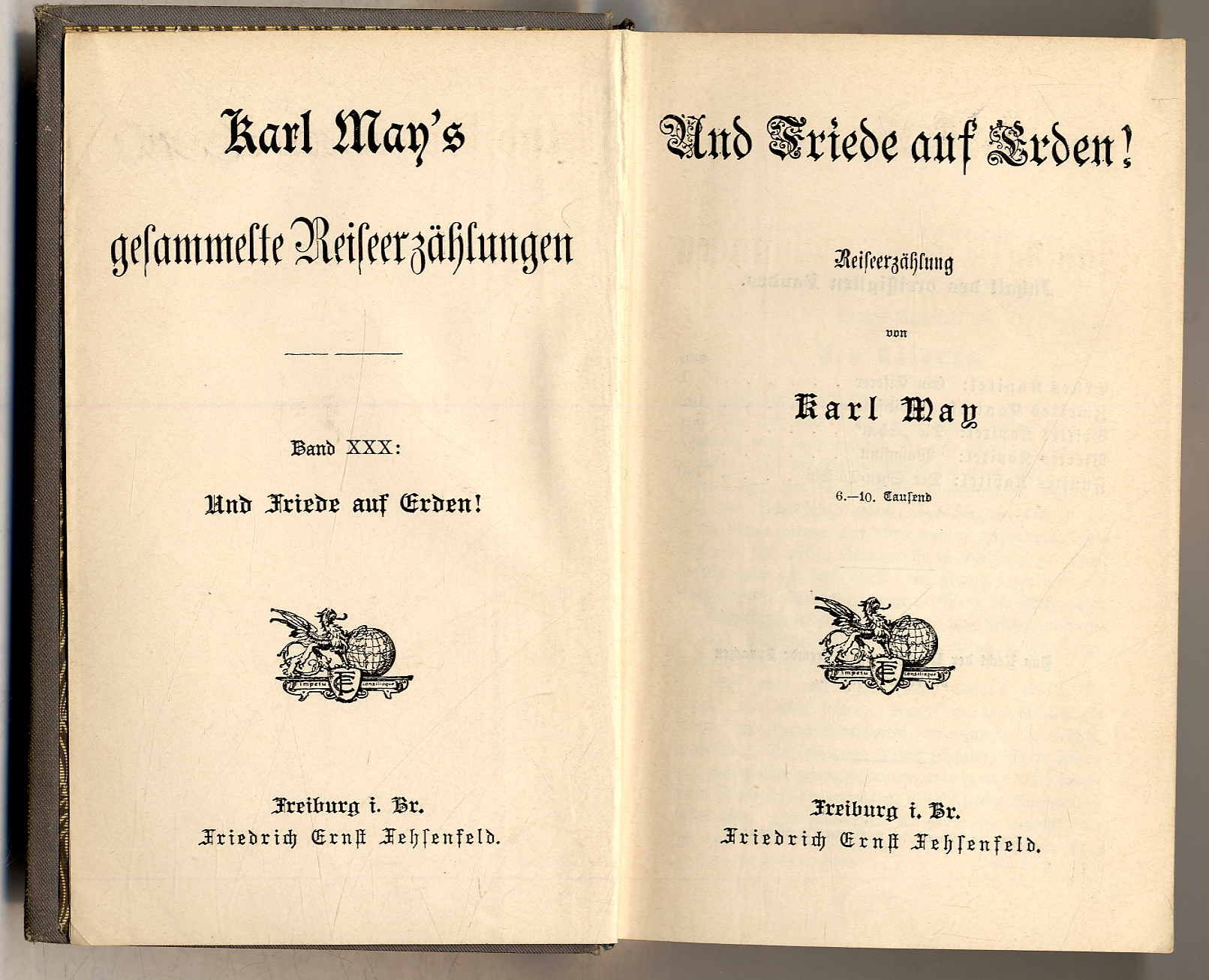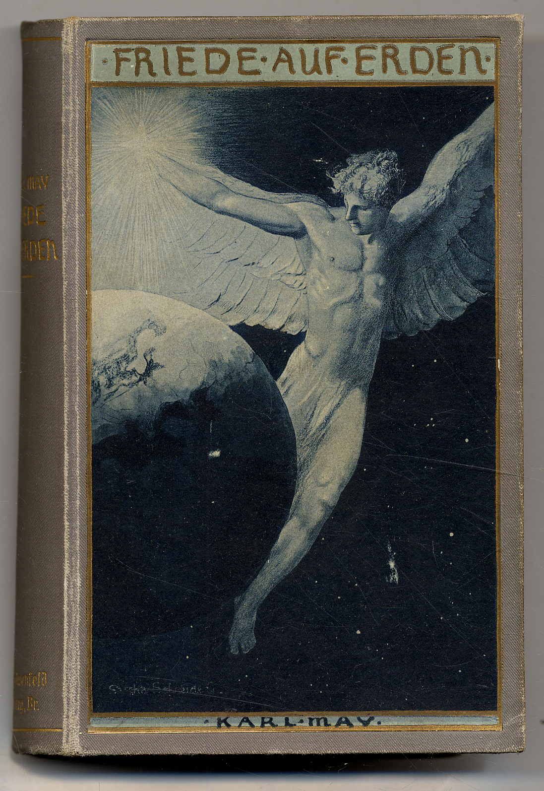 May, Karl: Und Friede auf Erden! Reiseerzählung. 6.-10. Tausend. Freiburg, Friedrich Ernst Fehsenfeld, [1904]. Ca. 17,5 x 11,5 cm. (4) S., 660 Seiten. Farbig illustr. Orig.-Halbleinenband mit Deckelillustration von Sascha Schneider. Aus der Reihe: Karl May’s gesammelte Reiseerzählungen, Band XXX. Plaul 373.2, DB 85. Vorsatz am Falz etwas gelockert. Kanten leicht berieben. Minimal schiefgelesen.