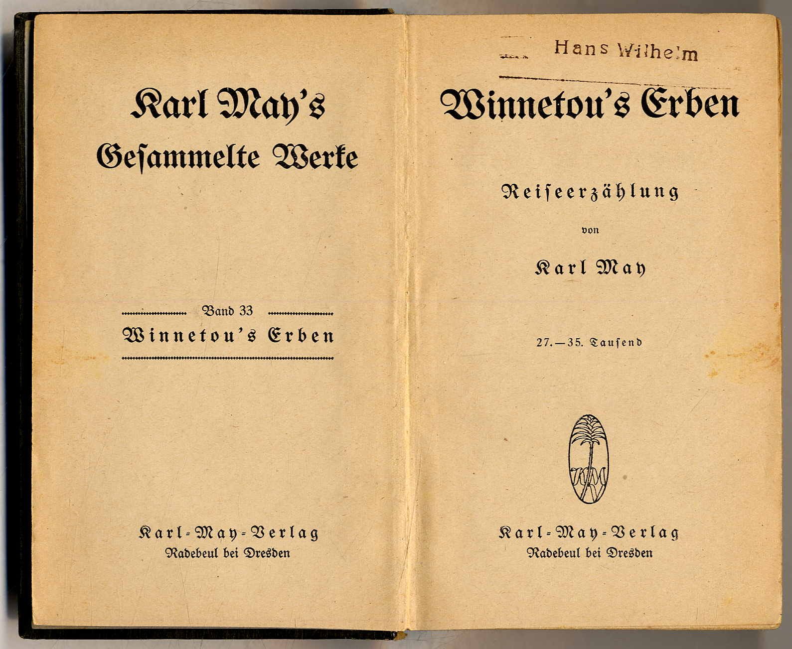 May, Karl: Winnetou’s Erben. Reiseerzählung. 27.-35. Tausend. Radebeul, Karl-May-Verlag, ca. 1919. Ca. 17,5 x 11 cm (4) S., 623 Seiten. Grüner Originalleinenband mit Rückengold- und -schwarzprägung mit Deckelbild von Sascha Schneider in Prägedruck/P „In hoc signo vinces?!“ Aus der Reihe: Karl May’s gesammelte Werke, Band 33. Hermesmeier/Schmatz GW 33.5, DB 65b, Rücken V2. Erschien ursprünglich unter dem Titel „Winnetou 4. Band“ bei Fehsenfeld. Alle nachfolgenden Titel erschienen mit einem neuen Titel, weil der alte falsche Erwartungen weckte und sich die Beschwerden enttäuschter Leser mehrten. (Hermesmeier/Schmatz zu GW 33). Buchblock leicht gelockert. Kapitale etwas bestoßen. Besitzstempel auf Vorsatz und Titelblatt.