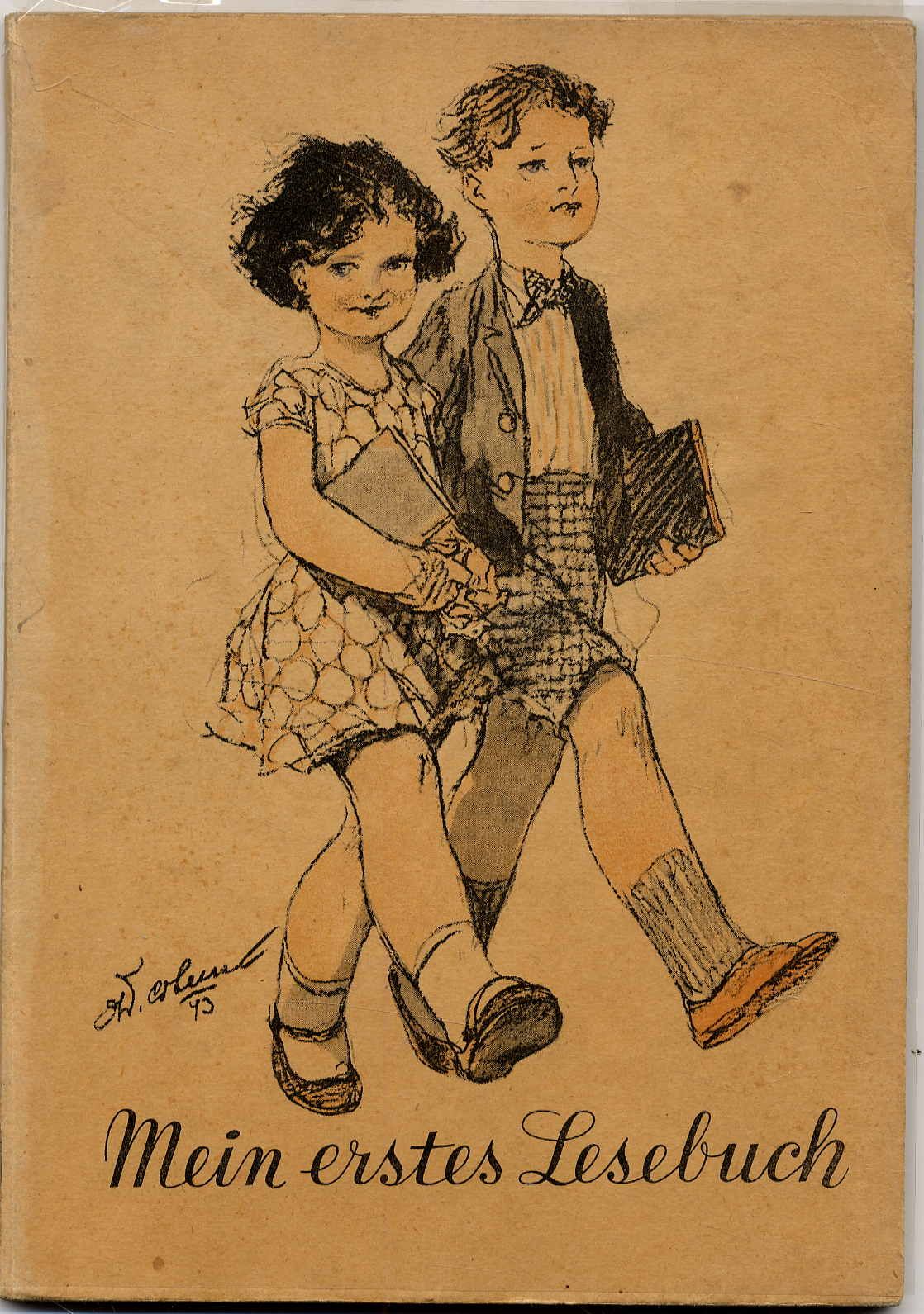 Mein erstes Lesebuch. Lehrbuch für den zweiten aufsteigenden Jahrgang der tschechischen Volksschulen. Schulverlagsanstalt für Böhmen und Mähren, 1943. Ca. 21 x 14,5 cm. 96 Seiten. Mit farbigen Bildern von O. Cihelka. Farbig illustr. Orig.-Halbleinenband. Die Fibel beginnt mit „Bilder zu den Selbstlauten“ und „Bilder zu den Mitlauten“. Schwungvoll illustrierte Fibel. Lesebuch für das von den Deutschen errichtete Protektorat Böhmen und Mähren in der Tschechoslowakei mit nur geringem politischen Bezug (″Der Führer hat Geburtstag“). Die Fotografie Hitler mit einem Kind auf den Obersalzberg wurde entfernt, Sonst gutes Exemplar der seltenen Ausgabe. Auf der Rückseite des Titelblattes der Vermerk „Dieses Buch enthält einen Gutschein“. Dieser war üblicherweise eingeklebt und wurde – wie auch bei unserem Exemplar – entfernt; man erhielt für 10 Gutscheine eine Fibel gratis.