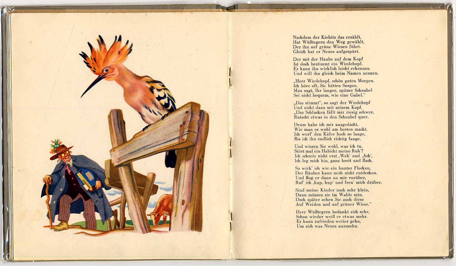 Bensing, Hilde (Verse): Professor Wüsstegern bei den Vögeln. Dresden, Walter Flechsig Verlag, [1943]. ca. 20,5 x 18 cm. (20) Seiten. Mit 9 ganzseitigen farbigen Bildern von Norbertine v. Besslern-Roth. Farbig illustrierter Orig.-Karton. Professor Wüsstegern trifft Specht, Kiebitz, Wiedehopf, Finken und andere Vögel. Gutes Exemplar.