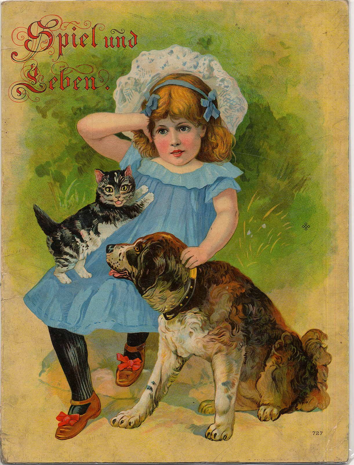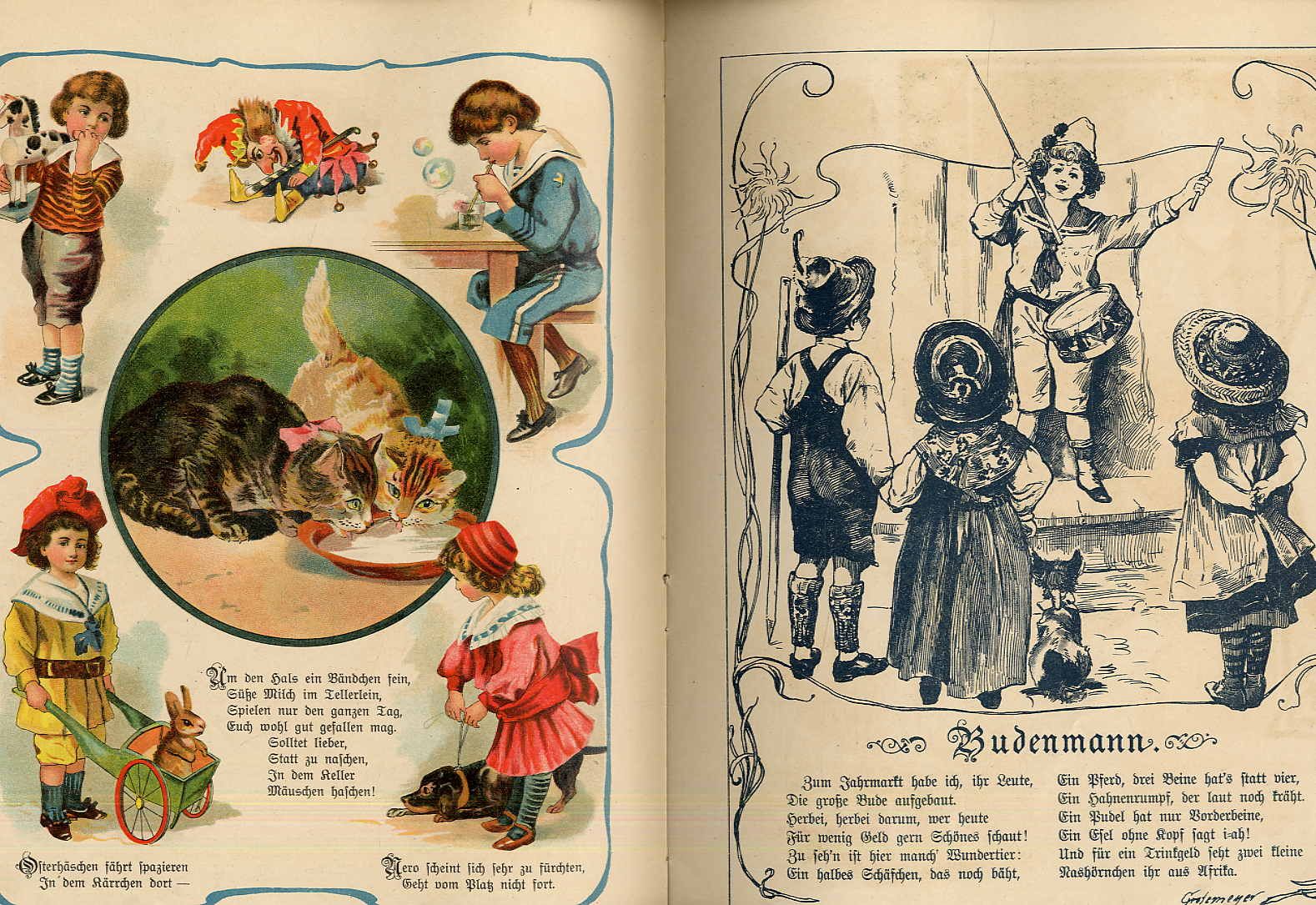 Spiel und Leben. Ohne Ort, Verlag und Jahr, um 1900. Ca. 33 x 24,5 cm. (16) Seiten. Mit zahlreichen Illustrationen, teils Chromolithographien. Farbig illustrierter Orig.-Karton. Verlagsnummer 727. Mit Versen: Schützenfest, Der Jäger, Budenmann, Hausputz, Kutscher, Das Gärtchen, Doktor, Der Kaufmann. Hübsch illustriertes Bilderbuch, teils mit Jugendstilumrandung.