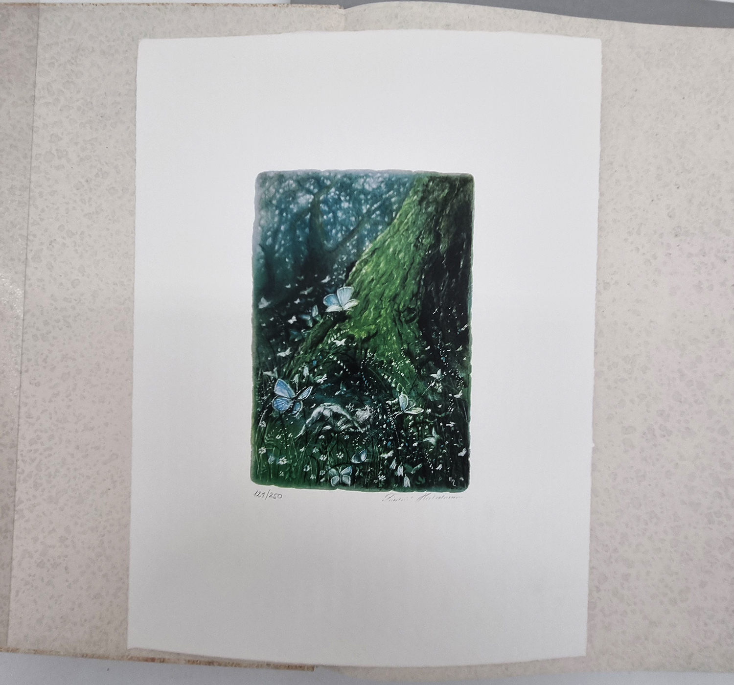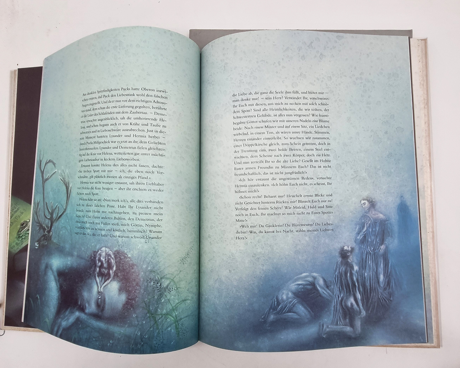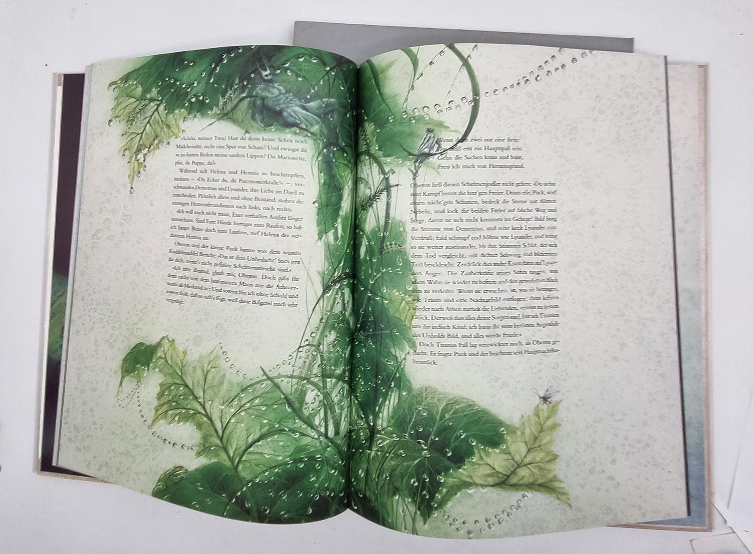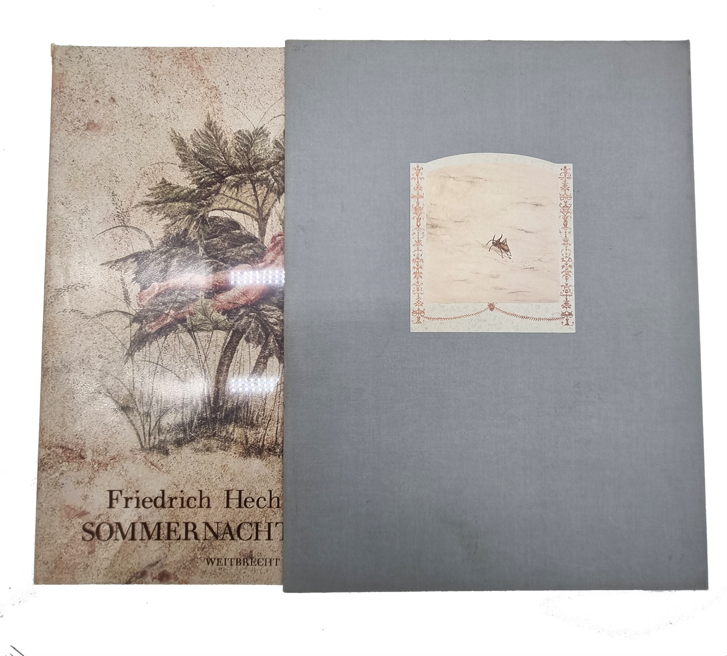 Hechelmann, Friedrich: Friedrich Hechelmanns Sommernachtstraum. William Shakespeares Märchenspiel in Mary Lambs Nachschrift. Nachwort von Antje Vollmer. Stuttgart/Wien, Weitbrecht, 1994. Ca. 40 x 30,5 cm. (48) Seiten. Mit farbigen, teils ganzseitigen Illustrationen. Mit dem beiliegenden nummerierten und signierten Siebdruck des Künstlers. Farbig illustr. Orig.-Pappband.im grauen Original-Leinenschuber. Exemplar 121/250. Sehr gutes Exemplar.