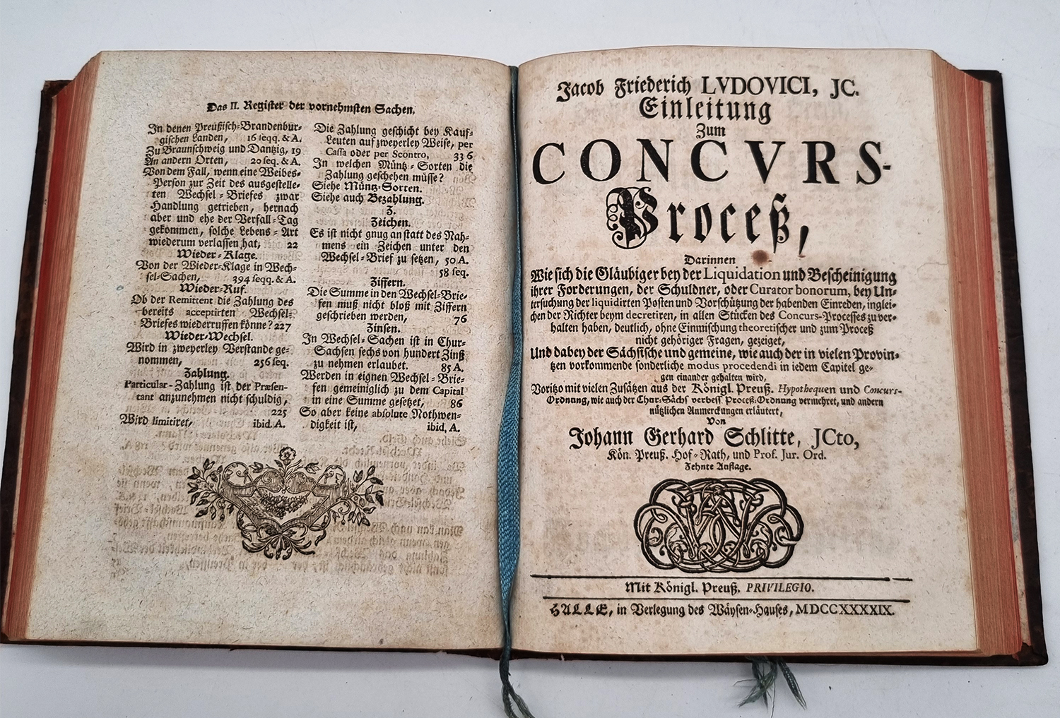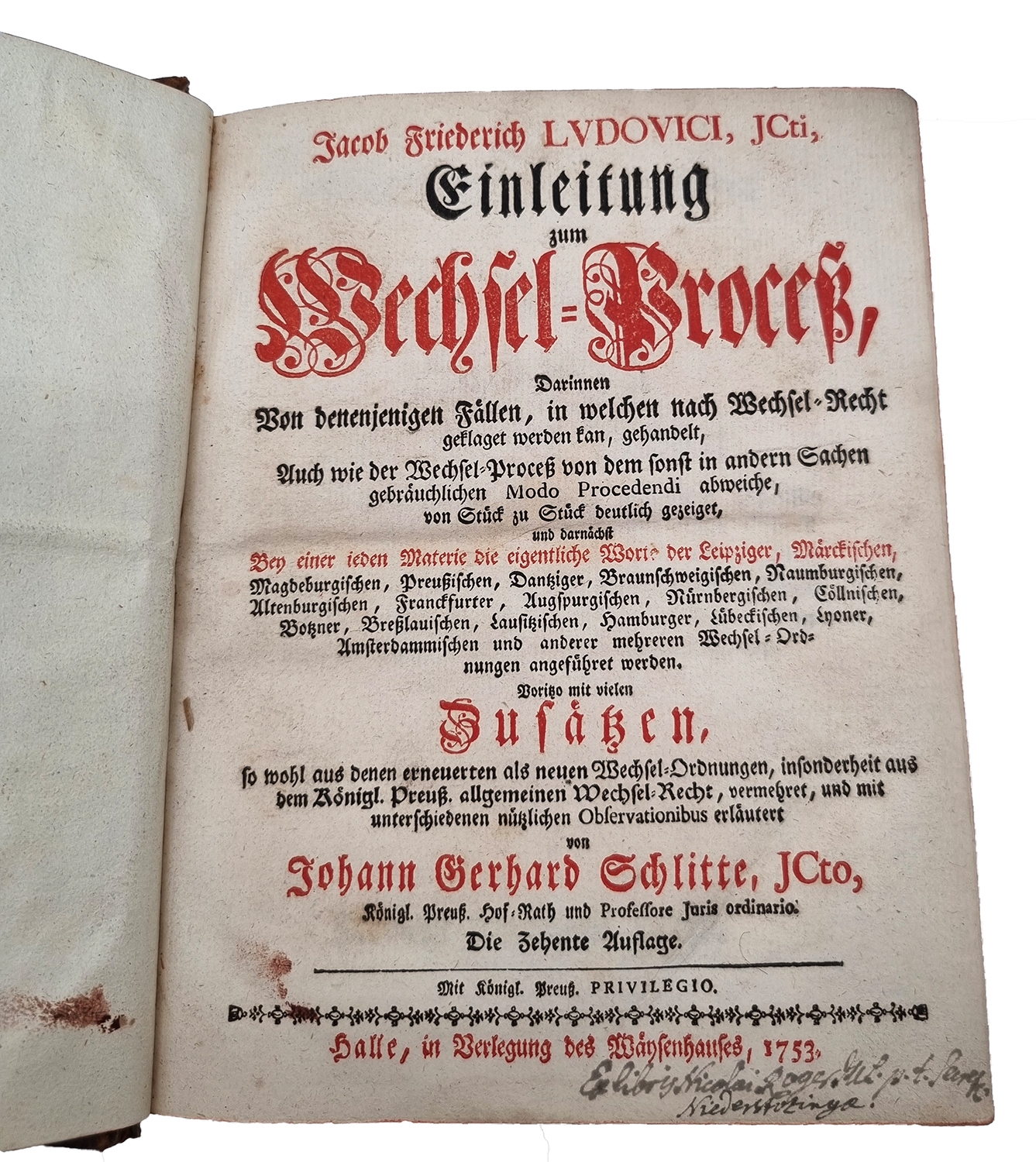 Ludovici, Jacob Friedrich: Einleitung zum Wechsel-Proceß. Darinnen Von denenjenigen Fällen, in welchen nach Wechsel-Recht geklaget werden kan, gehandelt, Auch wie der Wechsel-Proceß von dem sonst in andern Sachen gebräuchlichen Modo Procedendi abweiche, von Stück zu Stück deutlich gezeiget und darnächst Bey einer ieden Materie die eigentliche Worte der Leipziger, Märckischen, Magdeburgischen, Preußischen, Dantziger, Braunschweigischer, Naumburgischen, altenburgischen, Franckfurter, Augspurgischen, Nürnbergischen, Cöllnischen, Botzner, Breßlauischen, Lausitzischen, Hamburger, Lübeckischen, Lyoner, Amsterdammischen und anderer mehreren Wechsel-Ordnungen angeführet werden. Voritzo mit vielen Zusätzen, so wohl aus denen erneuerten als neuen Wechsel-Ordnungen … vermehrtet … von Johann Gerhard Schlitte. Angebunden: Jacob Friederich Ludovici, IC. Einleitung Zum Concurs-Proceß : Darinnen Wie sich die Gläubiger bey der Liquidation und Bescheinigung ihrer Forderungen, der Schuldner, oder Curator bonorum, bey Untersuchung der liquidirten Posten und Vorschützung der habenden Einreden, ingleichen der Richter beym decretiren, in allen Stücken des Concurs-Processes zu verhalten haben, deutlich, ohne Einmischung theoretischer und zum Proceß nicht gehöriger Fragen, gezeiget ; Und dabey der Sächsische und gemeine, wie auch der in vielen Provintzen vorkommende sonderliche modus procedendi in jedem Capitel gegen einander gehalten wird, Voritzo mit vielen Zusätzen aus der Königl. Preuß. Hypothequen und Concurs-Ordnung, wie auch der Chur-Sächs. Verbess. Proceß-Ordnung vermehret, und andern nützlichen Anmerckungen erläutert von Johann Gerhard Schlitte. 10. Auflage. Halle, Waysenhaus, 1753 und 1749. Ca. 21 x 16,5 cm. (24) S., 420 S., (28) Seiten; (24) S.; 183 S., (22) Seiten. Lederband der Zeit mit reicher Rückenvergoldung. Kleiner Besitzvermerk am unteren Titelblattrand. Titelblatt zum 2. Teil mit kleiner Randfehlstelle (nur im weißen Rand). Teils leicht gebräunt, gutes Exemplar. Jakob Friedrich Ludovici (1671-1723, Rechtshistoriker).