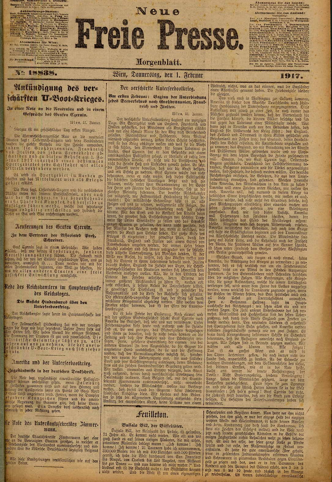 Neue Freie Presse. Februar 1917. Wien, 1917. Ca. 46 x 31 cm. Je Ausgabe zwischen 4 und 20 Seiten. Mit einer Kartenskizze. Werbeanzeigen teils mit kleineren Illustrationen. Grüner Leineneinband mit geprägtem Deckeltitel. Einband stärker fleckig (Vorderdeckel nur am unteren Rand), Hinterdeckel mit Knick. Seitenränder etwas fleckig, die letzten Seiten stärker. Die „Neue Freie Presse“ wurde am 1. September 1864 von Michael Etienne und Max Friedländer gegründet und entwickelte sich zur bedeutendsten liberalen Zeitung Österreichs. Unter Chefredakteur Moriz Benedikt (1849-1920) nahm sie großen Einfluss auf die Politik und veröffentlichte Beiträge namhafter Autoren. Sie erschien zweimal täglich (es gab jedoch auch Morgen- Nachmittags- und Abendblätter) und brachte neben Politik auch Feuilletons, und Nachrichten aus der Wirtschaft. Die Zeitung erschien durchgehend bis zum 31. Januar 1939. Ab 1. Februar 1939 wurde sie mit anderen Blättern zum Neuen Wiener Tagblatt fusioniert. – In unserem Bestand befinden sich mehrere Bände dieser Zeitschrift, die Bände sind nicht durchgehend collationiert, eventuell fehlen einzelne Ausgaben.