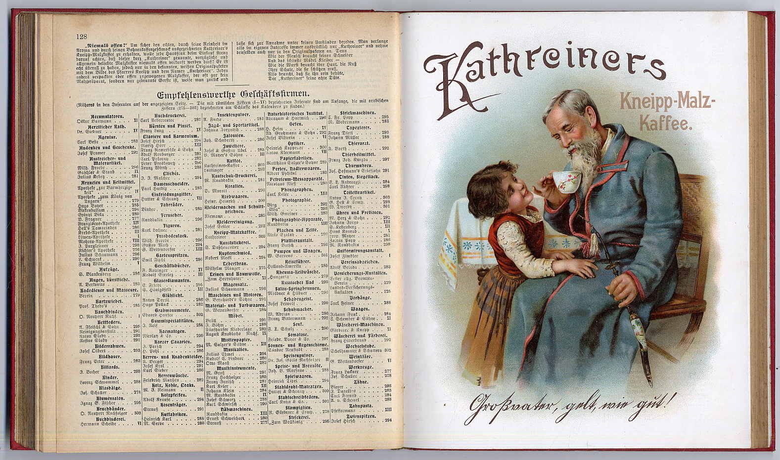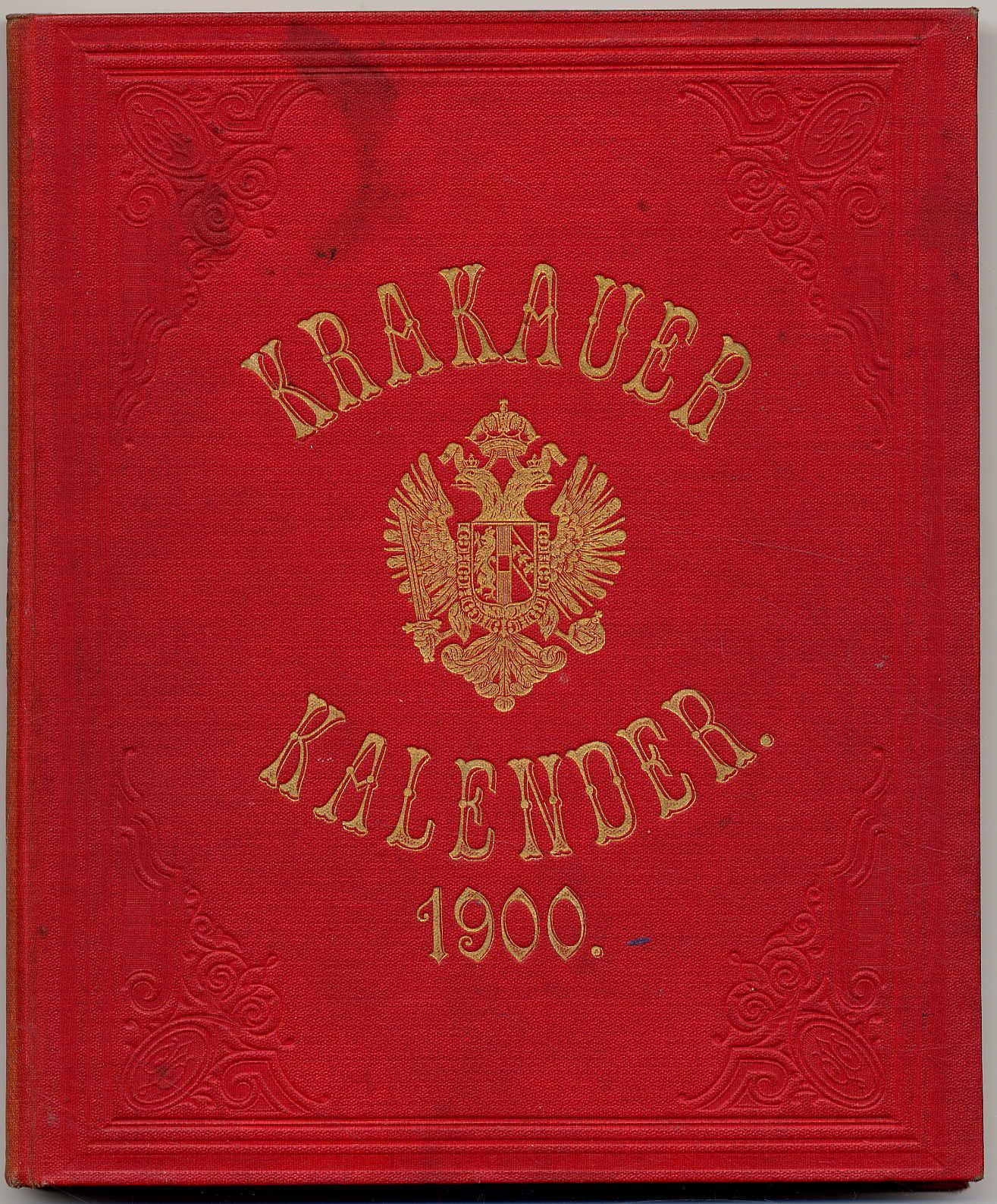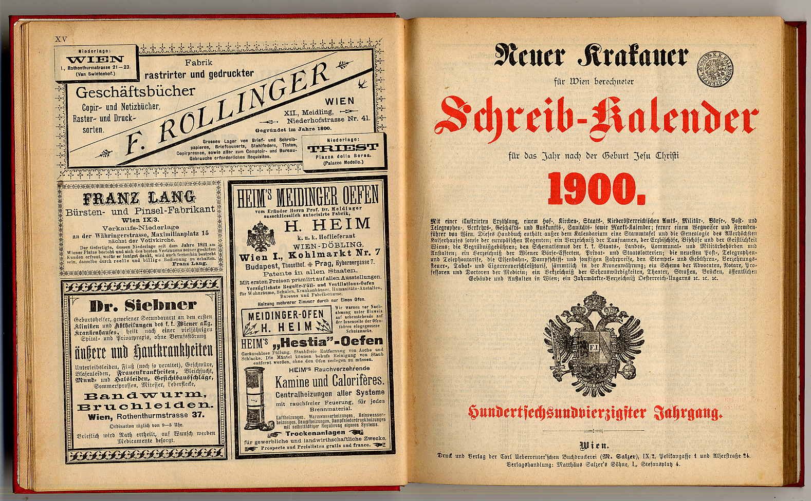 Kalender – Neuer Krakauer für Wien berechneter Schreib-Kalender für das Jahr nach der Geburt Christi 1900. Hundertsechsundvierzigster Jahrgang. Wien, Carl Ueberreuter’schen Buchdruckerei, 1899. Ca. 22,5 x 18,5 cm. XV S., 303 Seiten. Mit einigen Textillustraitonen und einer ganzseitigen Farblithographie. Roter Leineneinband mit geprägtem Wappen und Jahreszahl. Einbandkanten etwas bestoßen. Vorsätze mit Besitzvermerken und einmontierten Bildern von Schauspielerinnen. Die leeren Kalenderseiten teils mit Wetter-Eintragungen. Seiten leicht gebräunt. Mit Sanitäts-Kalender, Merk-Kalender, Amts-Kalender, Post- und Telegraphen-Kalender, Verkehrs-Kalender (z.B. Eisenbahn-Fahrpreise von Wien), Fahrtaxen für die Wiener Fiaker und Einspänner u.v.a. Die schöne Farblithographie mit Werbung für Kathreiners Kneipp-Malz-Kaffee.