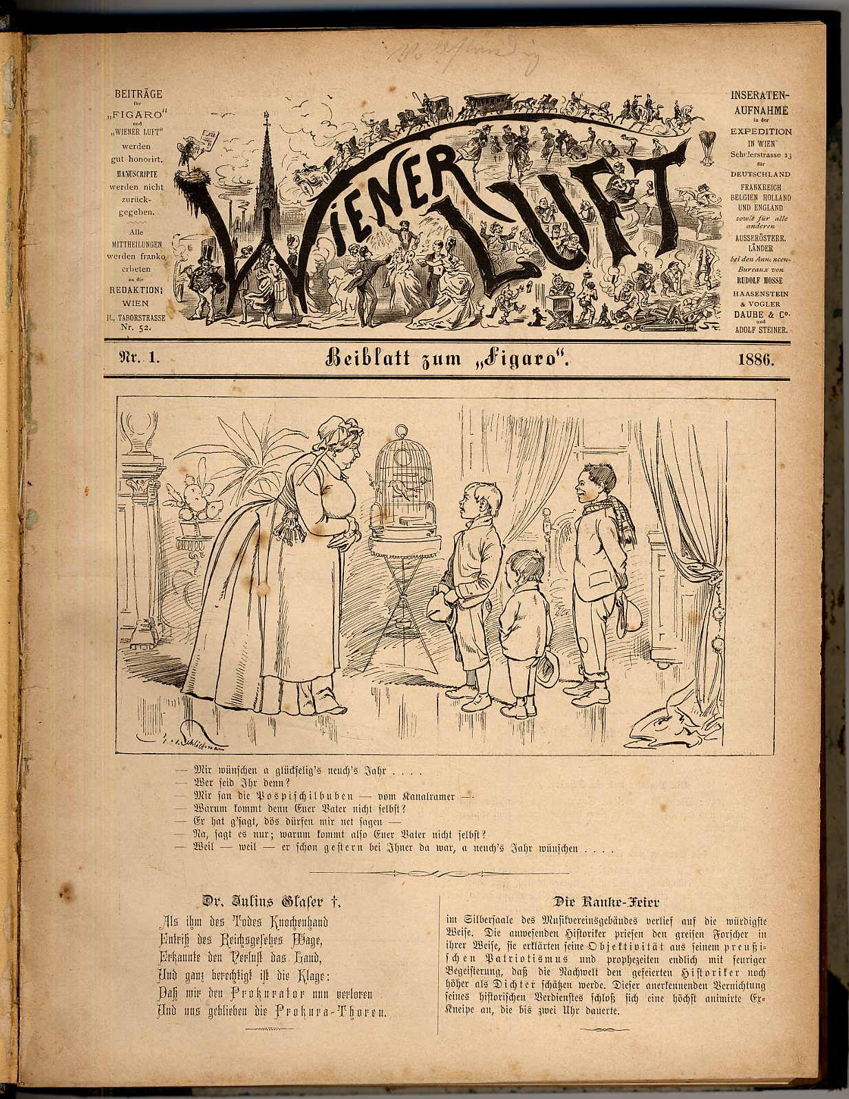 Anzengruber, Ludwig (Redakt.): Wiener Luft. Beiblatt zum Figaro. 1886 Hefte 1-52; 1887 Hefte 1-53 (ohne Hefte 14 und 39); 1888 Hefte 1-52 (ohne Hefte 15); 1889 Hefte 1-52 (ohne Hefte 2 und 50). 204 Hefte in einem Band. Wien, R. v. Waldheim, 1886-1889. Ca. 32 x 25 cm. Je Heft 4 Seiten, überaus reich illustriert. Halbleinenband. Heft 42 (1887) mit größerem Eckabriss. Seiten papierbedingt etwas gebräunt, einige Blätte rmit kleineren Randeinrissen und etwas fleckig, jedoch gutes Exemplar. Die „Wiener Luft“ enthält Witze, Anekdoten, Gedichte, Glossen und Karikaturen, die das Wiener Leben, die Politik und die Gesellschaft auf humorvolle Weise kommentierten. Typisch waren der Wiener Dialekt und viel Lokalkolorit.