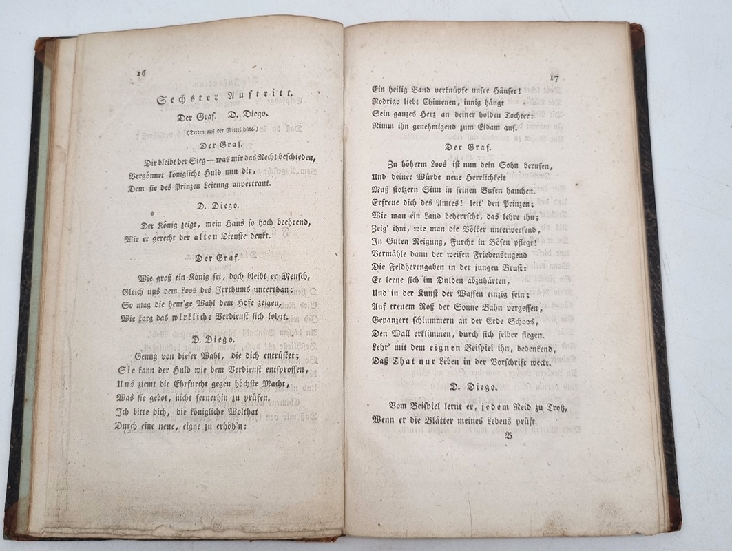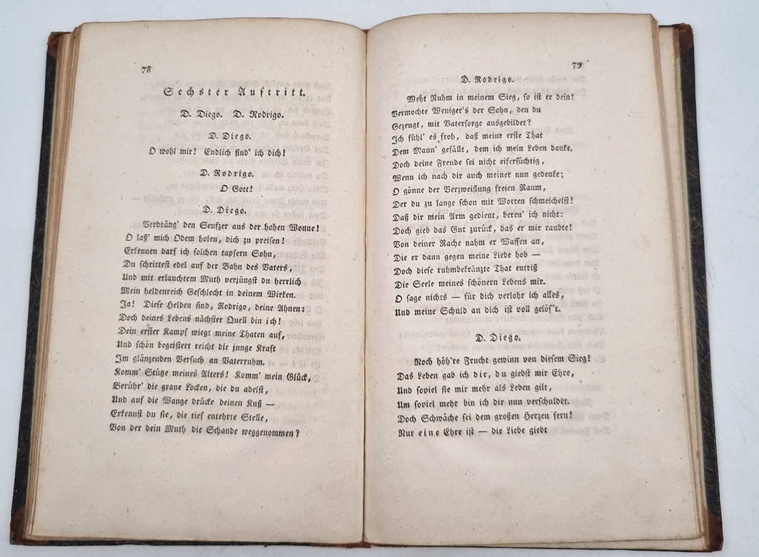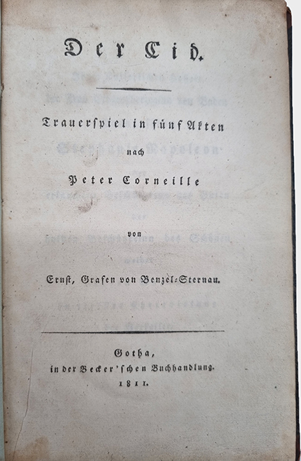 Corneille, Peter: Der Cid. Trauerspiel in fünf Akten nach Peter Corneille von Ernst, Grafen von Benzel-Sternau. Gotha, Becker’sche Buchhandlung, 1811. Ca. 21,5 x 13,5 cm. 126 S., (2) Seiten. Einfacher Halblederband der Zeit. Einband etwas berieben. Vorsätze und Seitenränder etwas fingerfleckig bzw. gebräunt.
