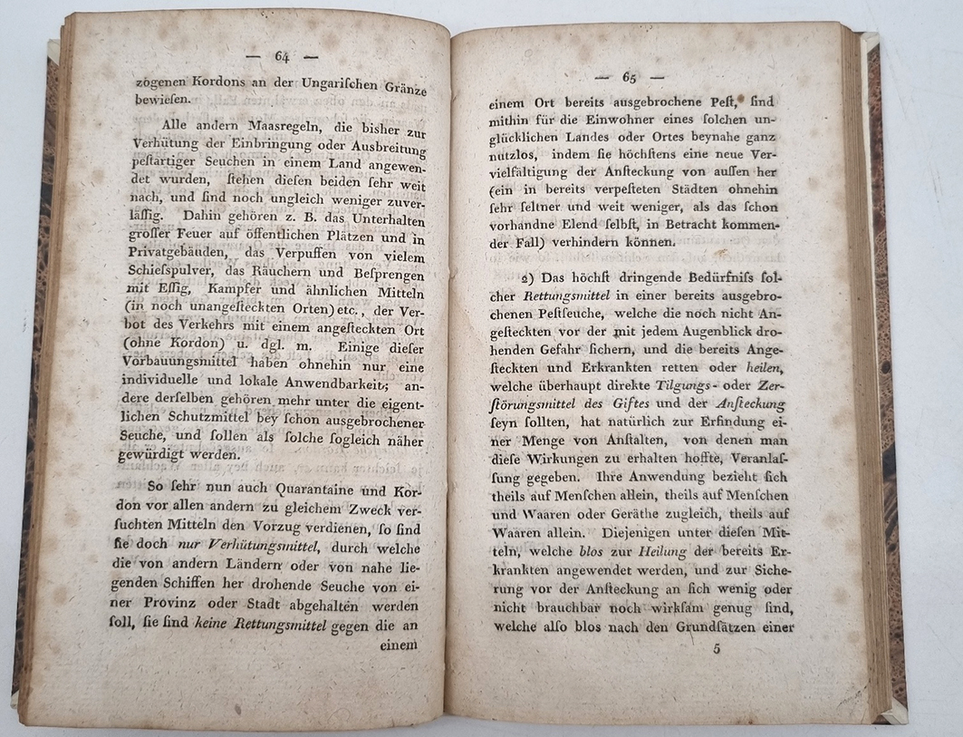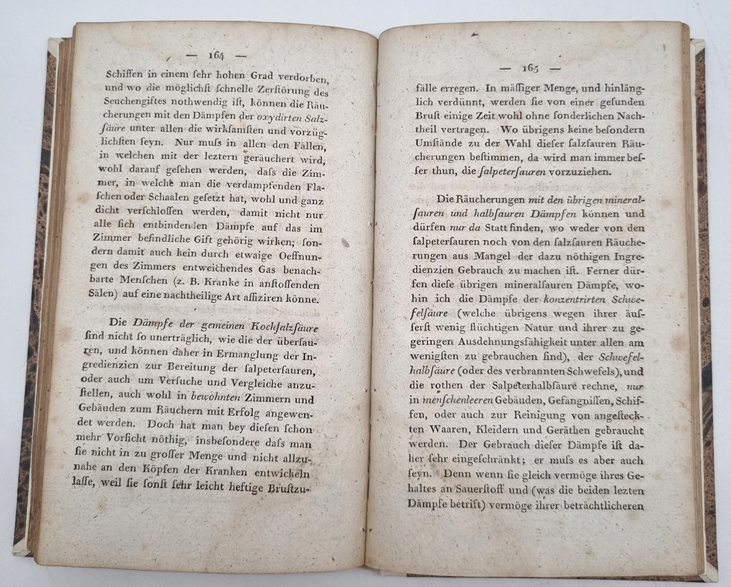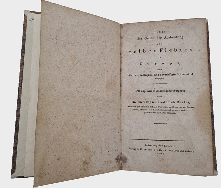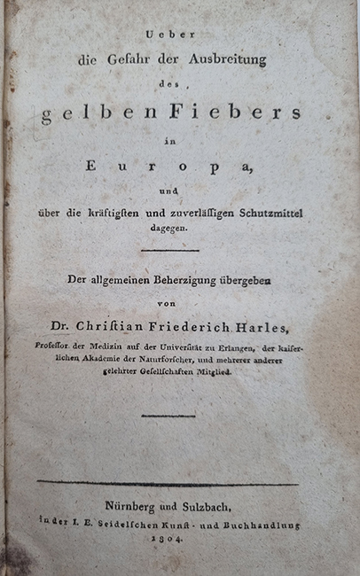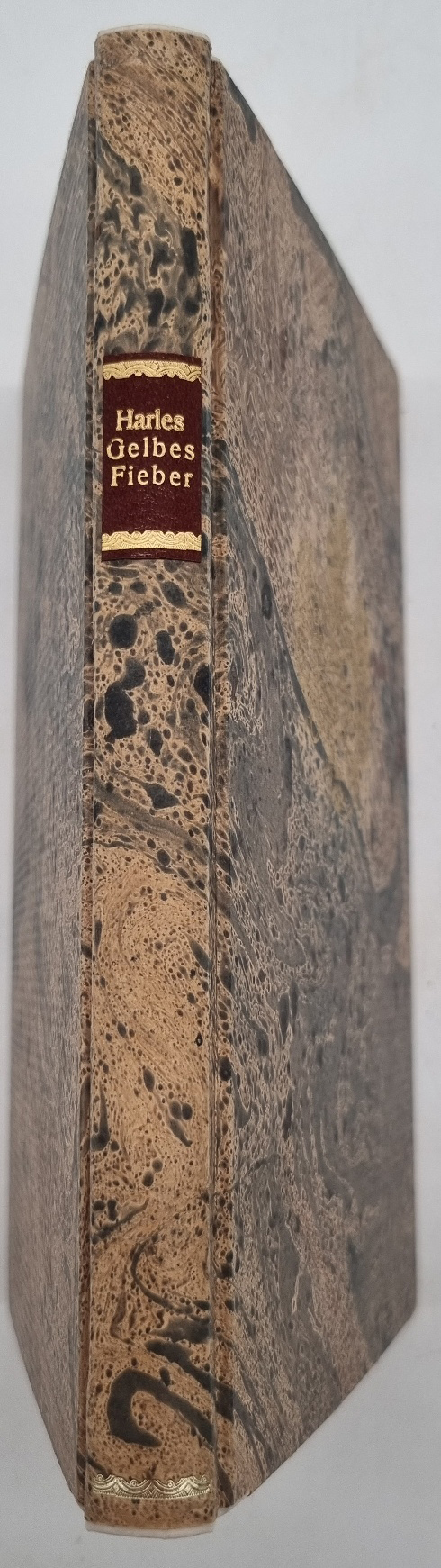 Harles, Christian Friederich: Ueber die Gefahr der Ausbreitung des gelben Fiebers in Europa und über die kräftigsten und zuverlässigen Schutzmittel dagegen. Der allgemeinen Beherzigung übergeben. Nürnberg und Sulzbach, I. E. Seidelsche Kunst- und Buchhandlung, 1804. Ca. 20,5 x 12,5 cm. (4) S., 204 Seiten. Moderner Pappband. Vorsätze erneuert. Innen etwas stockfleckig. Mit altem handschriftlichem Besitzeintrag auf altem Vorsatz. Beschreibt u.a. das Ausräuchern mit Kampfer, Schwefel, Salpeter, Schießpulver. „Das (pestartige) gelbe Fieber ist eine epidemische und eine ansteckende Krankheit zugleich.“ (Harles). Harles (1773-1853) „erhielt eine ausgezeichnete philologische und historische Bildung, die in seinen späteren wissenschaftlichen Arbeiten nachwirkte. In Erlangen 1793 zum Dr. phil., 1794 zum doctor medicinae promoviert, ging er anschließend zu einem kurzen Studienaufenthalt nach Wien und wurde noch im gleichen Jahre – nach erfolgter Habilitation – zum Extraordinarius ernannt … folgte … 1818 einem Ruf als ordentlicher Professor der allgemeinen und speziellen Pathologie und Therapie an die neugegründete Universität Bonn. … Auch in Bonn unterhielt er eine umfangreiche ärztliche Praxis, die er erst im hohen Alter aufgab. Seine zahlreichen wissenschaftlichen Arbeiten erstrecken sich auf fast alle Gebiete der Medizin; am bedeutendsten sind seine Veröffentlichungen zur Geschichte der Medizin und zur Seuchengeschichte. Enge Freundschaft verband ihn mit namhaften Ärzten wie Hufeland, Siebold (Vater und Sohn) und Friedreich. H. wandte sich gegen Spekulation und alles Metaphysische in der Naturforschung, insbesondere gegen die Naturphilosophie Schellings als Dogma in der Medizin sowie gegen den Mesmerismus. Er galt als kritischer, scharfer Beobachter und verstand, in seinen Schriften präzises Urteil mit guter Darstellung zu vereinen.“ (Liselotte Buchheim in NDB 7, S. 681-682).