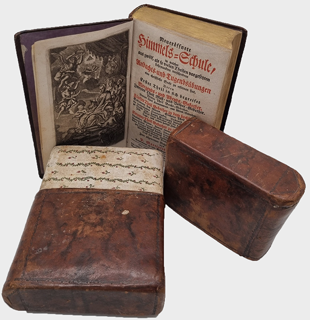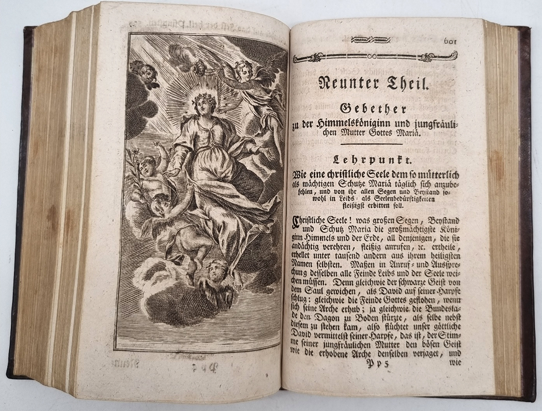 Keller, Martialis: Neueröffnete Himmels-Schule, in welcher aus zwölf, als so vielen Theilen vorgesetzten Lehrpunkten verschiedene Andachts- und Tugendsübungen eine christliche Seele zu erlernen hat : Deren Erster Theil in sich begreift Morgen- und Abend-Gebether. Zweyter Theil Meß– und Vesper-Gebether. Dritter Theil Beicht-Gebether. Vierter Theil Kommunion- und Ablaß-Gebether. Fünfter Theil Gebether zu dem hochheiligsten Sakramente des Altars. Sechster Theil Gebether zu der hochheiligsten Dreyfaltigkeit. Siebenter Theil Gebether zu Christo Jesu, sammt Freytägiger Andacht zu dem Herzen Jesu. Achter Theil Gebether auf die beweglichen Festtage, und andere heilige Jahrszeiten. Neunter Theil Gebether zu Maria der jungfräulichen Mutter, sammt samstägiger Andacht zu dem schmerzhaften Herzen Mariä. Zehnter Theil Gebether zu den lieben Heiligen Gottes, sammt neuntägiger Andacht zum heiligen Johann von Nepomuck. Eilfter Theil Gebether zu der Vorsichtigkeit Gottes. Zwölfter Theil Gebether zum Trost der armen Seelen im Fegfeuer / Zum allgemeinen Nutzen herausgegeben von P. Martialis Keller, Benediktiner in dem Reichsgotteshause Ottobayern. Augsburg, Matthäus Riegers. sel. Söhne, 1796. (32) S., 781 S., (3) Seiten. Mit gestochenem Frontispiz und 16 Kupfertafeln. Ledereinband der Zeit mit reicher Goldprägung, Goldschnitt. Im Original-Lederschuber. VD18 15303853. Sehr dekoratives Exemplar im Schuber.