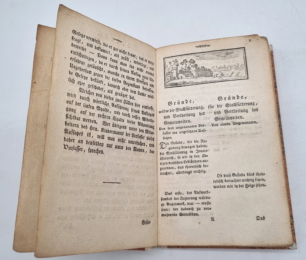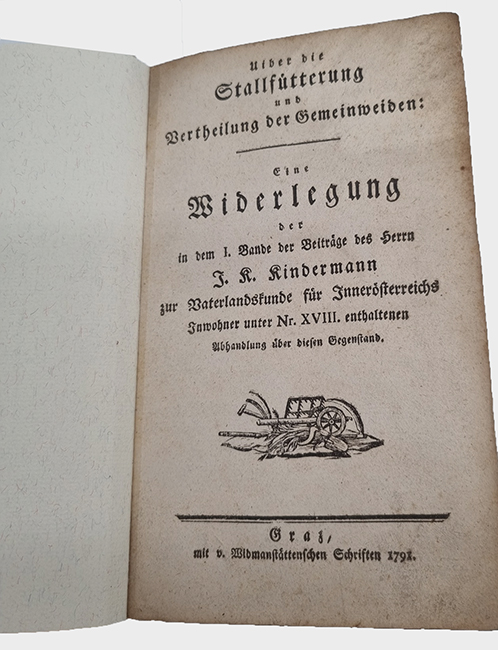 Schwitzen, Christoph v.: Uiber die Stallfütterung und Vertheilung der Gemeinweiden: Eine Widerlegung der in dem I. Bande der Beiträge des Herrn J. K. Kindermann zur Vaterlandskunde für Innerösterreichs Inwohner unter Nr. XVIII. enthaltenenen Abhandlung über diesen Gegenstand. Graz, Widmannstättensche Schriften, 1791. Ca. 19,5 x 12 cm. (4) S., 86 Seiten. Mit zwei mehrfach gefalteten Tabellen. Moderner Pappband. Erste Ausgabe. Vorsätze erneuert. Schwitzen, (1755-1796, österreichischer Verwaltungsbeamter). „Ueber die Stallfütterung …, worin er für die Stallfütterung und gegen die Beibehaltung der Gemeinweiden auftritt, also auch auf dem Gebiete der Landwirthschaft in fortschrittlichem Sinne wirkt. – S. war im vollsten Sinne des Wortes der Typus eines ganz von josephinischem Geiste durchdrungenen Verwaltungsbeamten mit allen Licht- aber auch manchen Schattenseiten.“ (Franz Ilwof in ADB 33 S. 471-472). Gutes Exemplar.