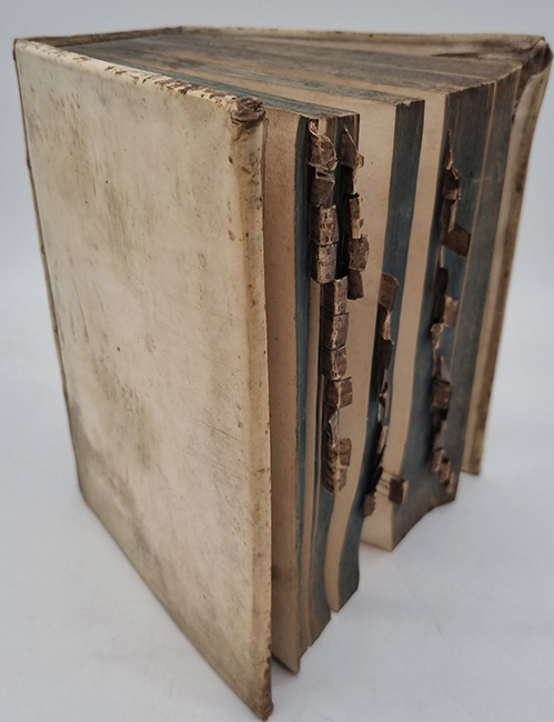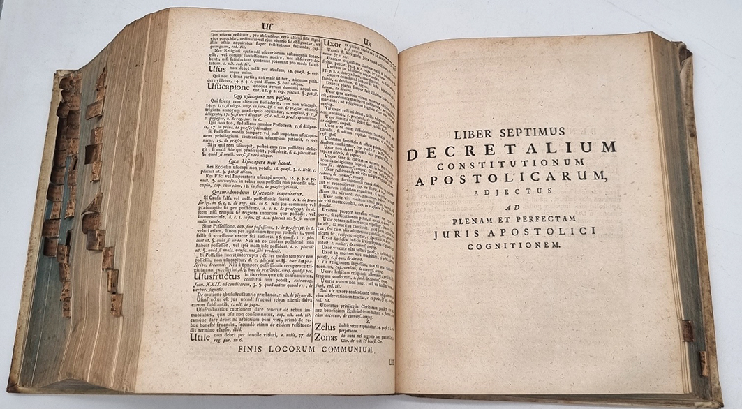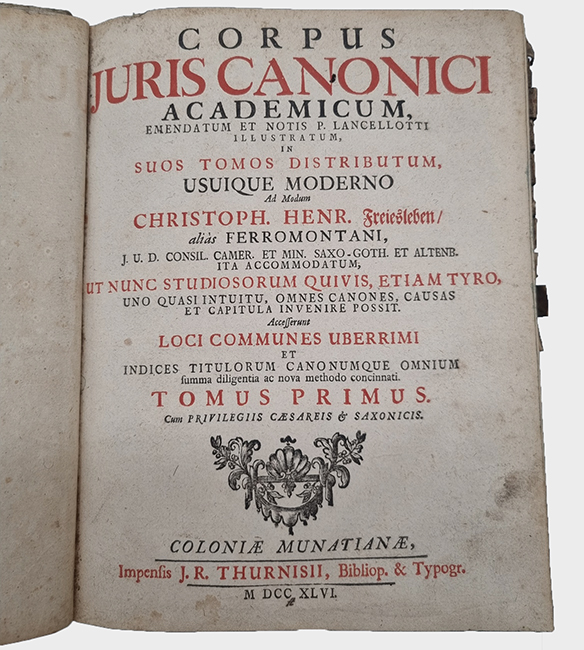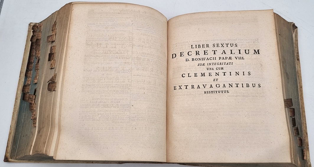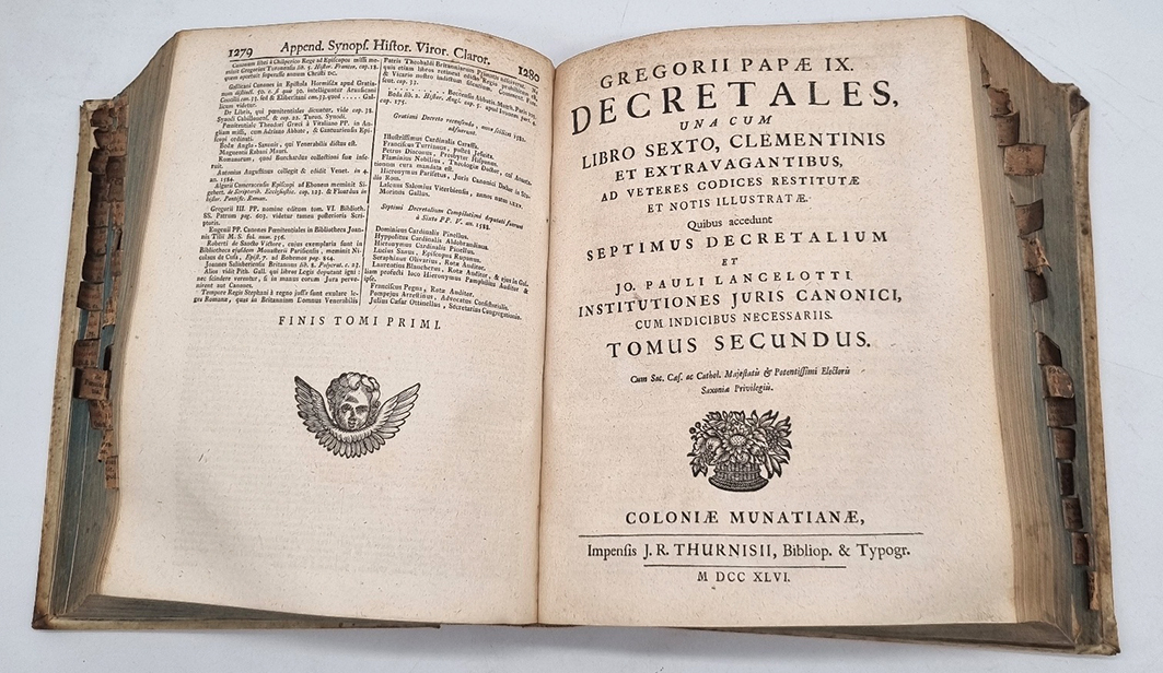 Lancellotti, Giovanni Paolo (Ed.) und Christoph Heinrich Freiesleben (Hrsg.): 1) Corpus Juris Canonici Academicum. Emendatum et Notis P. Lancelloti illustratum, in suos tomos distributum, usuique moderno ad modum Christoph. Henr. Freiesleben / alias Ferromontani … 112 Seiten, 1.280 Spalten; 2) Gregorii Papae IX. Decretales, una cum libro sexto, clementinis et extravagantibus … Quibus accedunt septimus decretalium et Jo. Pauli Lancelotti Institutiones Juris Cononici, Tomus secundus. (20) Seiten, 754 Spalten; 3) Liber sextuas decretalium D. Bonifacii Papae VIII. … (6) Seiten, 404 Spalten, (68) Seiten; 4) Liber Septimus Decretalium Constitutionum Apostolicarum … (6) Seiten, 236 Spalten, (10) Seiten; 5) Institutiones Juris Canonici, quibus Jus Pontificium singulari methodo libris IV comprehenditur … (4) Seiten, 158 Spalten, (2) Seiten. Coloniae Munatianae (d.i. Basel), J. R. Thurnisii (Thurneysen), 1746. Ca. 24,5 x 20 cm. Pergamentband der Zeit, mit gedruckten Register-Zettelchen am Buchschnitt. Text auf Latein. Sammlung kirchenrechtlicher Texte. Mit einmontiertem „Bericht an den Kaeuffer“ auf dem Innendeckel zur Benutzung der Register-Zettelchen (diese in rot und schwarz gedruckt, am Buchschnitt angebracht). Einband etwas fleckig. Registerzettelchen etwas fingerfleckig, nicht alle vorhanden.