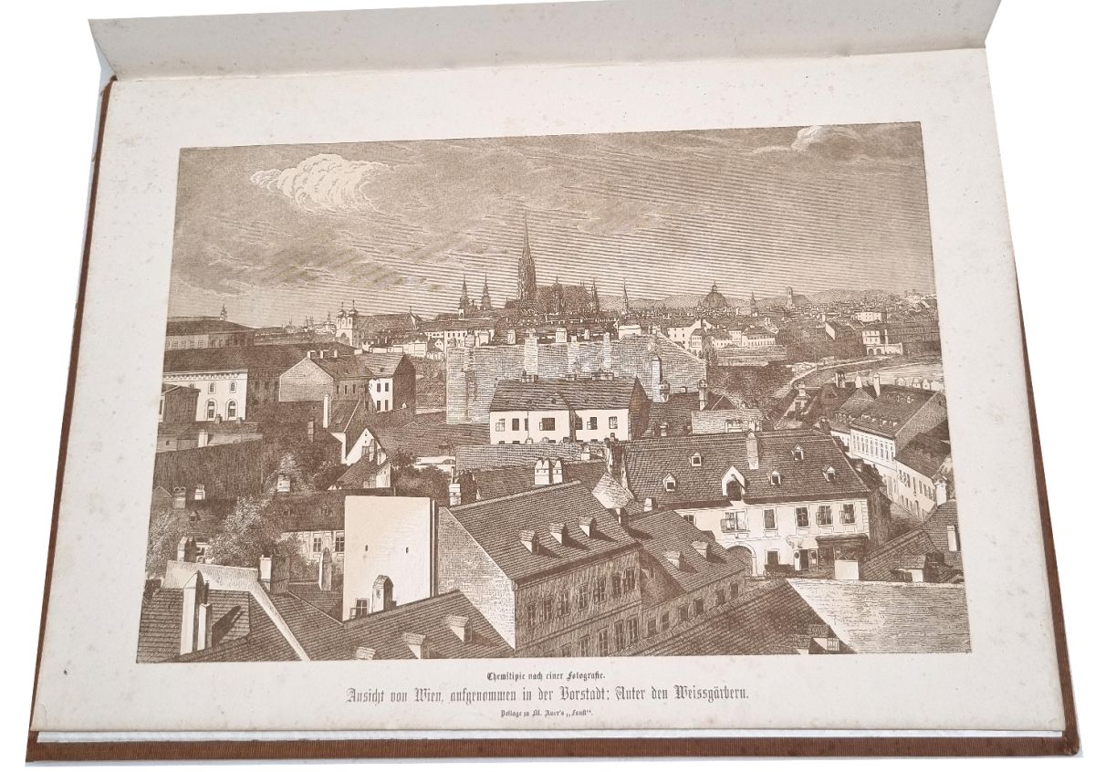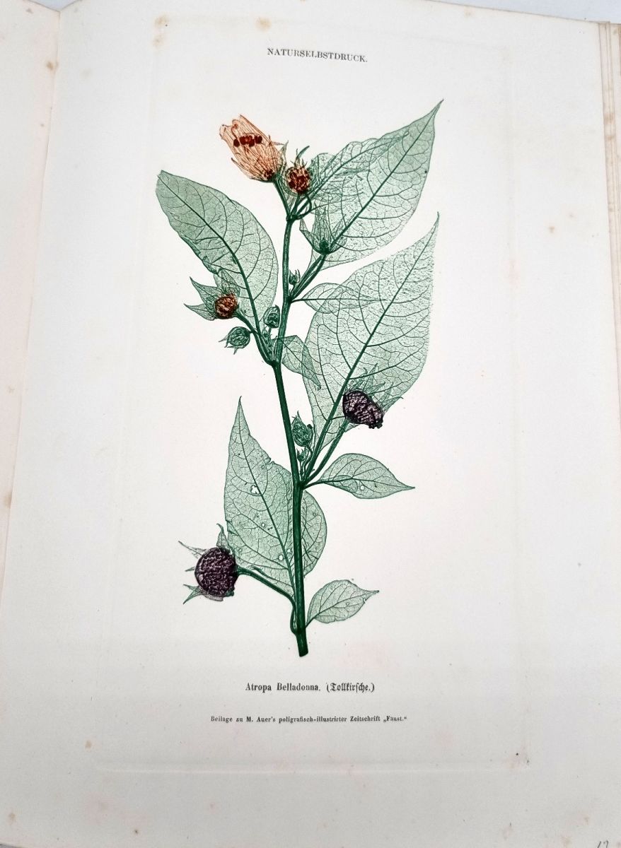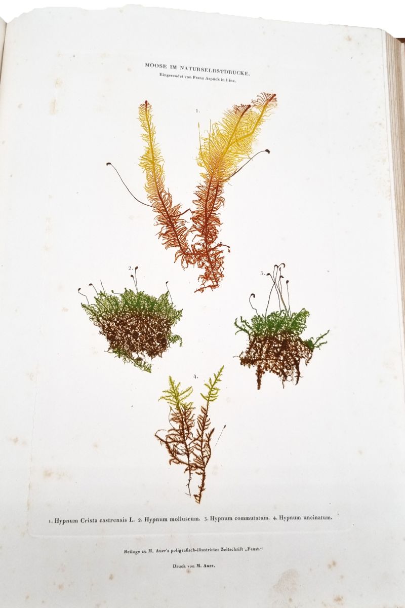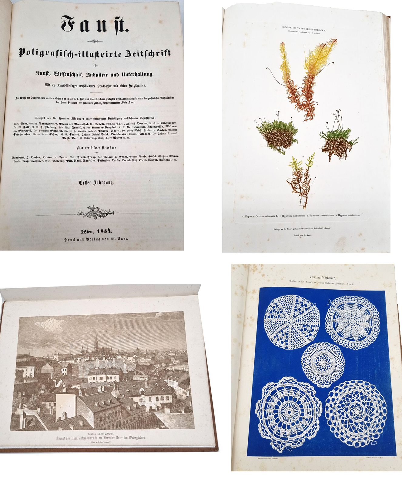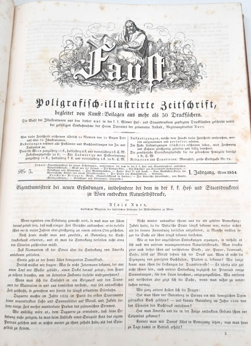 Faust. Poligrafisch-illustrirte Zeitschrift für Kunst, Wissenschaft, Industrie und Unterhaltung. Redigirt von Hermann Meynert unter literarischer Betheiligung nachstehender Schrifsteller: Alois Auer, Amand Baumgartner, Braun v. Braunthal, Dr. Castelli, Wilhelm Chezi, Friedrich Dornau, A.E. v. Eitelberger, M. Falk, J.A.F. Fladung, Lud. Aug. Frankl, Baron Hammer-Purgstall, K.a. Kaltenbrunner, Kratochvilla, Malven, Dr. Märzroth, Dr. Hermann Meynert, Dr. S.H. Mosenthal, H. Pfeiffer, Ranftl, Dr. Moriz Reich, Freiherr v. Sacken, Andreas Schuhmacher, Anton Xaver Schurz, C. E. Seelieb, Johann Gabriel Seidl, Stainhauser, Emanuel Straube, Dr. Johann Nepomuk Vogl, Voit, A. Worring, Franz Xaver Wurm etc. etc. Mit artistischen Beiträgen von Benedetti, J. Bucher, Breyer, v. Exter, Peter Fendi, Franz, Carl Geiger, A. Geyer, Conrad Grefe, Hösel, Christian Meyer, Leander Ruß, Mößmer, Marie Pokorny, Piil, Rahl, Ranftl, A. Schindler, Torsch, Treml, Prof. Weiß, Würbl, Zastiera etc. etc. 1. Jahrgang. Wien, Druck und Verlag von M. Auer, 1854. Ca. 35 x 25,5 cm. 192 Seiten, mit zahlreichen Textholzschnitten und allen 72 Kunst-Beilagen verschiedener Druckfächer. Leineneinband der Zeit mit reicher Goldprägung. Komplettes Exemplar mit allen Beilagen des wesentlichen 1. Jahrgangs (bis 1861 erschienen 8 Jahrgänge) dieses grundlegenden Werkes über den „Naturselbstdruck“, u.a. mit folgenden Abhandlungen von Alois Auer von Welsbach (1813-1869): „Der poligrafische Apparat; Ueberblick des technischen Verfahrens und die Anwendung der verschiedenen Druckkünste“; „Die Entdeckung des Naturselbstdruckes oder die Erfindung, von ganzen Herbarien, Stoffen, Spitzen, Stickereien und überhaupt allen Originalien und Copien, wenn sie auch noch so zarte Erhabenheiten und Vertiefungen an sich haben, durch das Original selbst auf einfache und schnelle Weise Druckformen herzustellen, womit man sowohl weiß auf gefärbtem Grunde drucken und prägen, als auch mit den natürlichen Farben auf weißem Papiere Abdrücke, dem Originale identisch gleich, gewinnen kann, ohne daß man einer Zeichnung oder Gravure auf die bisher übliche Weise durch Menschenhände bedarf“; „Eigenthumsstreit bei neuen Erfindungen, insbesondere bei dem in der k. k. Hof- und Staatsdruckerei in Wien entdeckten Naturselbstdrucke“. Alle 72 Beilagen (darunter 10 Naturselbstdrucke und 7 Originalselbstdrucke) entsprechend dem Inhaltsverzeichnis enthalten: 1) Österreichs Bitte (Musikbeilage); 2) Peter Cornelius (Stahlstich, geschabt von Christian Meyer); 3) Mutter und Kind (Stahlstich, geschabt von Thomas Benedetti); 4) Alfabeten-Stammbaum (Litografirte Gravüre); 5) Die Kinder und der Vogel (Radirung in Stahl); 6) Häckelmuster von Marie Pokorny (Originalselbstdruck); 7) Moose (Naturselbstdruck); 8) Der steierische Hirtenknab von Ranftl (Kreidezeichnung); 9) Sebastopol und Adrianopel (Gravüre in Stein); 10) Moose (Naturselbstdruck in Farben); 11) Spitzen (Originalselbstdruck); 12) Ideal einer Landschaft (Radirung in Kupfer); 13) Das Industrie-Ausstellungsgebäude in München (Zinkradirung und Umdruck); 14) Ein Kroaten-Vorposten (Kupferdruck); 15) Die Zwillinge (Kupferstich); 16) Der kleine Musikant (Schabmanier); 17) Tiroler Welden-Freiwilliger (Kupferstich); 18) Constantinopel und Jassy (Zinkradirung); 19) Moose (Naturselbstdruck); 20) Grundplan des Industrie-Ausstellungsgebäudes in München (Litografie); 21) Die ersten Studien (Kupferstich); 22) Karl Heinrich Rahl (Kupferstich); 23) Eine durchschnittene Achatmandel aus Sachsen (Naturselbstdruck); 24) Die Rückkehr aus dem Feldzuge (Kupferstich); 25) Peter Heß (Stahlstich); 26) Der Dorf-Dilettant (Kupferstich); 27) Ideale Landschaft (Radirung in Kupfer); 28) Die Sulinamündung und Rustschuk (Zinkradirung); 29) Der Wasserfall (Holzätzung nach Ranftl’schem Verfahren); 30) Der Haase (Originalselbstdruck); 31) Der Hundskopf (Galvanografie); 32) Der Wiener Freiwillige (Kupferstich); 33) Das durchlöcherte Bild (Stahlstich); 34) Der Auerhahn (Originalselbstdruck); 35) Das Schachspieler (Xilografie); 36) Moose (Naturselbstdruck); 37) Wilhelm Kaulbach (Stahlstich); 38) Dorf aus Oberösterreich (Xilografie); 39) Die Tollkirsche (Naturselbstdruck); 40) Odessa (Umdruck auf Stein); 41) Kaiser Friedrich III Grabdenkmal im St Stefansdome zu Wien (Kupferstich, mit großem Einriss); 42) Auszeichnung und Entschluß (Radirung im Kupfer); 43) Lenaus Grabmal (Kupferstich); 44) Bomarsund (Umdruck auf Stein, mehrfach gefaltet, mit kleineren Randeinrissen); 45) Ideale Landschaft (Radirung in Kupfer); 46) Friedrich Hebbel (Stahlstich); 47) Flügelaltar zu Bartfeld in Ungarn (Kupferstich); 48) Kars und Bajasid (Umdruck auf Stein); 49) Die Krim-Expedition (Xilografischer Umdruck, doppelblattgroß); 50) Moose (Originalselbstdruck); 51) Weißstickerei (Originalselbstdruck); 52) Alle fünf Londoner Weltausstellungs-Münzen von 1851; 53) Farrenkraut im Naturselbstdruck; 54) Alfabete für Blinde; 55) Das Mädchen mit dem Medaillon (Galvanografie); 56) Spitzenkragen (Originalselbstdruck); 57) Zum Ereignis von Bomarsund (Xilografischer Umdruck); 58) Die Admiralität im türkisch-russischen Feldzug (Xilografischer Umdruck); 59) Ein großes Eichenblatt (Naturselbstdruck); 60) Silhouettendruck; 61) Der Sultan (Xilografischer Umdruck); 62) Holzdurchschnitte, Tafel 1 (Naturselbstdruck); 63) Madonna von Titian (Kupferstich); 64) Tipografische Ornamentik (Festgedicht); 65) Bibel-Abdruck; 66) Dürers Holzschnitte; 67) Mathias Ranftl (Stahlstich in geschabter Manier); 68) Glasdruck; 69) Algen (Meerpflanzen im Naturselbstdruck); 70) Gutenberg und Faust (Tipografischer Farbendruck, Exter’s neues Verfahren); 71) Jesukind von Titian (Kupferstich); 72) Ansicht von Wien (Chemitipie nach einer Fotografie). Einband etwas ausgeblichen, Kanten stärker bestoßen. Die Seiten und Tafeln teils stockfleckig, siehe auch Beschreibung bei den einzelnen Illustrationen. Vollständige Jahrgänge sind sehr selten, die Besitzer entfernten die dek