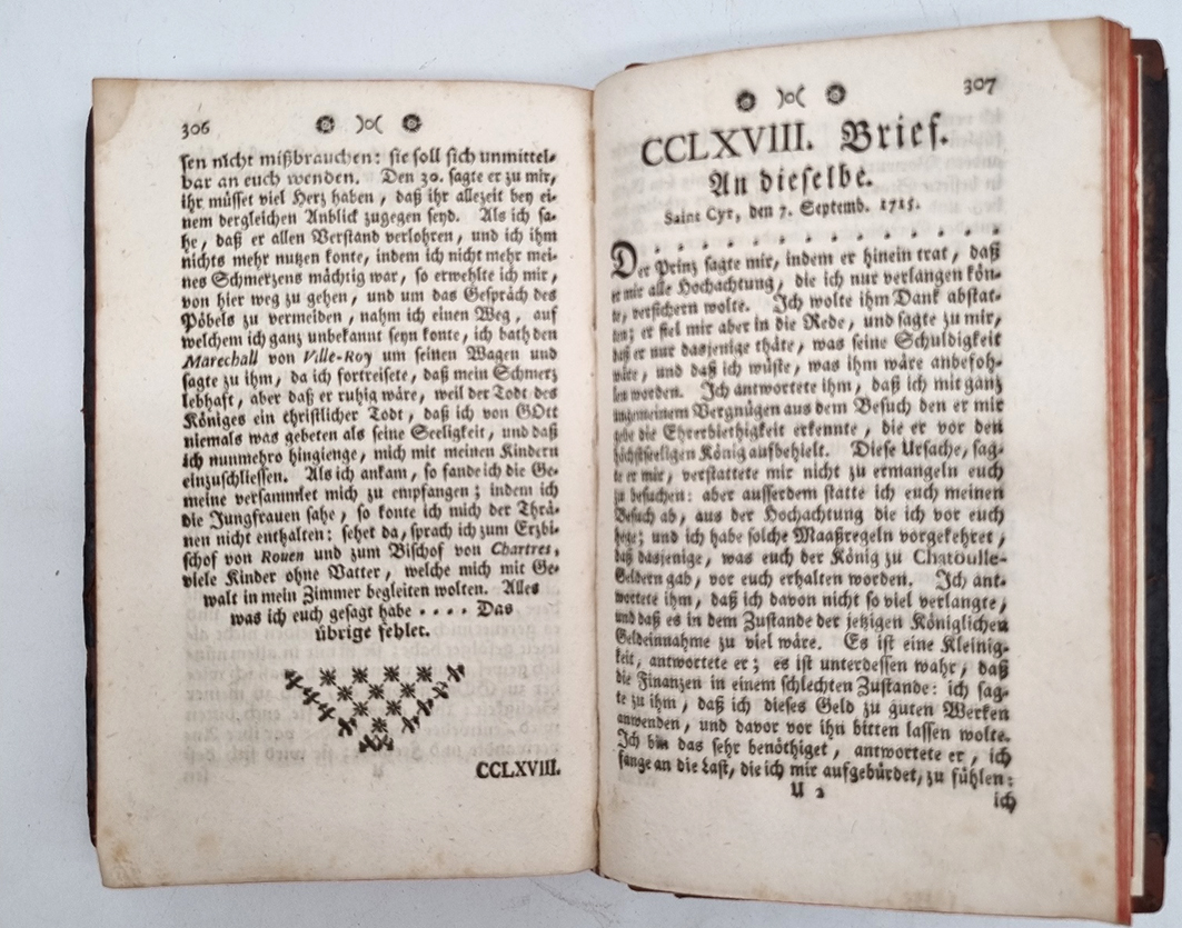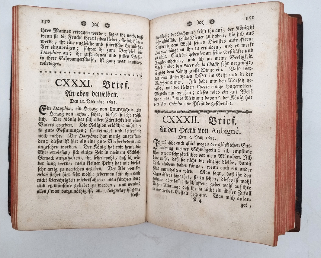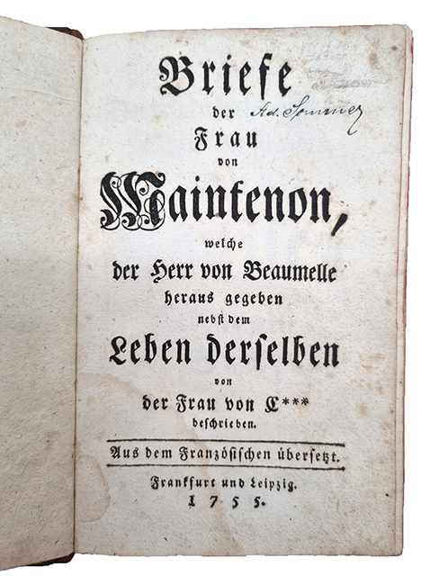 Beaumelle, [Laurent Angliviel de La] (Hrsg.): Briefe der Frau von Maintenon, welche der Herr von Beaumelle heraus gegeben nebst dem Leben derselben von der Frau von C*** beschrieben. Aus dem Französischen übersetzt. Frankfurt und Leipzig, ohne Verlag, 1755. Ca. 17 x 10,5 cm. (16) S., 352 Seiten. Ledereinband der Zeit (Rücken neu hinterlegt). VD18 1098920X. Vorsätze erneuert. Seiten anfangs etwas fleckig. Titelblatt mit Namenszug. Beaumelle (1726-1773, französischer Schriftsteller und Literaturwissenschaftler). Seine „Mémoires de la Maintenon“ brachten ihn für ein Jahr ins Gefängnis.