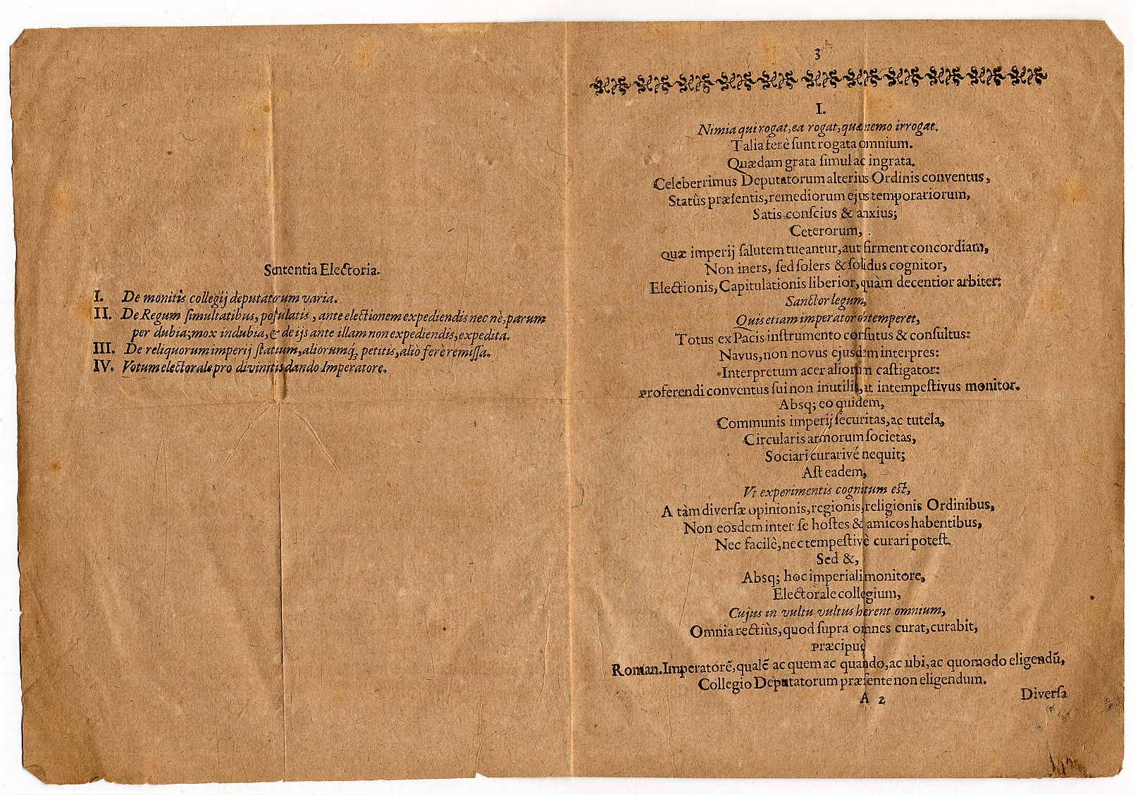[Frischmann, Johann]: Electorum de omnium desideriis sententia. [1657]. Ca. 18 x 14 cm. 9 S., (1) Seite. Ausgebundene Broschur. Rücken mit Papierstreifen befestigt. Seiten gebräunt und etwas knickfaltig bzw. angerändert. Text auf Latein. (Die Flugschriften des 17. Jahrhunderts in der Staats- und Stadtbibliothek Augsburg, FL 1657-017 und FL 1657-010). Johann Frischmann (1612-1680, Publizist und Diplomat), „F. ist ein höchst charakteristischer Vertreter der „irenischen“ Zeit Deutschlands, als die protestantische gelehrte Welt „im Reich“ nach dem 30jährigen Krieg bald in Schweden, bald in Frankreich die Verteidiger deutscher „Libertät“ sah. Unter der philologisch-historischen Leitung eines Mattias Bernegger erhielt F. seit 1630 auf der 1621 zur Universität erhobenen Straßburger Hochschule die entscheidenden Anregungen. Wie seine Lehrer stellte er seine Feder nach kurzer Tätigkeit im württembergischen Mömpelgard zunächst in schwedische, dann in kurmainzer Dienste. Als mit der Kaiserwahl Leopolds I. (1657/58) Frankreich das Erbe der nordischen Vormacht antrat, weckten die von ihm herausgegebenen, durchweg lateinische Flugschriften, nicht zuletzt durch die eigenartige Darstellung, deren „Lapidarstil“ in einer auf Grabsteinen üblichen Anordnung der Zeilen packende Wendungen sowie eine antithesenreiche Sprache gestattete, aber auch durch ihre europäische Sicht die Aufmerksamkeit der neuen Pariser Herren, insbesondere des Kardinals Mazarin. Dieser wies mit der Ernennung F.s zum französischen Residenten in Straßburg 1658 über die im Westfälischen Frieden gewonnenen Stützpunkte auf das letzte Ziel seiner elsässischen Politik hin.“ (Paul Wentzcke in NDB, 5, S. 621).