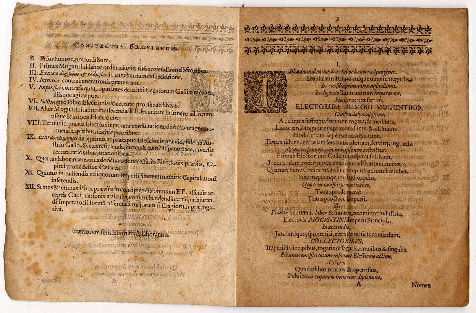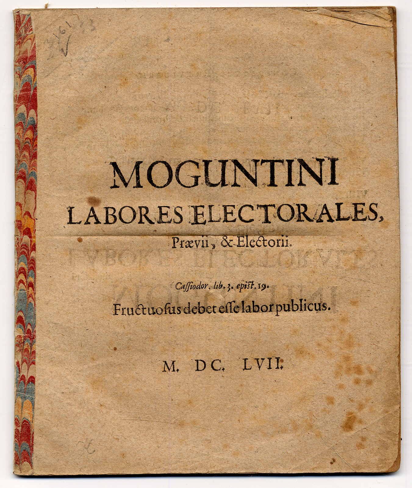 [Frischmann, Johann]: Moguntini labores electorales praevii & electorii. Cassiodor. lib. 3. epist. 19. Fructuosus debet esse labor publicus 1657. Ca. 17,5 x 14,5 cm. (2) S., 45 S., (1) Seite. Ausgebundene Broschur. Rücken mit Papierstreifen befestigt. Seiten gebräunt und etwas knickfaltig bzw. angerändert. Text auf Latein. Vgl. Die Flugschriften des 17. Jahrhunderts in der Staats- und Stadtbibliothek Augsburg, FL 1657-033 und FL 1657-032; VD17 1:019376G mit der dort angegebenen über 6 Zeilen reichenden Schmuckinitiale. Johann Frischmann (1612-1680, Publizist und Diplomat), „F. ist ein höchst charakteristischer Vertreter der „irenischen“ Zeit Deutschlands, als die protestantische gelehrte Welt „im Reich“ nach dem 30jährigen Krieg bald in Schweden, bald in Frankreich die Verteidiger deutscher „Libertät“ sah. Unter der philologisch-historischen Leitung eines Mattias Bernegger erhielt F. seit 1630 auf der 1621 zur Universität erhobenen Straßburger Hochschule die entscheidenden Anregungen. Wie seine Lehrer stellte er seine Feder nach kurzer Tätigkeit im württembergischen Mömpelgard zunächst in schwedische, dann in kurmainzer Dienste. Als mit der Kaiserwahl Leopolds I. (1657/58) Frankreich das Erbe der nordischen Vormacht antrat, weckten die von ihm herausgegebenen, durchweg lateinische Flugschriften, nicht zuletzt durch die eigenartige Darstellung, deren „Lapidarstil“ in einer auf Grabsteinen üblichen Anordnung der Zeilen packende Wendungen sowie eine antithesenreiche Sprache gestattete, aber auch durch ihre europäische Sicht die Aufmerksamkeit der neuen Pariser Herren, insbesondere des Kardinals Mazarin. Dieser wies mit der Ernennung F.s zum französischen Residenten in Straßburg 1658 über die im Westfälischen Frieden gewonnenen Stützpunkte auf das letzte Ziel seiner elsässischen Politik hin.“ (Paul Wentzcke in NDB, 5, S. 621). Text auf Latein.