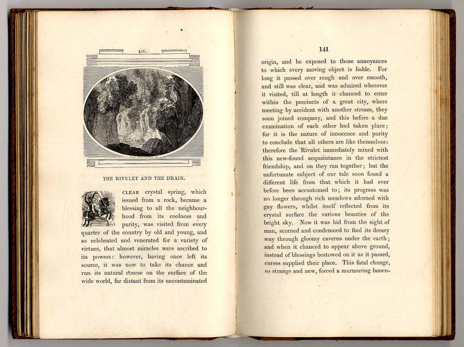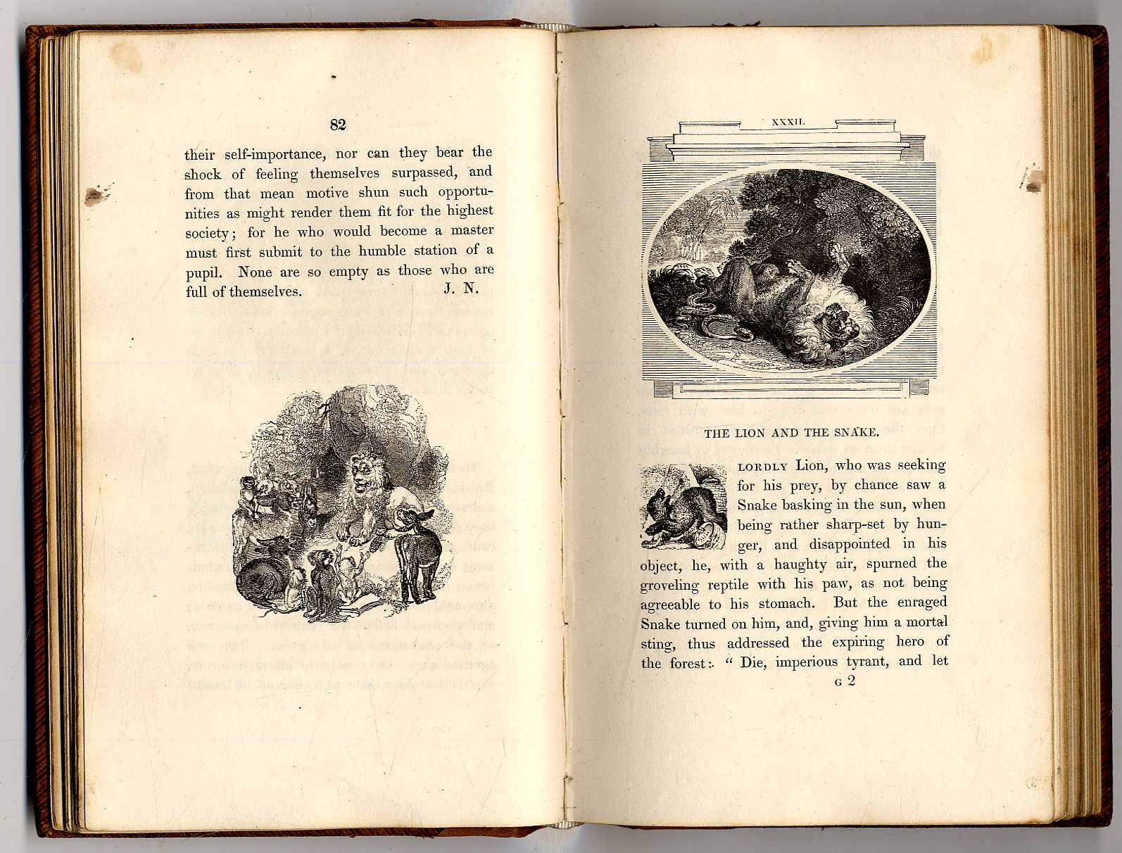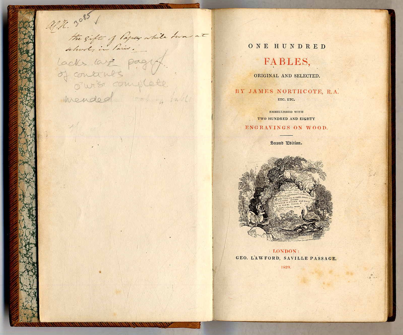 Northcote, James: One hundred fables, original and selected. 2. Auflage. London, Geo. Lawfound, Saville Passage, 1829. Ca. 19 x 12 cm. VIII S., 270 Seiten. Mit 280 Holzschnittillustrationen. Ledereinband der Zeit mit geprägtem Rückenschild. Rücken neu mit Leder hinterlegt. Vorsätze am Falz mit Leinenstreifen verstärkt. Mit Exlibris. es fehlt das letzte Blatt des Inhaltsverzeichnsses. Handschriftlicher Eintrag auf Vorsatz. Seiten teils leicht stockfleckig. Hübsch illustriert mit zahlreichen Holzschnitten im Text und als Schmuckinitialen. Text auf englisch.