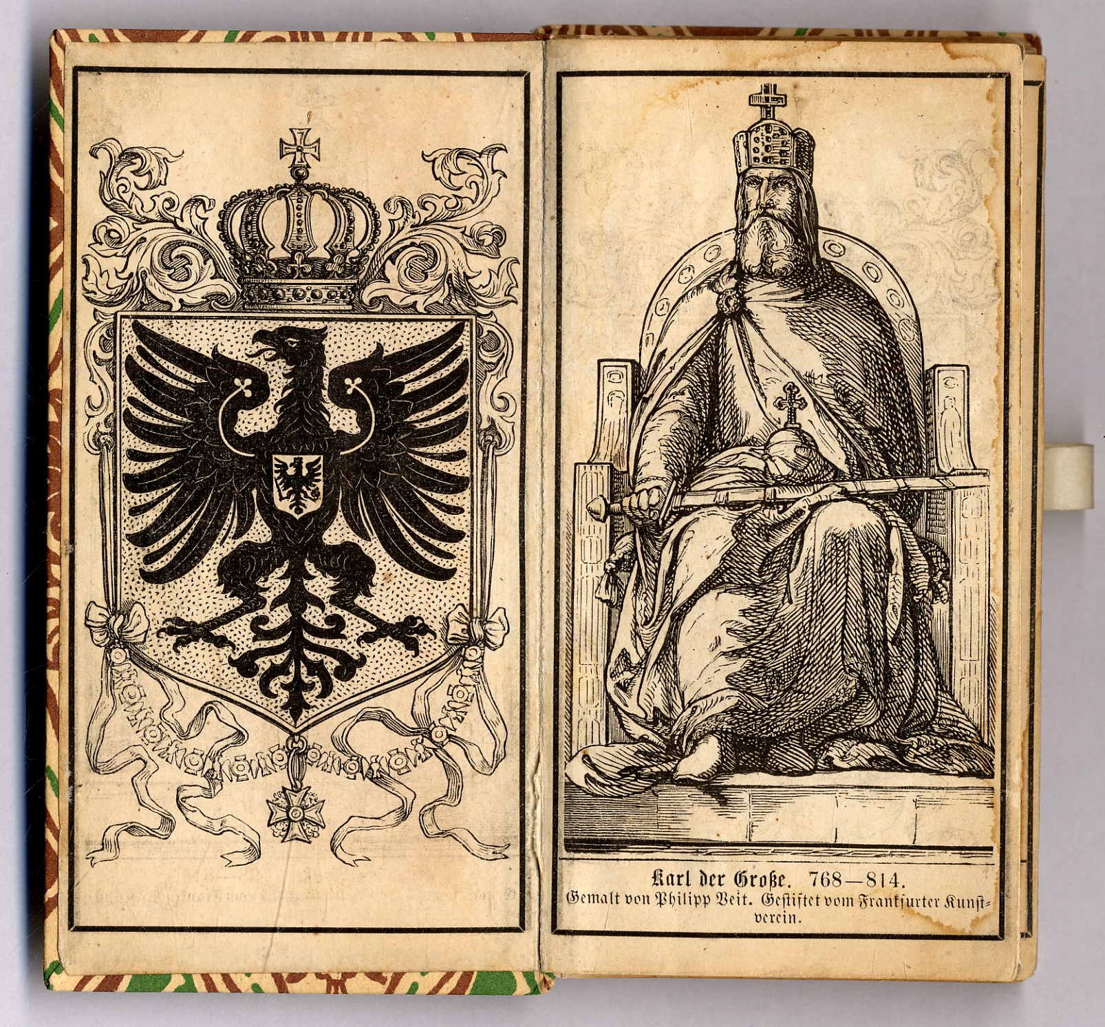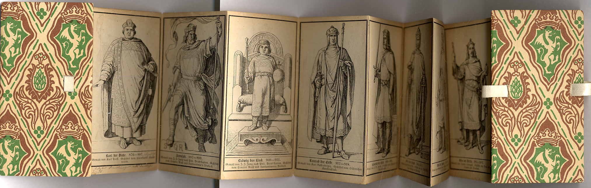 [Die Deutschen Kaiser im Römer zu Frankfurt a. M. und Kaiser Wilhelm I.} Leporello mit 55 ganzseitigen Holzschnitten. Frankfurt, Georg Wiegand’s Verlag, ca. 1871. Ca. 12,5 x 6,5 cm. Dekorativer Pappband (20. Jhdt). Dieses Leporello zeigt in chronologischer Reihenfolge die bildliche Darstellung aller deutschen Kaiser, von Karl dem Großen bis Franz II., angelehnt an die Kaiserporträts im Großen Saal des Frankfurter Rathauses. Wilhelm I. wurde am Schluss ebenfalls hinzugefügt. Jedes Bild mit kleiner Legende am unteren Rand. Am Anfang und Schluss jeweils ein ganzseitiger Wappenholzschnitt, kein Titelblatt.