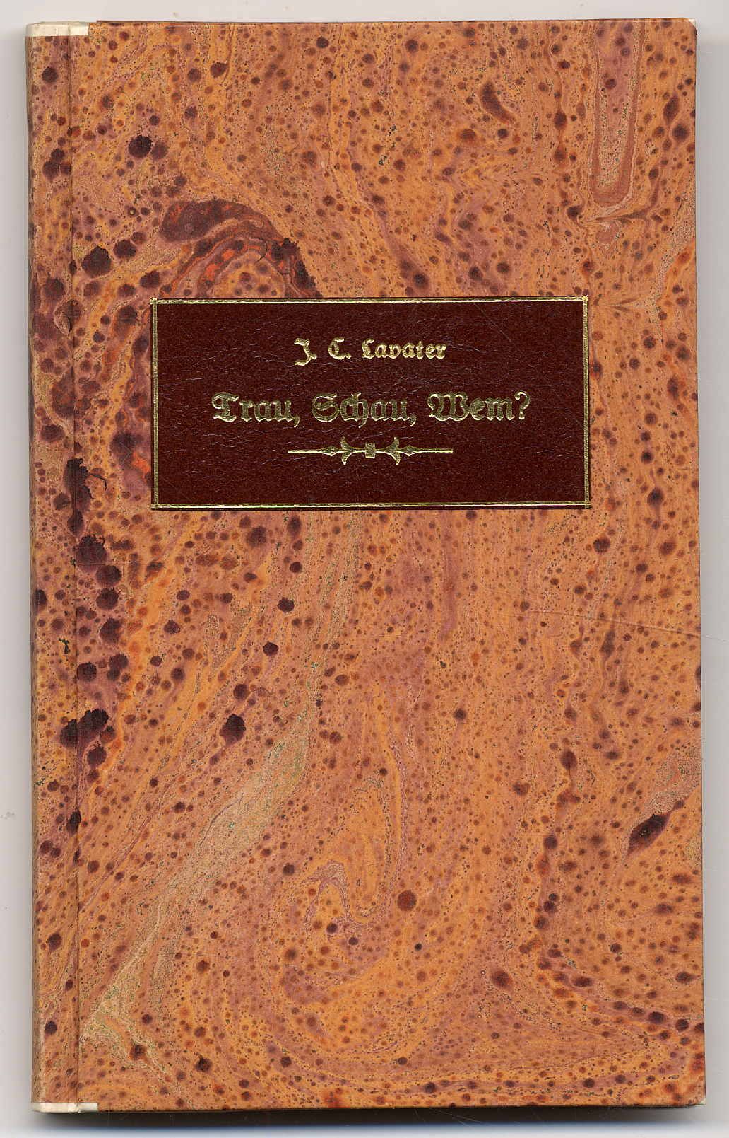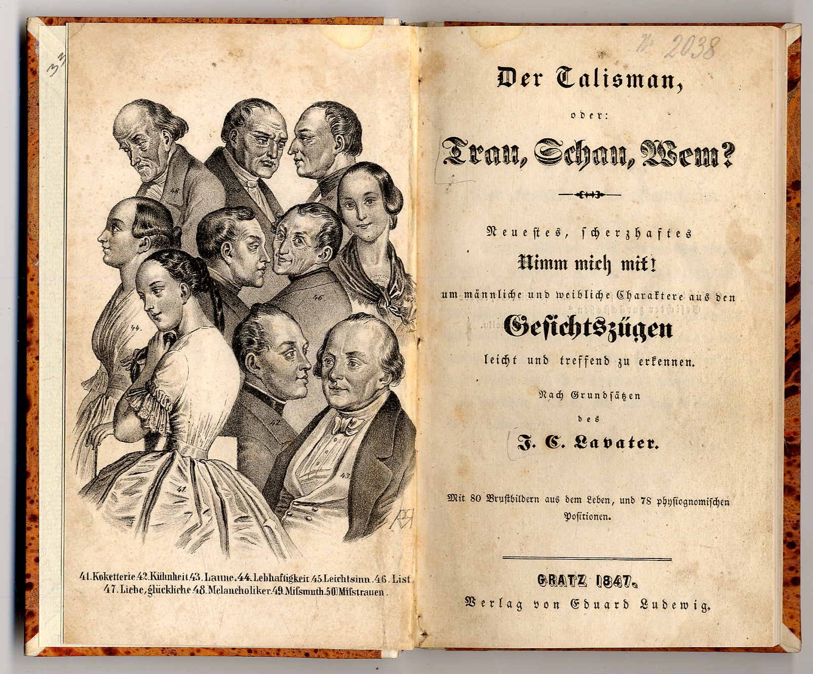 Lavater – Der Talisman oder: Trau, Schau, Wem? Neuestes, scherzhaftes Nimm mich mit! um männliche und weibliche Charaktere aus den Gesichtszügen leicht und treffend zu erkennen. Nach Grundsätzen des J. C. Lavater. Gratz (Graz), Eduard Ludewig, 1847. Ca. 18 x 11 cm. 96 S., (4) Seiten Verlagswerbung. Mit 80 Brustbildern aus dem Leben und 78 phsiognomischen Positionen auf 8 lithographierten tafeln. Moderner Pappband mit geprägtem Deckelschild. Etwas stockfleckig, jedoch gutes Exemplar. Aus dem Inhalt u.a.: Wie sind Gesichts-Arten zu bestimmen?; Wie unterscheiden sich beide Geschlechter?; Wie ist die Ähnlichkeit zwischen Eltern und Kindern zu bestimmen?; Wie erklärt Lavater einzelne Theile des menschlichen Körpers?; Wie sind die Geheimnisse der Hand zu enthüllen?.