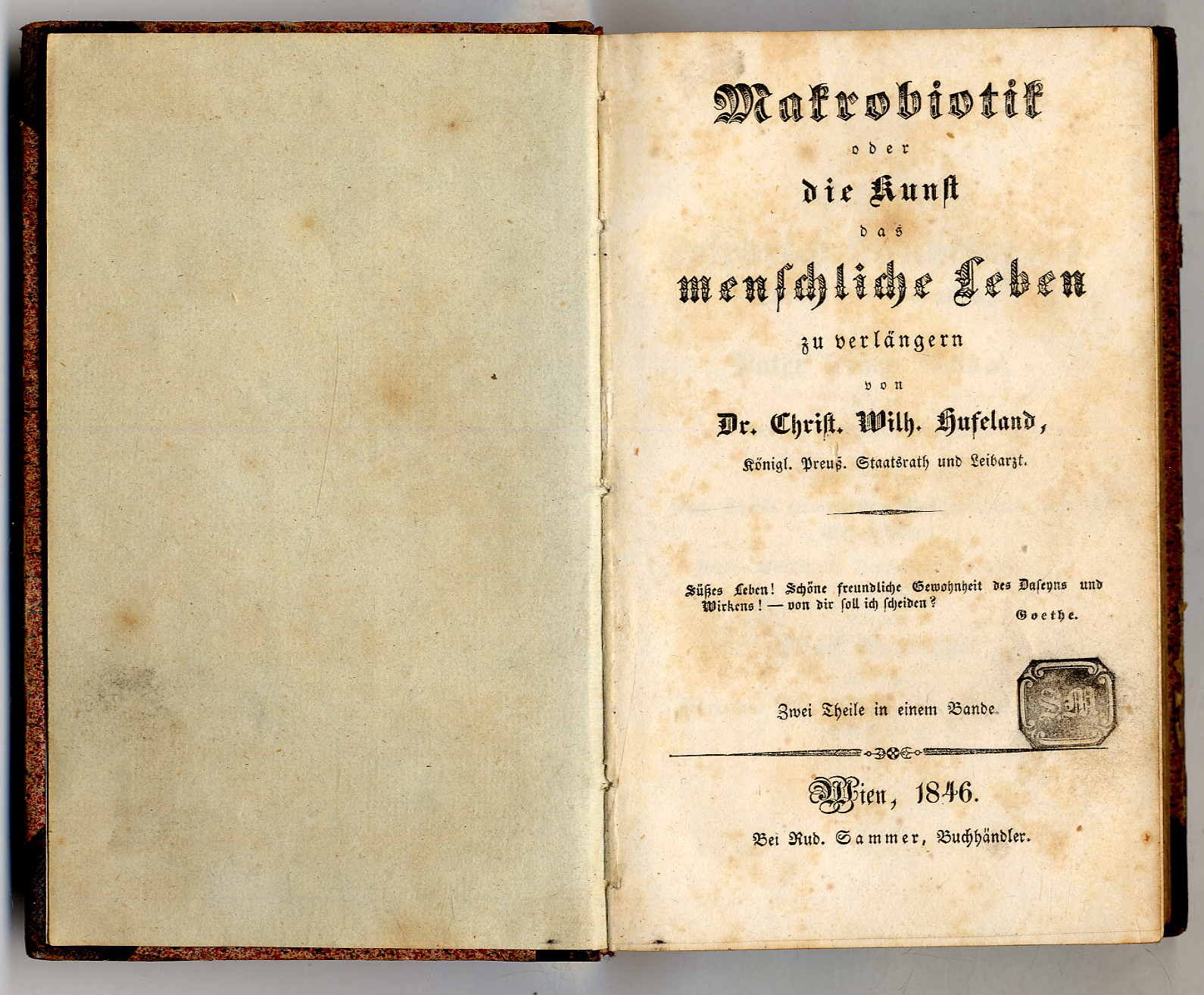 Hufeland, Chr[istoph] Wilh[elm]: Makrobiotik oder die Kunst das menschliche Leben zu verlängern. Wien, Rud. Sammer, 1846. Ca. 17,5 x 11 cm. XVI S., (2) S., 274 Seiten. Halblederband der Zeit mit reicher Rückengoldprägung. Theoretischer Theil und Practischer Theil. Seiten stockfleckig.