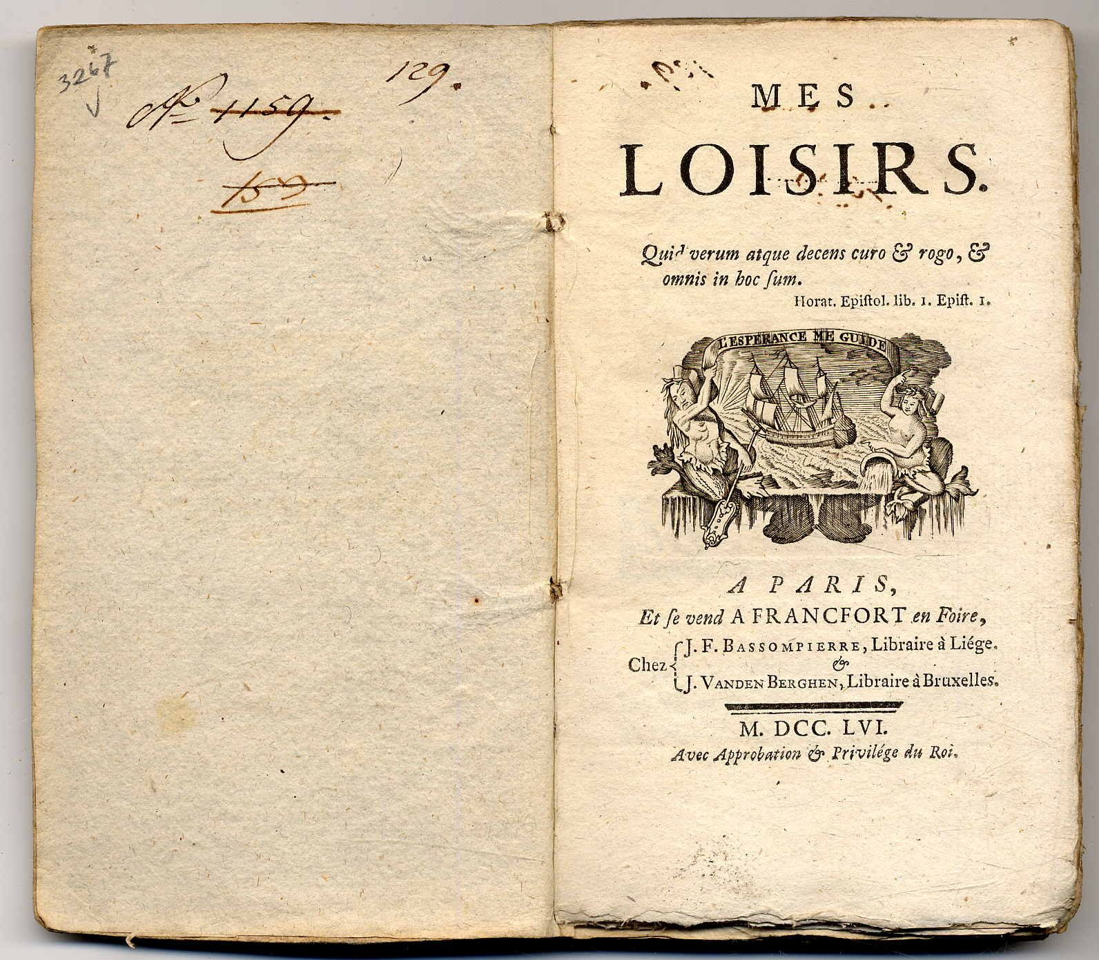 [Arcq, Philippe-Auguste de Sainte-Foy Chevalier d’]; Mes .. Loisirs. Paris, J. F. Bassompierre, 1756. Ca. 16 x 9,5 cm. XVIII S., 143 S., (5) Seiten. Mit Holzschnitt-Titelvignette. Einfacher Pappband der Zeit. Druckvermerk: A Paris, Et se vend a Francfort en Foire, chez J. F. Bassompierre, Librarire à Liége; J. Vanden Berghen, Libraire à Bruxelles. Chevalier d’Arcq (1721-1795, französischer Offizier und Schrifsteller). Text auf französisch. Unbeschnittenes, breitrandiges Exemplar.