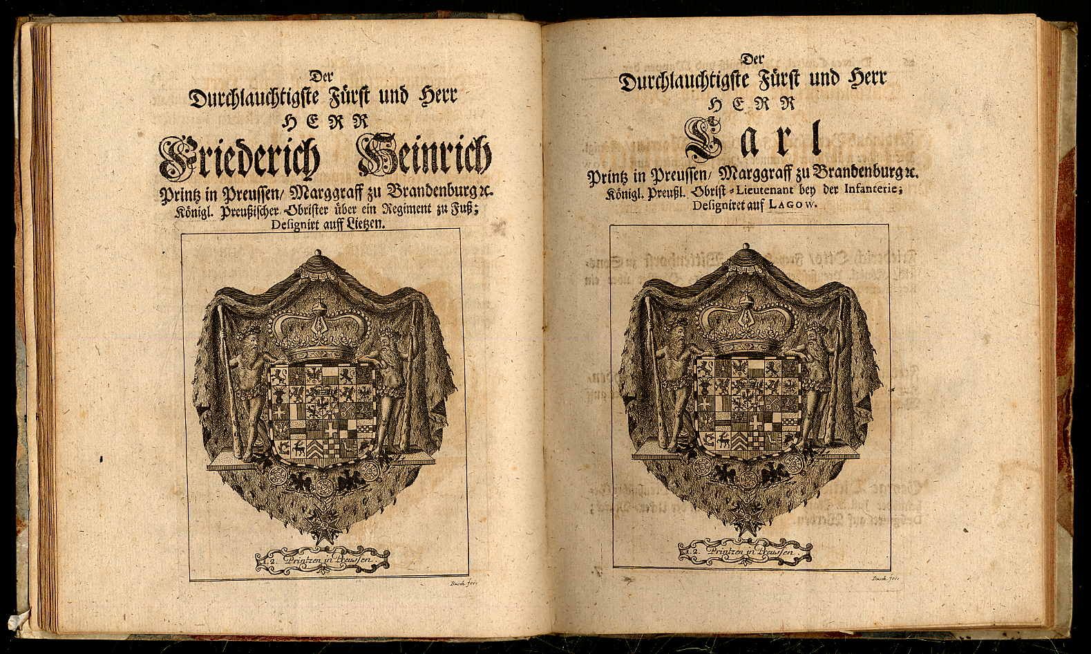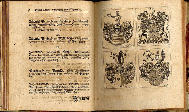 Dithmar, Justus Christoph: Geschichte Des Ritterlichen Johanniter-Orden Und dessen Herren-Meisterthums In der Marck/ Sachsen/ Pommern und Wendland. Worinn des am VII. April dieses Jahrs gehaltenen Ritter-Schlags Solennitaeten Verzeichniß der investirten Ritter und derselben Stamm-Wappen wie auch Ursprung des Ritterschlagens und Ritterlichen Orden Anmerckungen von Ordens-Creutz Herrn Abt de Vertot ins Teutsche übersetzte Dissertation vom alten und neuen Gouvernement des Johanniter-Ordens enthalten und beschrieben. Franckfurth an der Oder, Johann Gottfried Conradi, 1729. Ca. 21 x 17 cm. (14) S., 96 S., (6) Seiten. Mit 2 großen Textkupfern und 51 Wappenabbildungen auf 12 Tafeln. Halbpergamentband der Zeit. VD18 10210415. Kleiner Stempel auf Titelblatt. Die Frontispiz-Tafel „Vom Ritterlichen Ordens-Creutz“ ist beim Text vor Seite 37 eingebunden. Dithmar (1678-1737, Kameralist), wirkte neben seiner Professur in Frankfurt/Oder als Rat des Johanniterordens für die nahegelegene Kommende Sonnenburg und war Mitglied der königlichen Gesellschaft der Wissenschaften in Berlin. (Heinrich Grimm, NDB 3, S. 746). Gutes Exemplar.