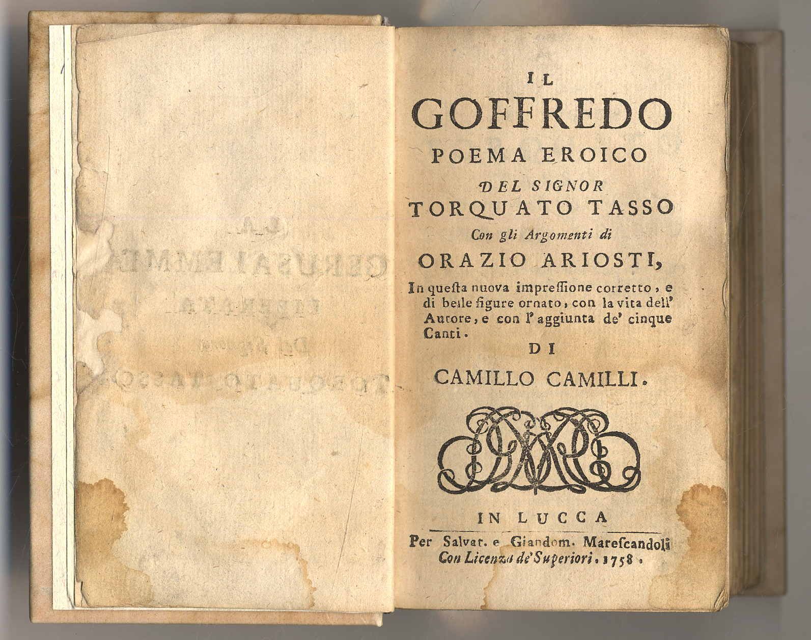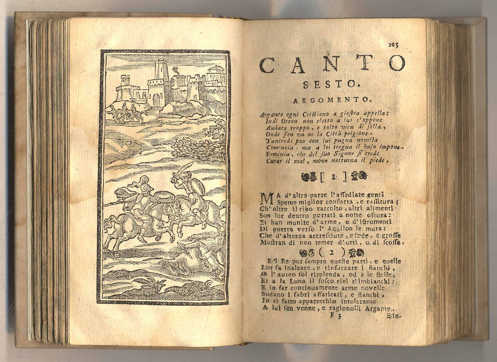 Tasso, Torquato: Il Goffredo, poema eroico del signor Torquato Tasso ; con gli argomenti di Orazio Ariosti. In questa nuova impressione corretto e di belle figure ornato, con la vita dell’ autore e con l’aggiunta de’ Cinque canti di Camillo Camilli. Lucca, Salvar. e Giandom. Marescandoli, 1758. Ca. 13,5 x 8,5 cm. 663 Seiten. Mit 20 ganzseitigen Kupferstichen. Moderner Pergamentband mit geprägtem Rückenschild. Dekorative Ausgabe mit Holzschnitt-Illustrationen zu ausgewählten, zentralen Szenen und einem Lebenslauf des Dichters. Vortitel: „La Gerusalemme liberata del signore Torquato Tasso.“ Vorsätze erneuert. Seiten teils etwas fleckig. In italienischer Sprache.