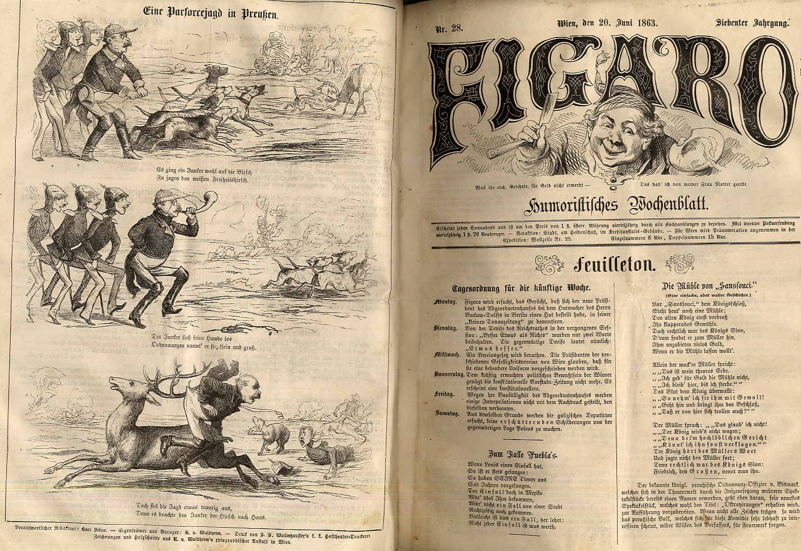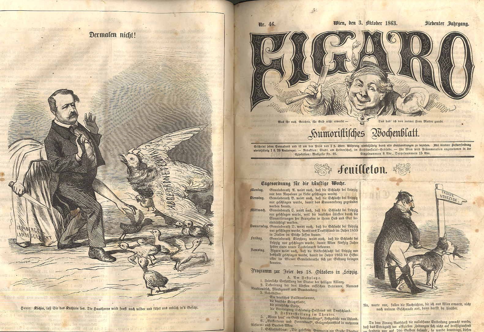 Sitter, Karl (Redakteur): Figaro. Humoristisches Wochenblatt. 7. Jahrgang 1863. 60 Hefte 3. Jänner 1863 bis 26. Dezember 1863. Wien, R. v. Waldheim, 1863. Ca. 31,5 x 24,5 cm. Je Heft 4 Seiten. Mit zahlreichen Holzstich-Illustrationen. Halbleinenband der Zeit. Seiten teils stockfleckig bzw. einige auch mit braunen Flecken, teils etwas knitterfaltig, 3 Blätter mit hinterlegten Fehlstellen. U.a.: Ein astronomischer Maskenball; Kleine Lügenzeitung; Eine Nummer des „russischen Invaliden“; Aus der Mitte des Reiches der Mitte; Die Bismarckischen Reformakte; Eine Parforcejagd in Preußen.