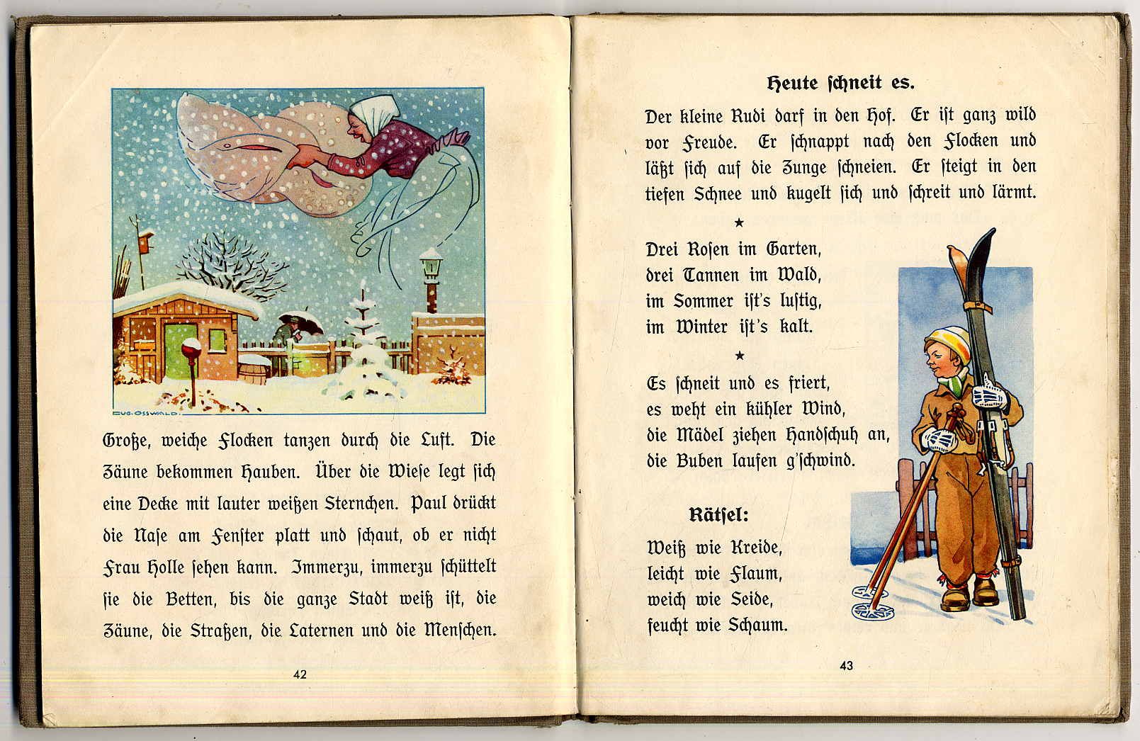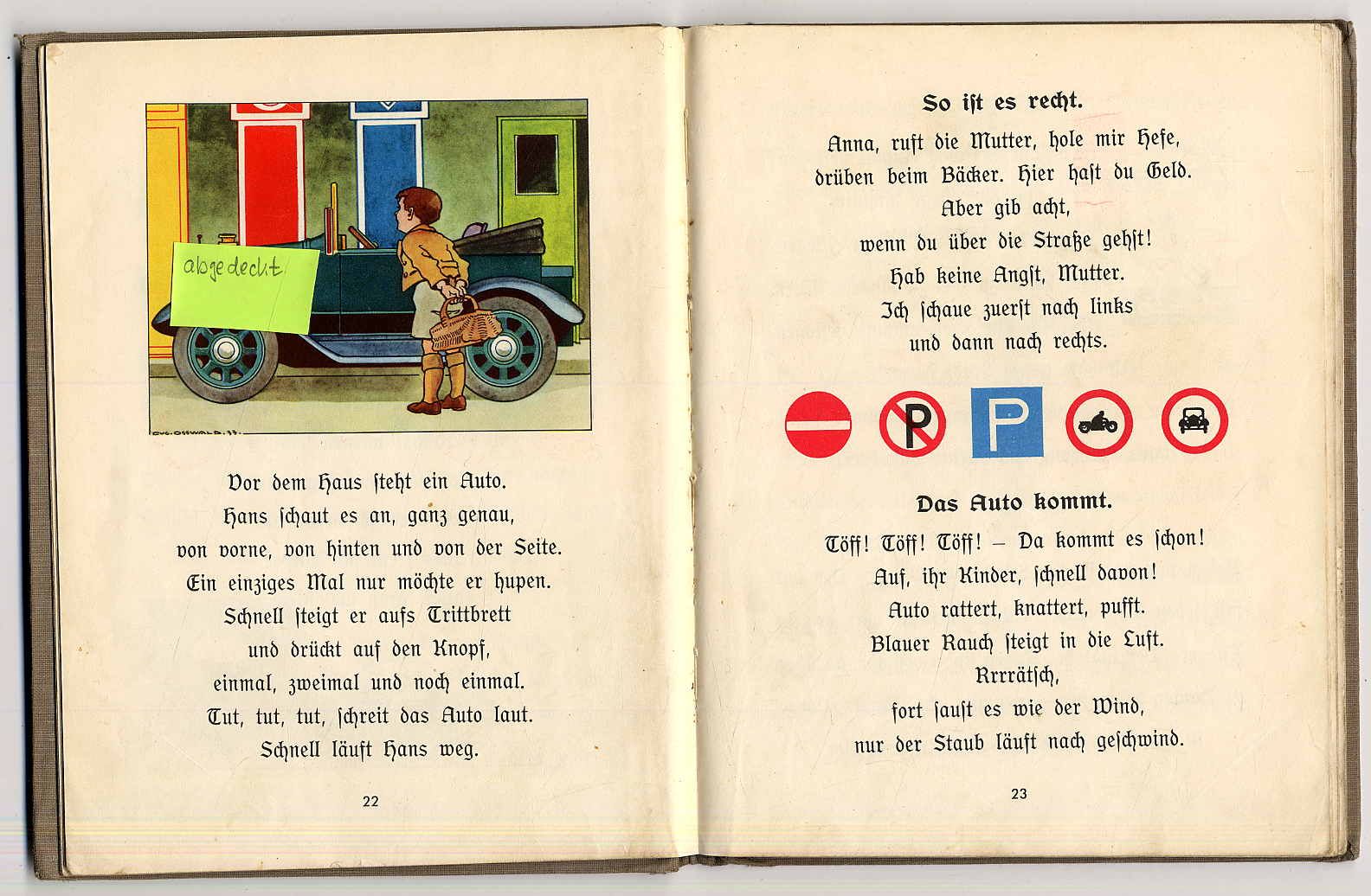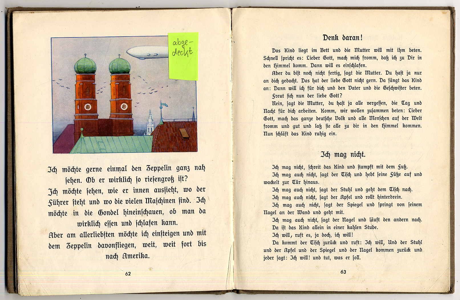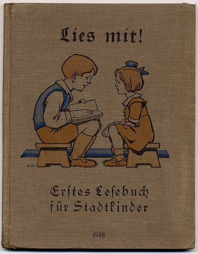 Lies mit! Erstes Lesebuch für Stadtkinder. Bearbeitet von Münchener und Augsburger Lehrern und Lehrerinnen. Frankfurt a.M., Moritz Diesterweg, 1937. Ca. 23 x 17,5 cm. 82 S., (2) Seiten. Mit teils farbigem Buchschmuck von Eugen Oßwald. Farbig illustr. Orig.-Leinenband. Teistler 2664.3. Seiten etwas fingerfleckig. Nationalsozialistisch ideologisch geprägtes erstes Lesebuch: Gleich auf der ersten Seite eine Fotografie Hoffmanns von Hitler mit einem Mädchen, danach Kinder beim Spielen aber sofort gefolgt von Fahnenappellen und Aufmärschen. Auch zahlreiche Alltagsszenen (aber selbst dort hat das vor dem Haus stehende Auto eine Hakenkreuzfahne), Gedichte, Rätsel und Märchen. Beim Gebet bittet man um den Segen für die „Führer“ und das Vaterland. Ein Bild zeigt einen Zeppelin über München.
