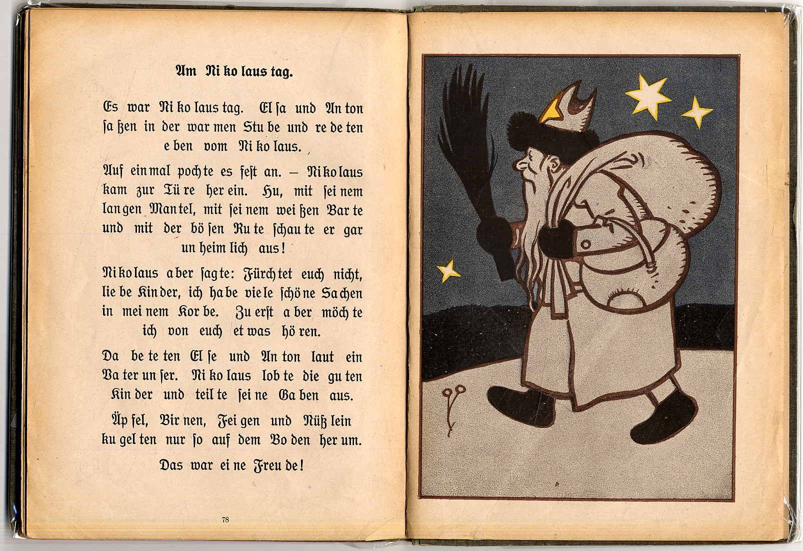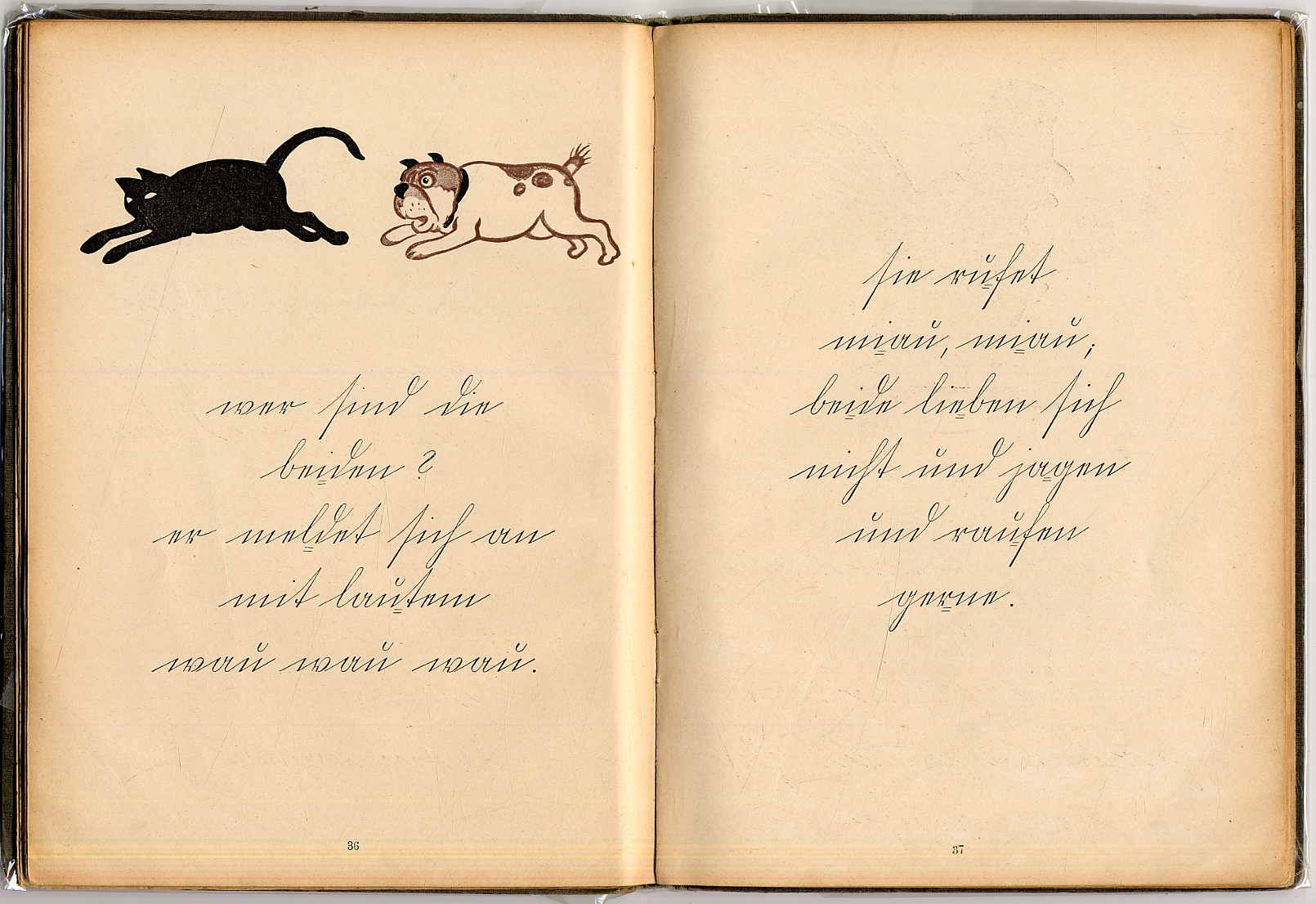 Münchener Fibel. Erstes Lesebuch für die Volksschulen Münchens. Hrsgg. im Auftrage der Lokalschulkommission. 2. Auflage. München, Carl Schnell, [1906]. Ca. 22,5 x 15,5 cm. 78 S., (2) Seiten. Mit farbigen Illustrationen von Adolf Hengeler. Orig.-Halbleinenband. Besitzvermerk auf Innendeckel und Titelblatt. Seiten papierbedingt etwas gebräunt, teils mit kleinen hinterlegten Randeinrissen. Teistler 2423.1; May/Schweitzer 97: ‚Die schwungvollen Fibelillustrationen Adolf Hengelers haben mit der ‘Ästhetik des Jugendstils, wie er in den Fibeln der Zeit vorherrscht, gebrochen. Hengeler knüpft an eine andere Tradition an: vor allem will er lustig sein, die Kinder zum Lachen bringen.’ Der von Hengeler illustrierten Einband zeigt das Münchner Kindl.