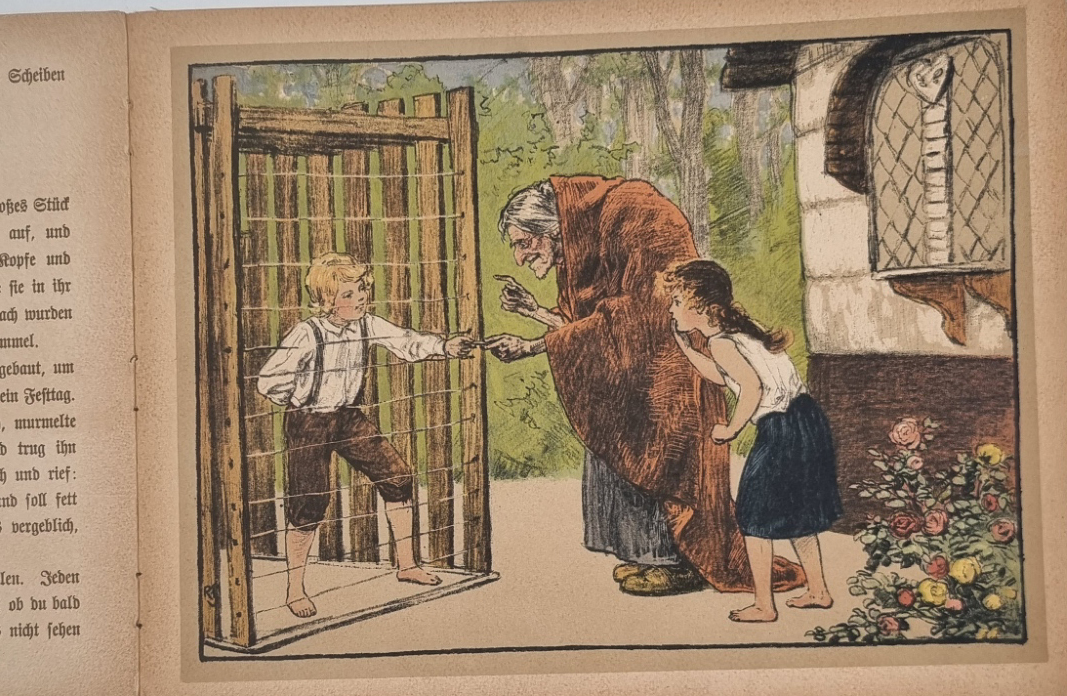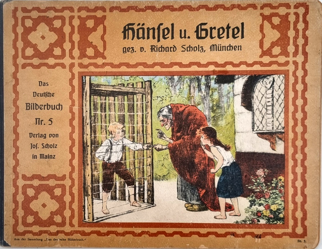 [Grimm, Gebr.]: Hänsel & Gretel. Das deutsche Bilderbuch Seire A: Märchen Nr. 5. Mainz, Jos. Scholz, [1905]. Querformat, ca. 22,5 x 29,5 cm. (16) Seiten mit farbig illustriertem Titelblatt, Textillustrationen und 8 ganzseitigen farbigen Bildern (Algraphien) von Richard Scholz. Farbig illustr. Orig.-Halbleinenband. Ries 864,2; Ries „Das deutsche Bilderbuch“ S. 126 ff. (Ries). Vorderdeckel: Geometrisches Muster mit Illustration. Vorsatz mit Paradiesvogel-Motiv. Einband leicht berieben, Kanten etwas bestoßen. Buchblock leicht gelockert. Seitenränder papierbedingt gebräunt. Titelblatt mit Widmung und Besitzvermerk.