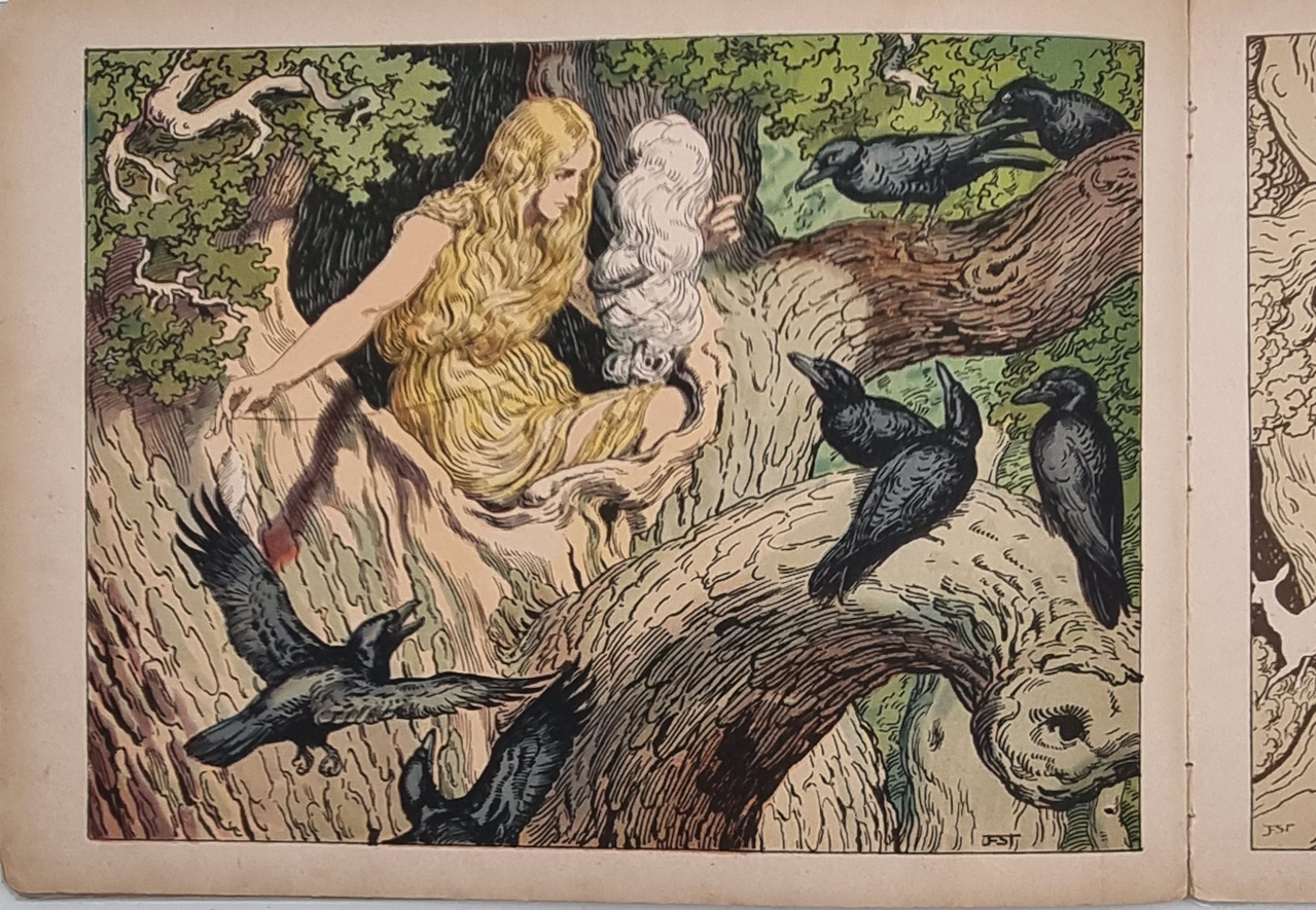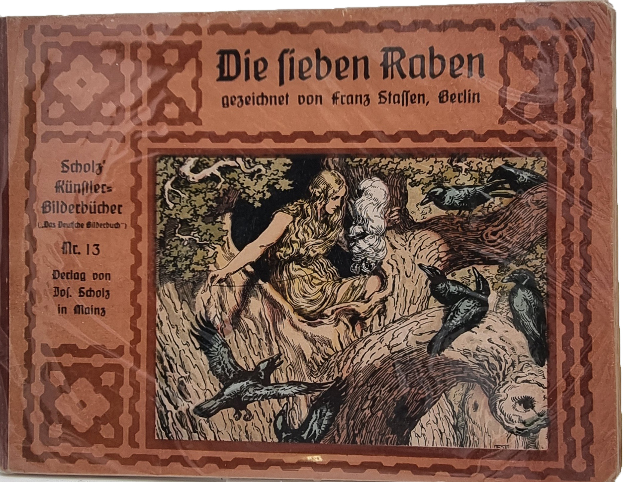 [Grimm, Gebr.]: Die sieben Raben. Scholz’ Künstler-Bilderbücher (″Das Deutsche Bilderbuch“), Nr. 13. Mainz, Jos. Scholz, ca. 1922. Querformat, ca. 22,5 x 29,5 cm. (16) Seiten mit farbig illustriertem Titelblatt, Textillustrationen und 8 ganzseitigen farbigen Bildern (Algraphien) von Franz Stassen. Farbig illustr. Orig.-Halbleinenband. Ries 864,2; Ries „Das deutsche Bilderbuch“ S. 126 ff. (Ries). Vorderdeckel: Geometrisches Muster mit Illustration. Vorsatz mit Hirschkäfer unter Blüten und Blättern. Einbandkanten etwas bestoßen. Buchblock leicht gelockert, Klammerung minimal angerostet. Seitenränder papierbedingt leicht gebräunt.