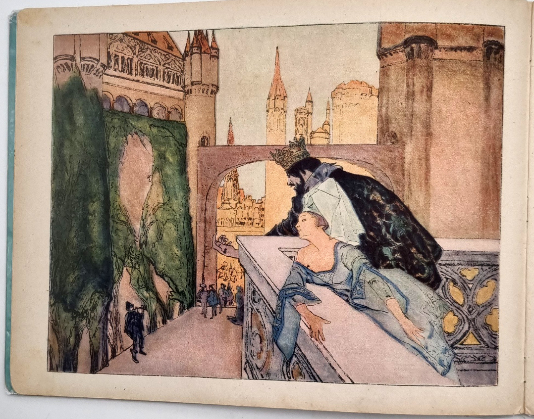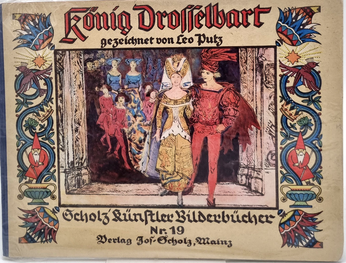 [Grimm, Gebr.]: König Drosselbart. Scholz’ Künstler-Bilderbücher Nr. 19. Mainz, Jos. Scholz, ca. 1927. Querformat, ca. 22,5 x 29,5 cm. (16) Seiten mit farbig illustriertem Titelblatt, Textillustrationen und 8 ganzseitigen farbigen Bildern (Algraphien) von Leo Putz. Farbig illustr. Orig.-Halbleinenband. Erste Ausgabe. Ries 864,2; Ries „Das deutsche Bilderbuch“ S. 126 ff. Vorderdeckel: Vertikale Leisten mit Zauberer, Krone, Vogel und Farbillustration. Innendeckel: Blumenkörbchen mit verschiedenen Motiven. Namenszug auf Titelblatt. Seitenränder leicht fingerfleckig. Eines der seltensten Bände der Märchenreihe.