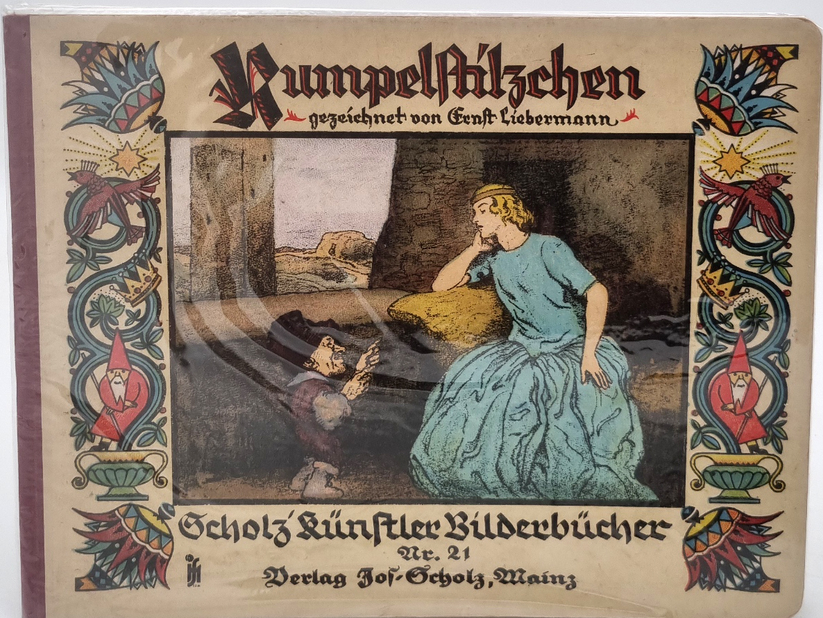 Grimm – Rumpelstilzchen. Scholz’ Künstler-Bilderbücher Nr. 21. Mainz, Jos. Scholz, [1929]. Ca. 22 x 28,5 cm. (16) Seiten mit farbig illustriertem Titelblatt, Textillustrationen und 8 ganzseitigen farbigen Bildern (Algraphien) von Ernst Liebermann. Farbig illustr. Orig.-Halbleinenband. Erste Ausgabe. Ries 864,2; Ries „Das deutsche Bilderbuch“ S. 126 ff. Vorderdeckel: Vertikale Leisten mit Zauberer, Krone, Vogel und Farbillustration. Vorsatz Blumenkörbchen. Einbandkanten etwas bestoßen. Namenszug auf Titelblatt. Seitenränder leicht fingerfleckig. „Ein so unermüdlicher Illustrator wie Ernst Liebermann (1869-1960), der sich über Jahrzehnte hin treu blieb und mit seiner Lithographenhandschrift Landschaftspoesie ebenso wie eine gekonnte figürliche Gestaltung beherrschte, durfte in dieser Reihe nicht fehlen.“ (Hans Ries, Schiefertafel 1980, S. 126 ff).