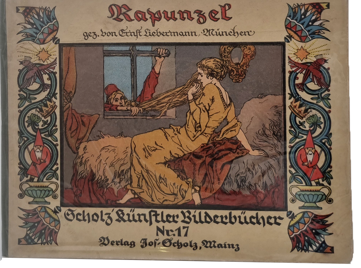 Grimm – Rapunzel Scholz’ Künstler-Bilderbücher Nr. 17. Mainz, Jos. Scholz, ca. 1925. Ca. 22 x 28,5 cm. (16) Seiten mit farbig illustriertem Titelblatt, Textillustrationen und 8 ganzseitigen farbigen Bildern (Algraphien) von Ernst Liebermann. Farbig illustr. Orig.-Halbleinenband. Erste Ausgabe. Ries 864,2; Ries „Das deutsche Bilderbuch“ S. 126 ff. Vorderdeckel: Vertikale Leisten mit Zauberer, Krone, Vogel und Farbillustration. Vorsatz Blumenkörbchen. Einbandkanten etwas bestoßen. „Ein so unermüdlicher Illustrator wie Ernst Liebermann (1869-1960), der sich über Jahrzehnte hin treu blieb und mit seiner Lithographenhandschrift Landschaftspoesie ebenso wie eine gekonnte figürliche Gestaltung beherrschte, durfte in dieser Reihe nicht fehlen.“ (Hans Ries, Schiefertafel 1980, S. 126 ff).