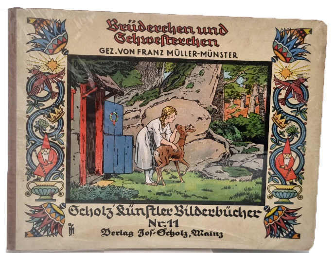 Grimm – Brüderchen u. Schwesterchen. Scholz’ Künstler-Bilderbücher Nr. 11. Mainz, Jos. Scholz, ca. 1926. Ca. 22 x 28,5 cm. (16) Seiten mit farbig illustriertem Titelblatt, Textillustrationen und 8 ganzseitigen farbigen Bildern (Algraphien) von Franz Müller-Münster. Farbig illustr. Orig.-Halbleinenband. Erste Ausgabe. Ries 864,2; Ries „Das deutsche Bilderbuch“ S. 126 ff. Vorderdeckel: Vertikale Leisten mit Zauberer, Krone, Vogel und Farbillustration. Vorsatz Blumenkörbchen. Einbandkanten etwas bestoßen. Namenszug auf Titelblatt. Seitenränder etwas fingerfleckig.