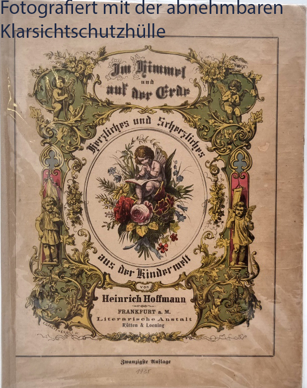 Hoffmann, Heinrich: Im Himmel und auf der Erde. Herzliches und Scherzliches aus der Kinderwelt. 20. Auflage. Frankfurt, Literar. Anstalt Rütten & Loening, [1925]. ca. 26 x 22 cm. 26 S. Mit farbigen Illustrationen. Orig.-Pappband. Vgl. Bilderwelt 312 (19. Aufl. um 1923). Rücken und Innendeckel erneuert. Am Falz mit Papier verstärkt. Seiten minimal fingerfleckig.