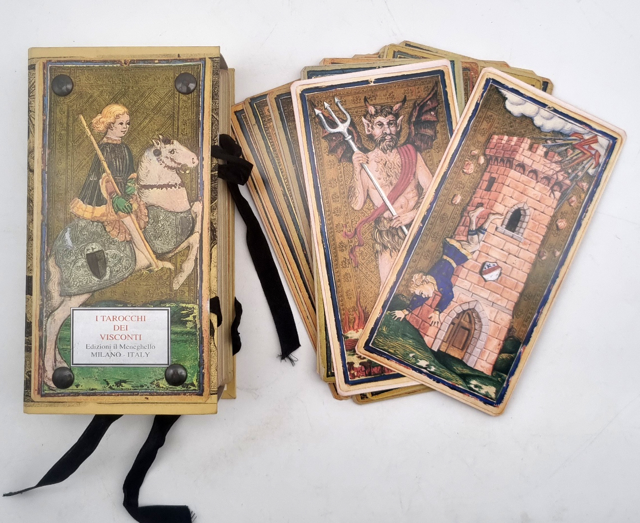 I tarocchi del visconti sforza. Milkano, Edizioni il Meneghello, 1996. Ca. 18 x 9,5 cm. 78 farbige Tarot-Karten. In illustrierter Original-Papphülle mit Bindebändchen. Ohne das Begleitheft. Nachdruck der Karten ca. 1450. XL-Edition mit großen Karten.