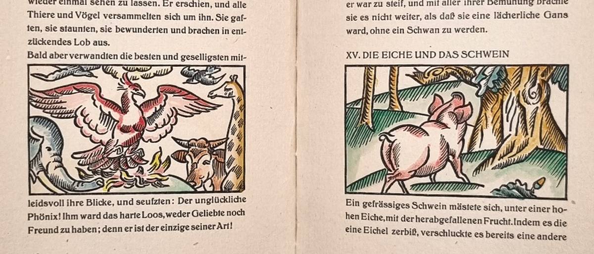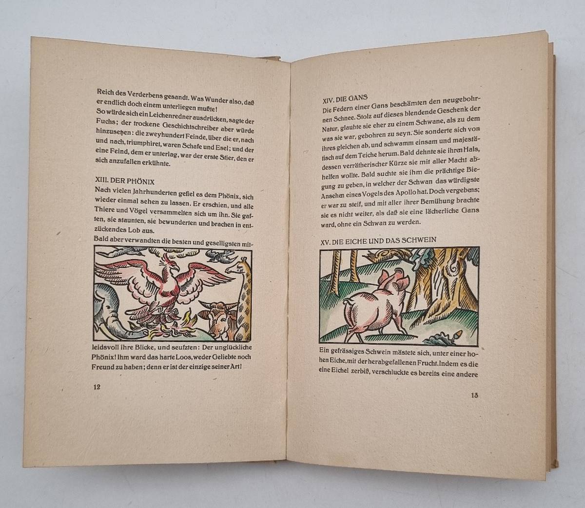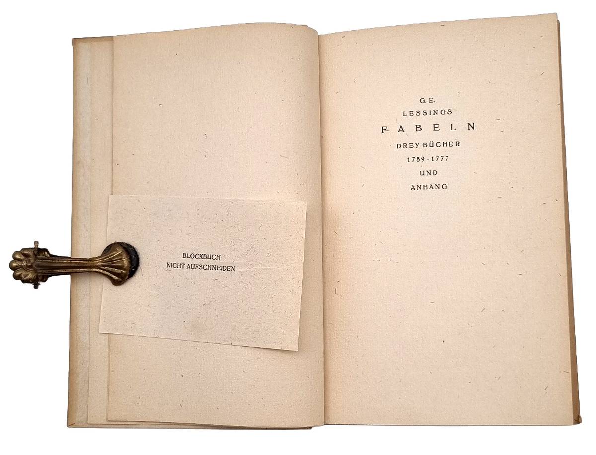 Lessing, G[otthold] E[phraim]: Fabeln. Drey Bücher 1759-177 und Anhang. Darmstadt, Kleukens-Presses, 1920. Ca. 19,5 x 13 cm. 71 S., (4) Seiten. Mit 22 handcolorierten Holzschnitten von Kay Nebel. Orig.-Pappband. Sechster Druck der Kleukens-Presse. Als Blockbuch gebunden, mit dem entsprechendem Einlegezettel „Blockbuch nicht aufschneiden“. Exemplar 238/250. Rodenberg 104. Rücken etwas bestoßen. Einband gebräunt.