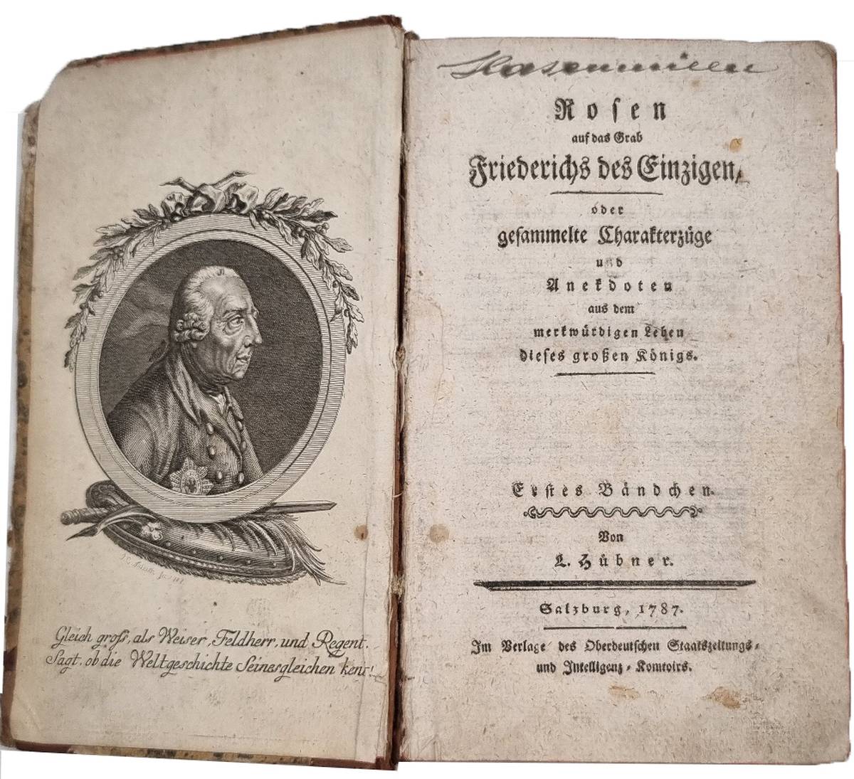Hübner, L[orenz]: Rosen auf das Grab Friederichs des Einzigen, oder gesammelte Chrakterzüge und Anekdoten aus dem merkwürdigen Leben dieses großen Königs. 2 Bände in einem Band. Salzburg, Im Verlage des Oberdeutschen Staatszeitung- und Intelligenz-Komtoirs, 1787. Ca. 19,5 x 12 cm. Kupfer-Frontispiz (Porträt Friedrich II. von J. C. Schleich) 286 Seiten; 286 Seiten. Halblederband der Zeit mit geprägtem Rückentitel. Einband berieben und Kanten stärker bestoßen. Buchblock etwas gelockert. Hinteres Vorsatzblatt fehlt. Namenszug auf Titelblatt. Titelblatt zu Band 2 mit kleiner Fehlstelle im weißen Rand. Seiten teils am Rand leicht fingerfleckig. Erste Ausgabe, selten. Enthält auch zahlreiche Briefe Friedrichs II. (Friedrich der Große 1712-1786). L. Hübner (1753-1807, Gelehrter, Publizist und Topograph), stammte aus Donauwörth, war Jesuit und empfing 1774 die Priesterweihe.