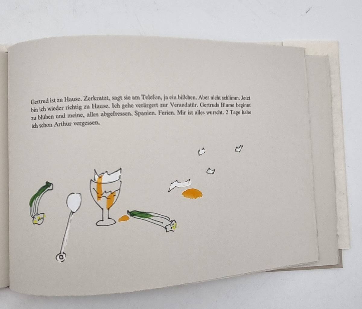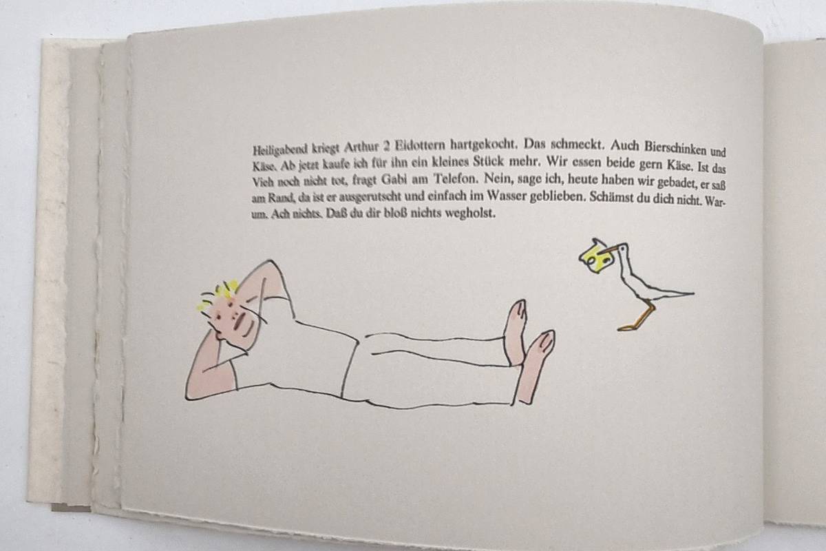 Künstlerbuch – Schleef, Einar: Arthur. Berlin, Edition Mariannenpresse, 1985. Querformat, ca. 19,5 x 28,5 cm. (40) Seiten. Mit 10 aquarellierten, teils gouachierten und weiß gehöhten Zeichnungen von Einar Schleef. Orig.-Halbleinenband mit Schutzumschlag. Einmalige Ausgabe in 130 Exemplaren (davon nur 100 für den Handel bestimmt). Im Druckvermerk von Einar Schleef (1944-2001,Theater-Regisseur, Schriftsteller, Bühnenbildner, Maler, Fotograf, Grafiker und Schauspieler) handschriftlich monogrammiert und nummeriert. 26. Ausgabe der Edition Mariannenpresse auf unbeschnittenem Bütten. sehr gutes Exemplar mit Schutzumschlag.