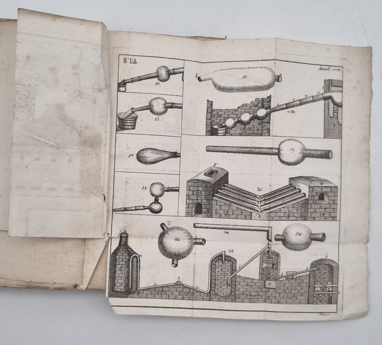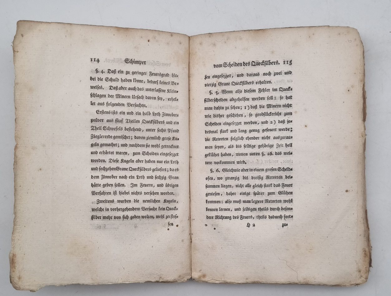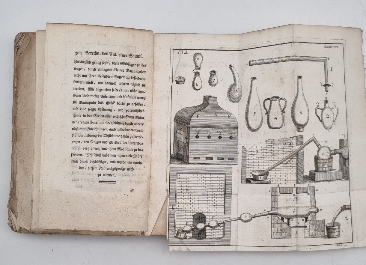 Bemerkungen der Kuhrpfälzischen physikalisch-ökonomischen Gesellschaft vom Jahre 1773. Lauten, Im Verlage der Gesellschaft, 1775. Ca. 18,5 x 13 cm. (8) S., XLVIII S., 304 Seiten. Mit gestochener Titelvignette. Mit einer ausfaltbarer Tafel. Papierumschlag der Zeit (Interimsbroschur). Ein Band des seltenen Periodikums, das 1773 bis 1785 in 16 Bänden erschien und interessante Beiträge aus verschieden Gebieten enthält. In dieser Ausgabe u.a.: Gugenmus: Practischer Beweis der Unfruchtbarkeit ieder Erdart; und ihrer Verbeßerungen; Schimper: Ueber eine bessere Methode das Quecksilber mit geringern Kösten aus seinen Minern zu scheiden, ohne daß so viel von demselben, wie bisher, verlohren gehe (hierzu die Kupferstichtafel); Henop: Ausführliche Nachricht, wie eine zahlreiche Baumschule von guten Obstbäumen nüzlich anzulegen sey. . Unbeschnittenes breitrandiges Exemplar. Rücken mit Fehlstellen im Überzugspapier. Einband- und Seitenränder fleckig und mit kleinen Randeinrissen (im unbedruckten Bereich). Titelblatt mit Bibliotheksstempel (legal ausgeschieden laut Auskunft). Tafel rückseits mit roter Nummer.
